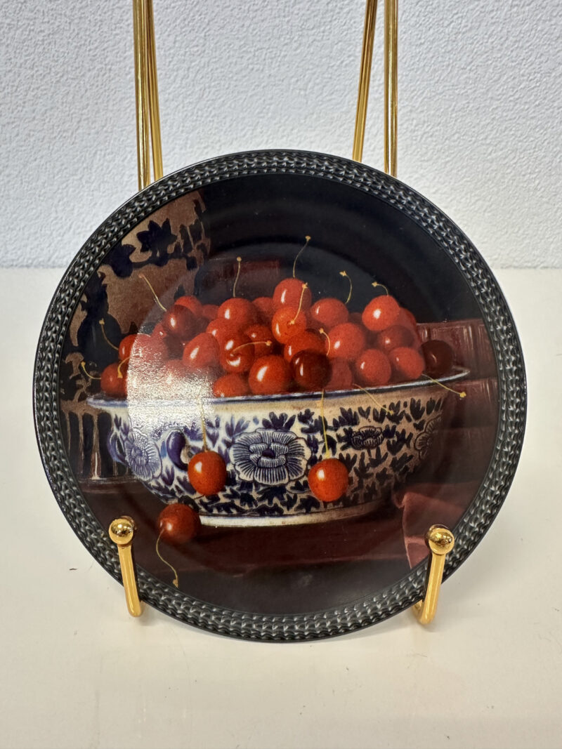 eine kleine, elegante Porzellan-Tortenplatte auf Fuss von Bernardaud Limoges. Das Stillleben zeigt eine volle Schale Kirschen in satten Rottoenen, kombiniert mit dem blau-weissen Dekor der Schale und einem strukturierten Rand. Auf der Unterseite steht die Künstleredition klar drin: Jean-Claude Chauray für Bernardaud Limoges, Motiv «Cerises».