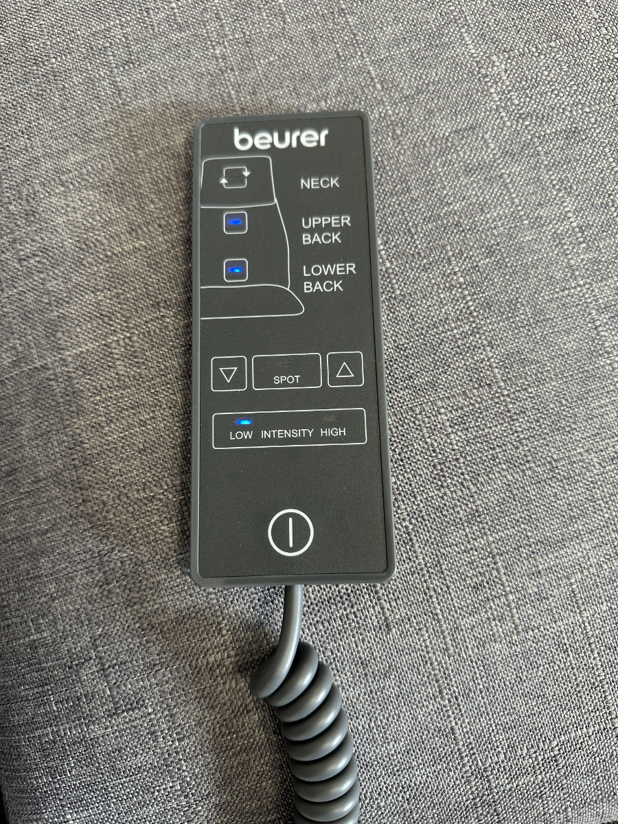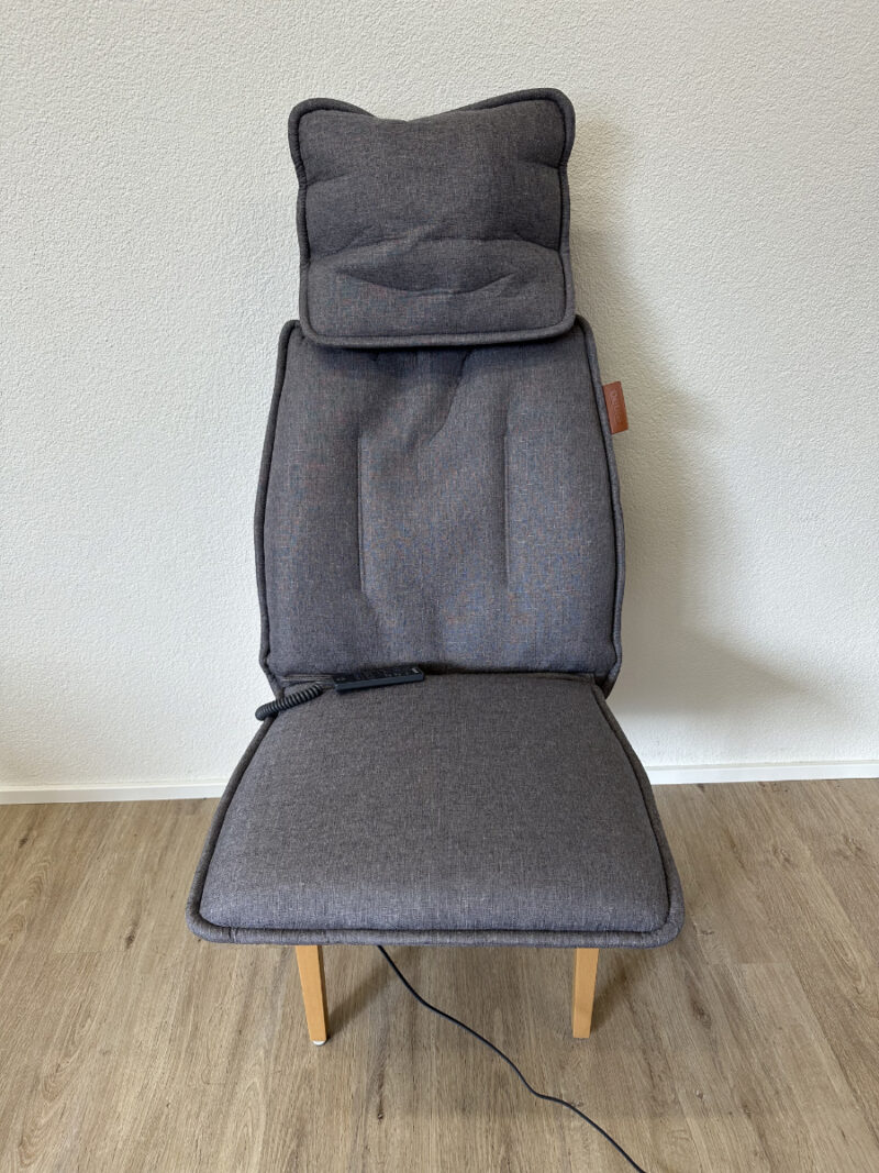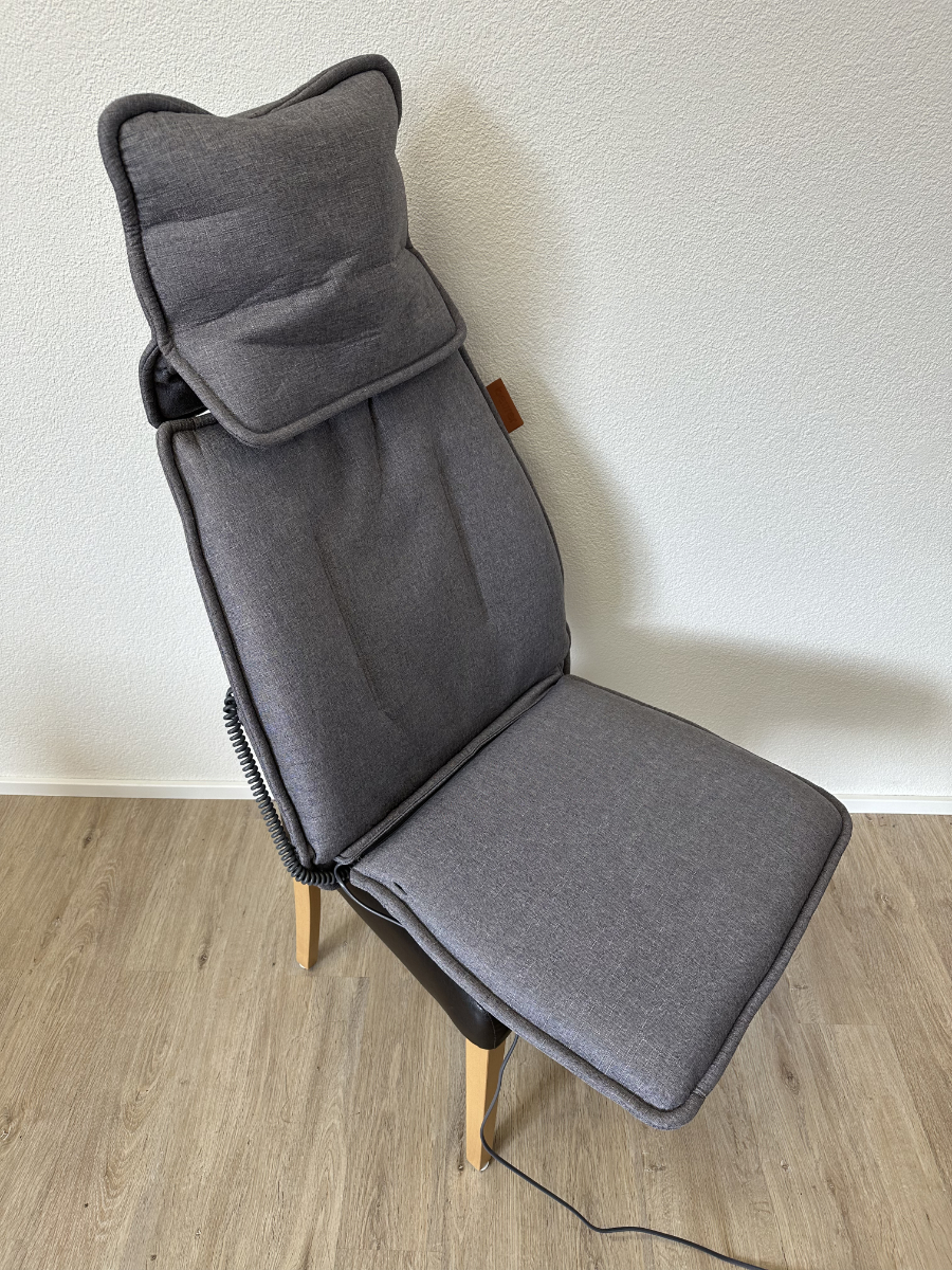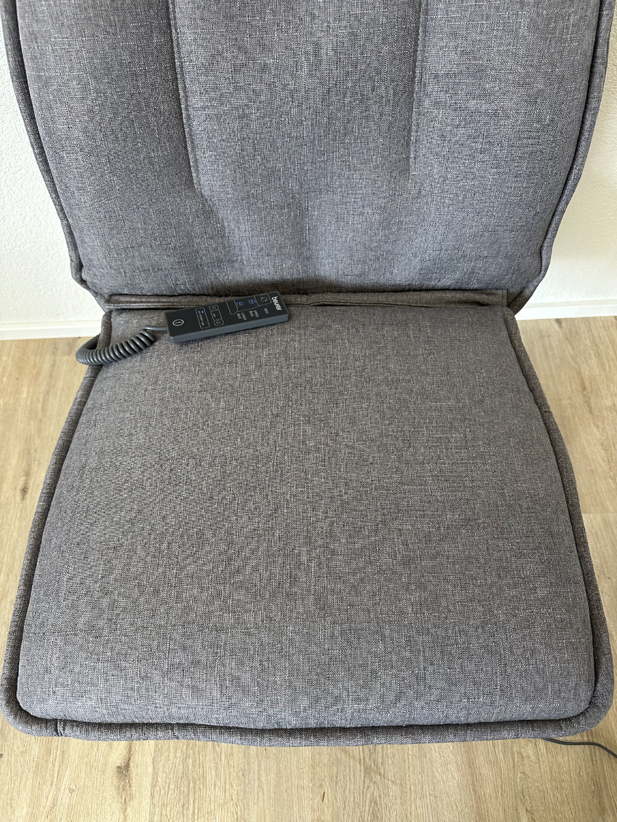 MG330 steht für klare Bedienung und spürbare Entlastung im Alltag. Drei Zonen lassen sich direkt ansteuern: Nacken, oberer Rücken und unterer Rücken. Dazu kommt die Spot Funktion für gezielte Punkte sowie die Intensitätswahl von Low bis High. Die gepolsterte Form mit Kopfbereich sitzt stabil am Stuhl, hinten gibt es eine praktische Tasche für die Fernbedienung.