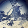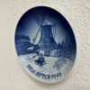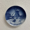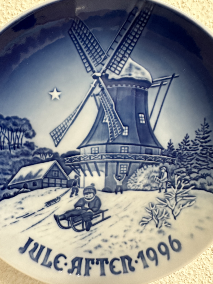 Ein wunderschöner originaler Weihnachtsteller von Bing & Grøndahl / Royal Copenhagen aus Dänemark. Das Motiv zeigt eine verschneite Winterlandschaft mit einer grossen Windmühle im Hintergrund. Im Vordergrund fährt ein Kind mit dem Schlitten, während weitere Figuren durch die winterliche Szene gehen. Das typische tiefe Kobaltblau und die feinen Details wirken im Licht besonders lebendig. Ideal als Sammlerstück oder als festliche Wanddekoration zur Weihnachtszeit.
