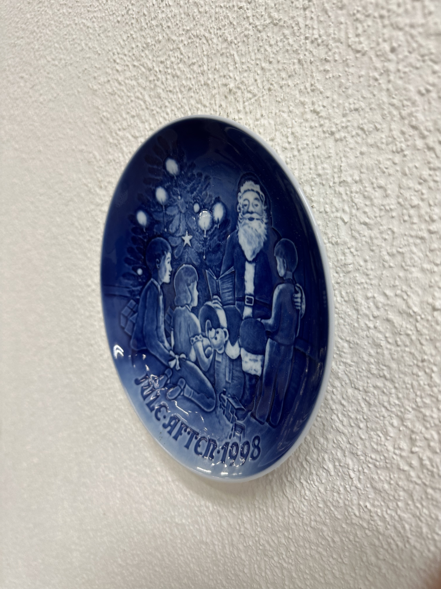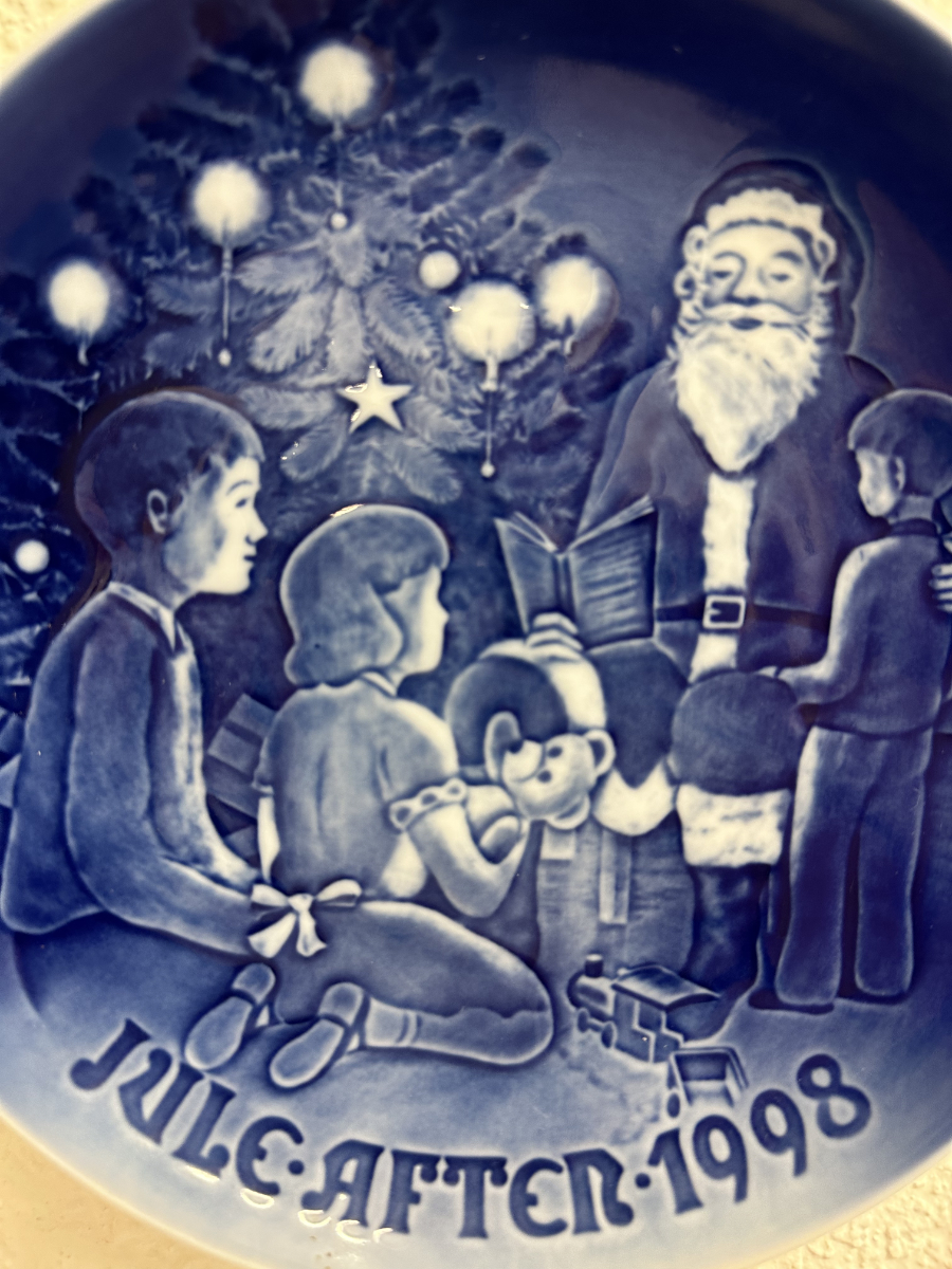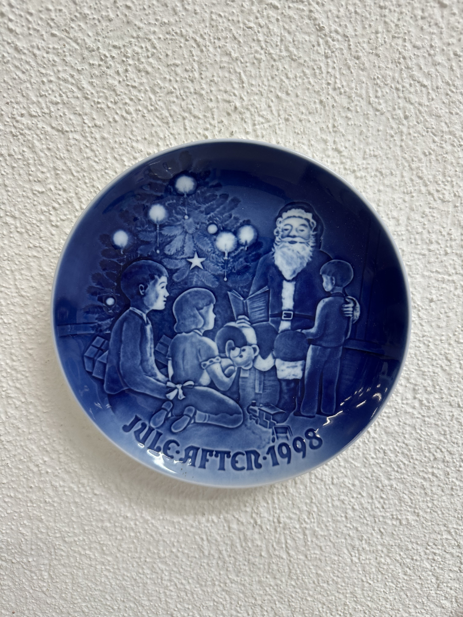 18 cm Durchmesser und ein Motiv, das sofort Weihnachtsstimmung bringt: Der Weihnachtsmann erzählt Geschichten, umgeben von Kindern und Tannenbaum. Das tiefe Kobaltblau mit den hellen Abstufungen wirkt edel und passt perfekt in jede saisonale Dekoration. Auf der Vorderseite ist der Jahrgang 1998 integriert, auf der Rückseite die originale Manufakturmarke von Bing & Grøndahl / Royal Copenhagen.