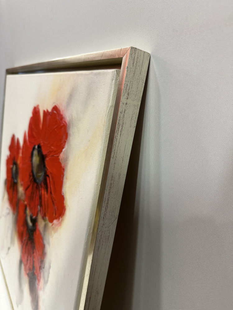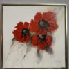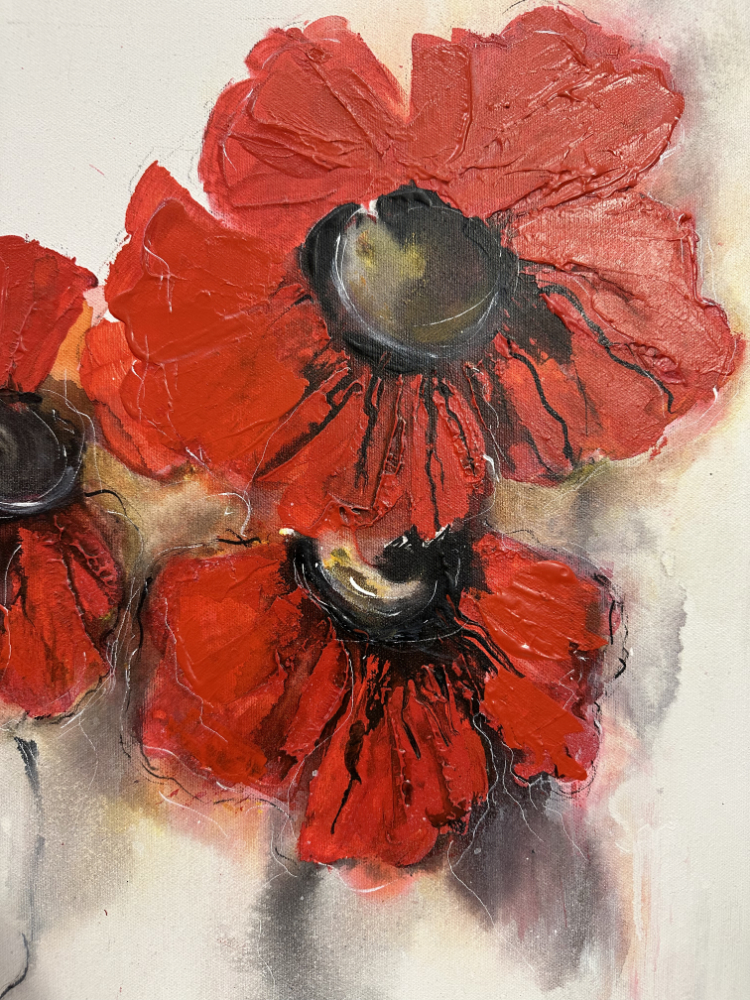 Drei leuchtend rote Blüten stehen im Mittelpunkt dieses ausdrucksstarken, signierten Ölgemäldes auf Leinwand. Die pastos aufgetragene Farbe verleiht den Blättern Tiefe und Struktur, während sanfte Farbverläufe im Hintergrund eine feine Balance schaffen. Der Kontrast zwischen kräftigem Rot und zarten Grau- und Beigetönen sorgt für lebendige Wirkung und harmonische Ausstrahlung.