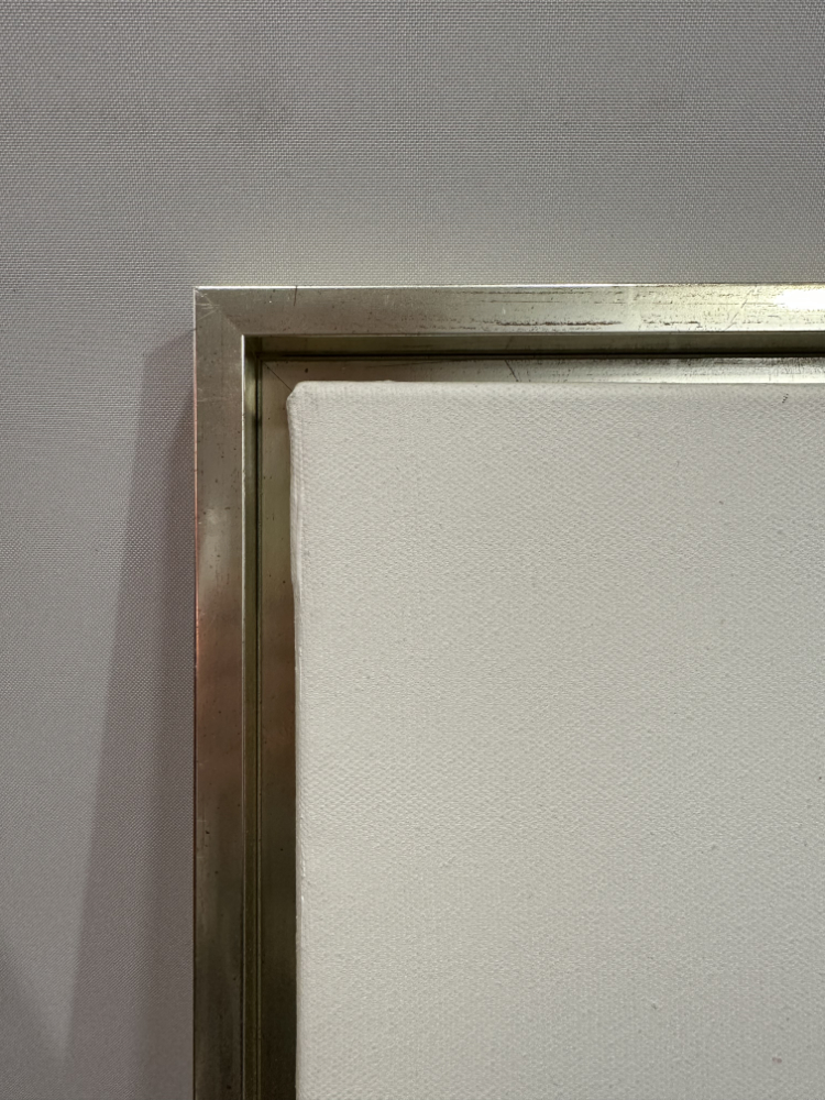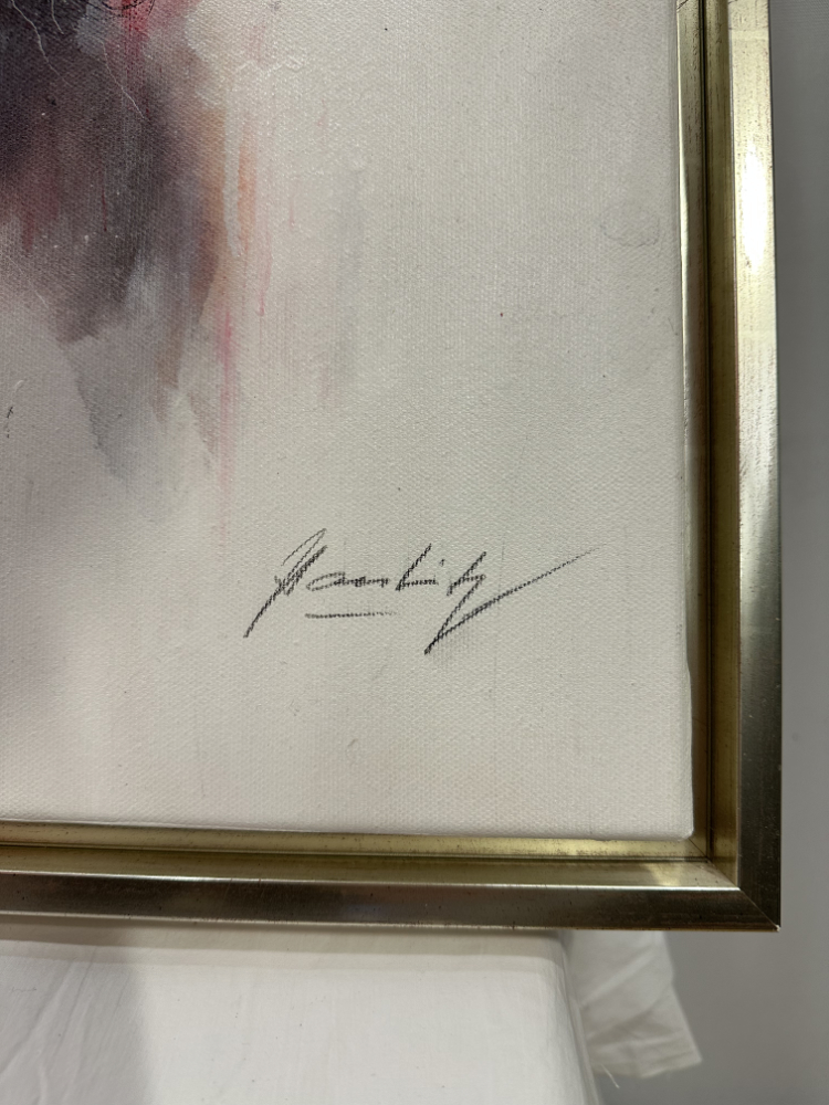 Gerahmt ist das Werk in einem Holzrahmen mit edlem Gold-Silber-Finish, das dezent schimmert und die Farbwirkung der Blüten unterstreicht. Auf Keilrahmen gespannt, rückseitig mit stabiler Aufhängung versehen. Signatur unten rechts.