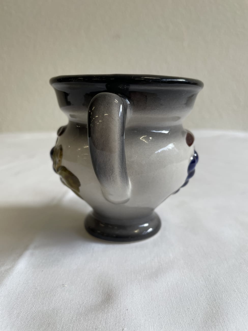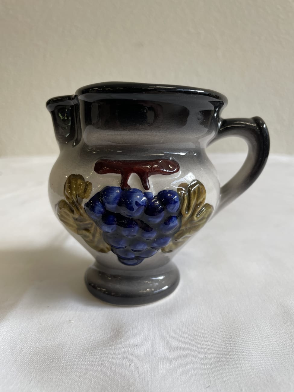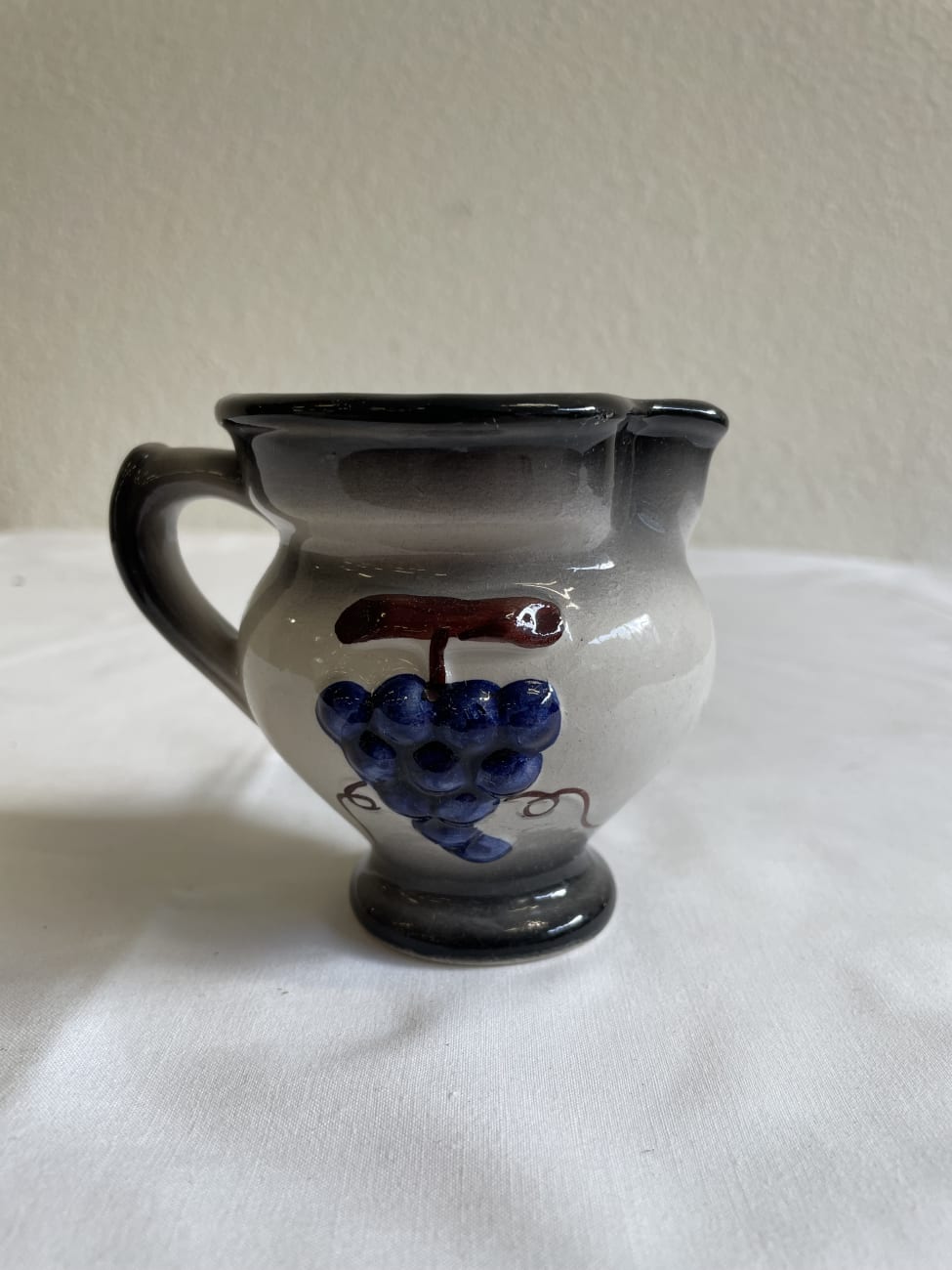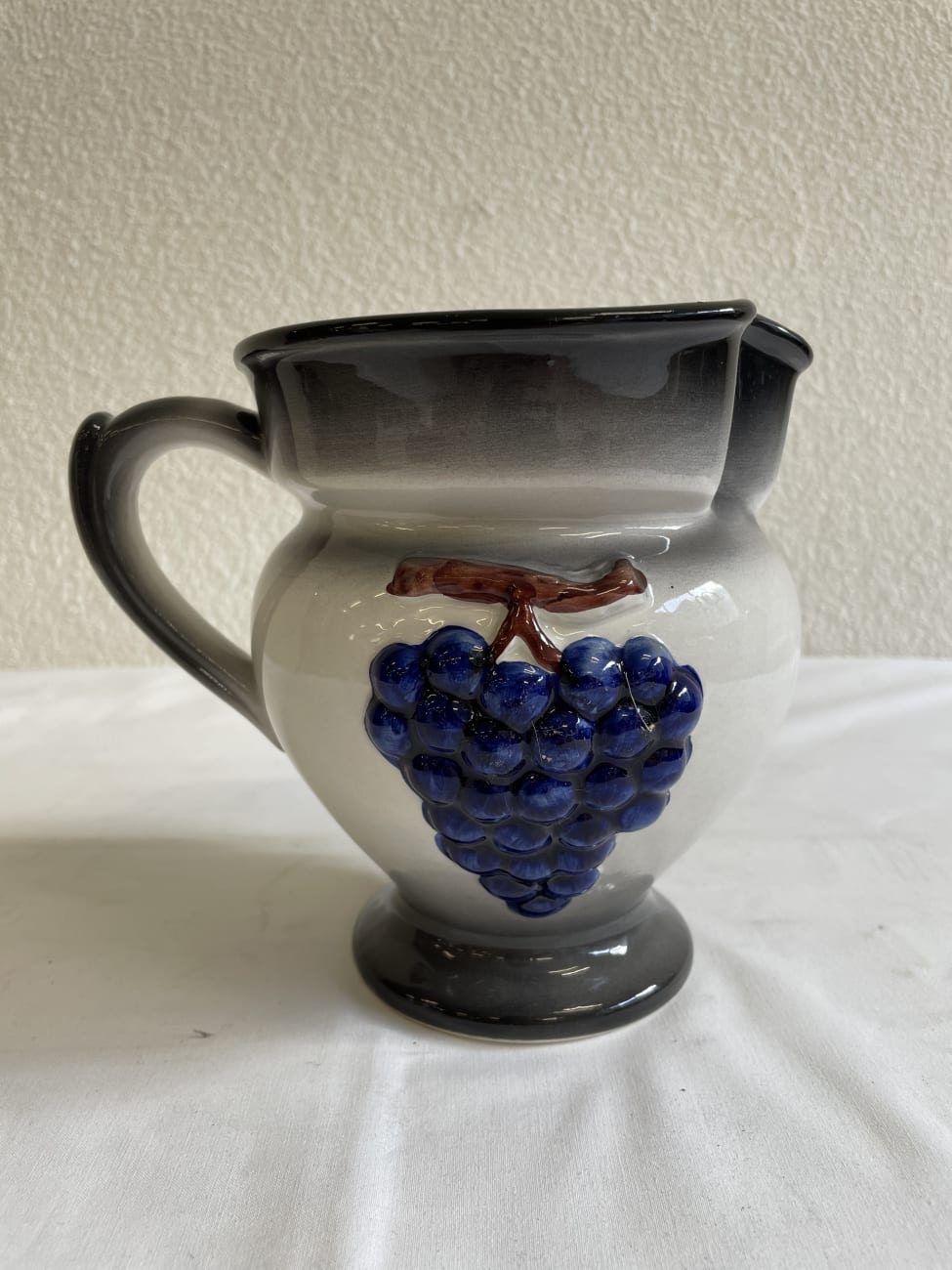 Grauweiss glasierte Keramik mit dunklem Rand und plastischem Traubenmotiv prägt dieses klassische Boccalino Set. Der bauchige Krug besitzt einen Ausguss sowie einen stabilen Henkel. Auf der Vorderseite sind blaue Trauben mit Blättern reliefartig ausgearbeitet und farbig glasiert. Das gleiche Motiv findet sich auch auf den sechs kleinen Bechern wieder.