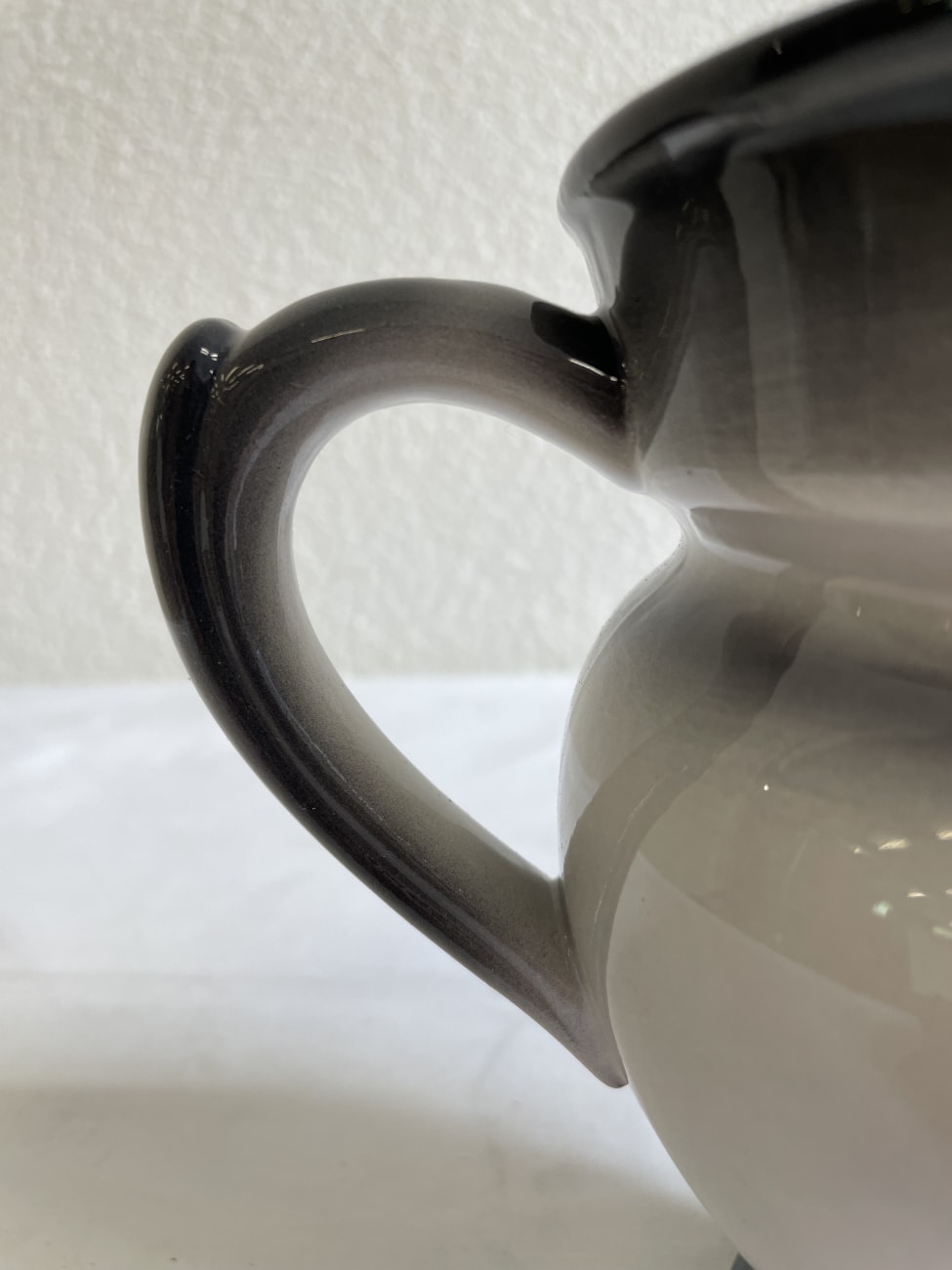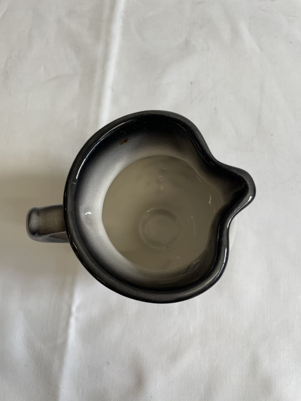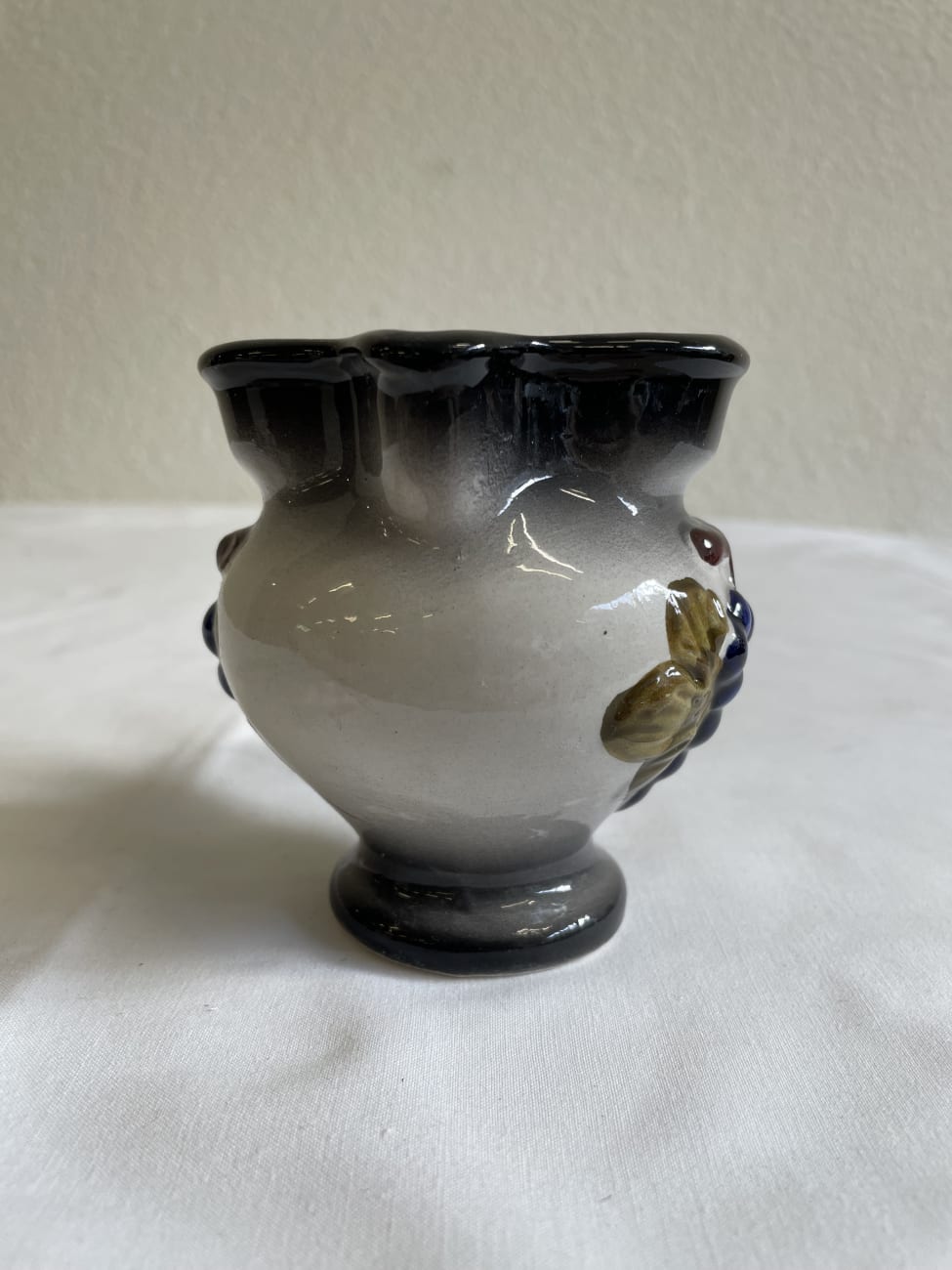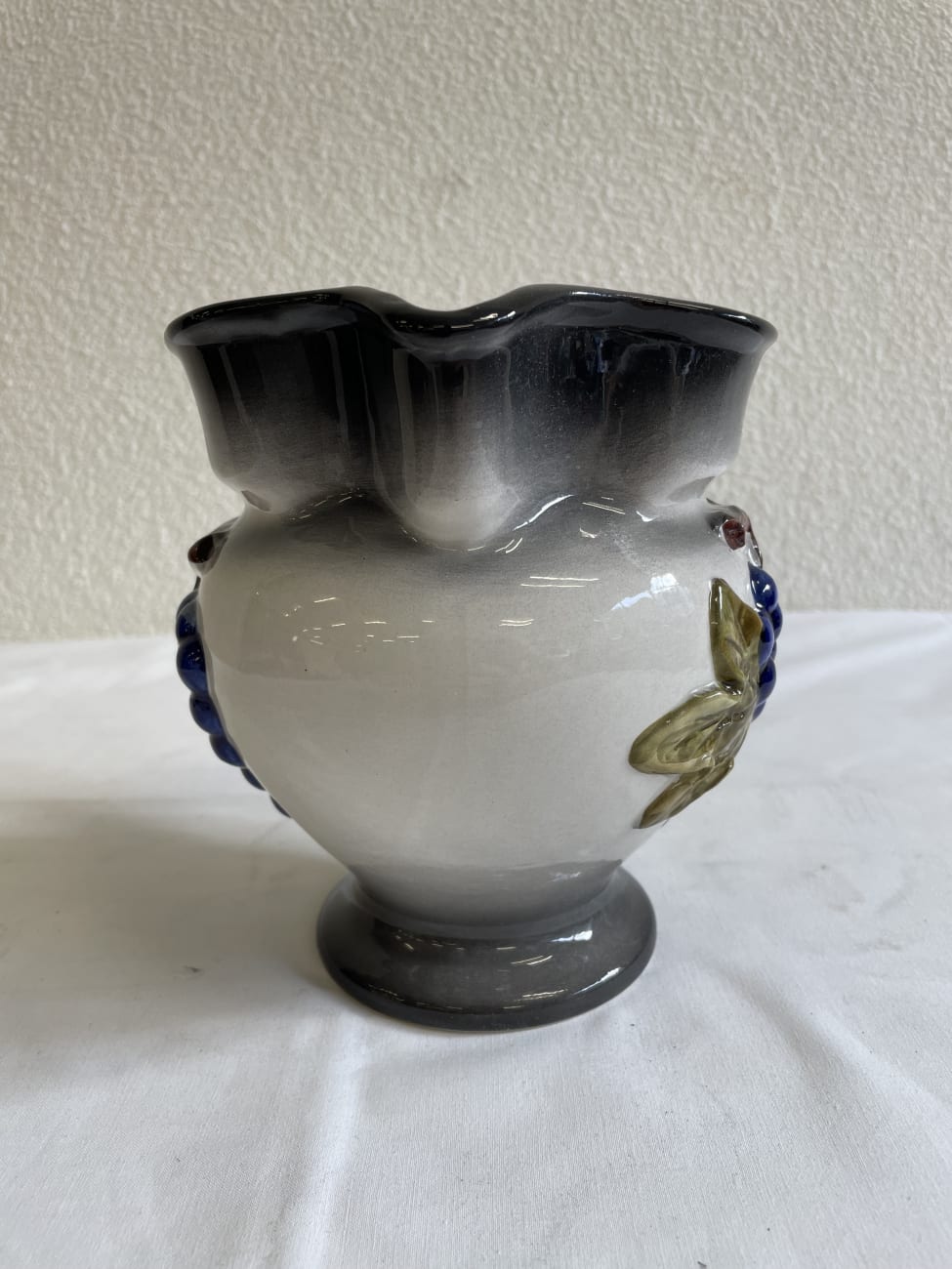Grauweiss glasierte Keramik mit dunklem Rand und plastischem Traubenmotiv prägt dieses klassische Boccalino Set. Der bauchige Krug besitzt einen Ausguss sowie einen stabilen Henkel. Auf der Vorderseite sind blaue Trauben mit Blättern reliefartig ausgearbeitet und farbig glasiert. Das gleiche Motiv findet sich auch auf den sechs kleinen Bechern wieder.