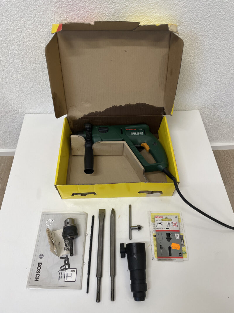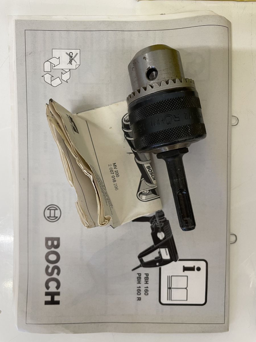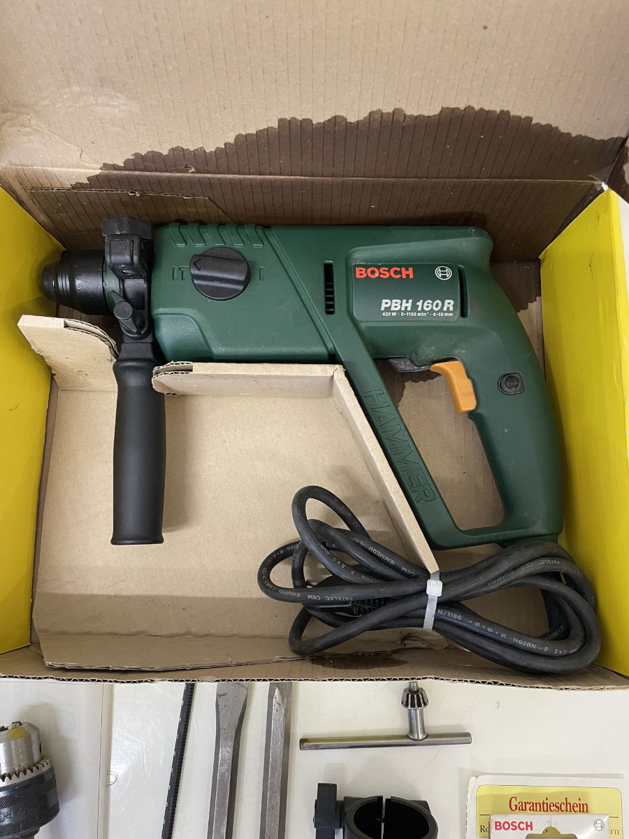 Kräftiger Bosch Bohrhammer in der klassischen grünen Ausführung, gebaut für den harten Einsatz. Das Modell PBH 160 R liegt gut in der Hand und eignet sich für Bohren und Meisseln in Mauerwerk und Beton. Mit dabei ist umfangreiches Originalzubehör, alles sauber im originalen Bosch Karton verstaut. Ein solides Werkzeug aus einer Zeit, in der Maschinen noch langlebig und reparierbar gebaut wurden.