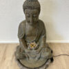 Dieser grosse Buddha Zimmerbrunnen setzt sofort einen ruhigen Akzent im Raum. Die sitzende Figur hält eine Lotusblüte, aus deren Mitte das Wasser sanft austritt. Das integrierte Licht leuchtet warm aus der Blüte und macht den Wasserlauf auch am Abend richtig stimmig.