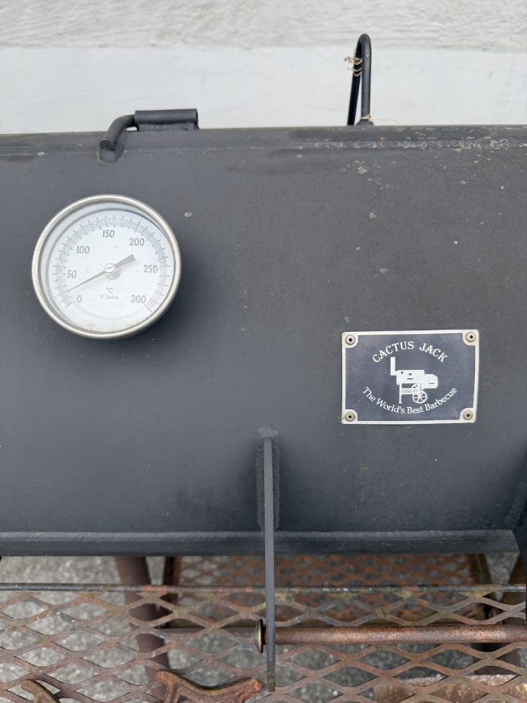 Dieser massive Cactus Jack Smoker bietet alles, was Grillfreunde und echte Barbecue-Fans schätzen. Die Kombination aus Hauptkammer, seitlicher Feuerbox und Kamin sorgt für authentisches Räuchern, Garen und Grillen über Holz oder Holzkohle. Der Grill ist gebraucht, zeigt Rostpatina und Gebrauchsspuren, ist aber in funktionalem Zustand – perfekt für Liebhaber klassischer Heavy-Duty-Smoker, die ein robustes Stück Grillgeschichte suchen.