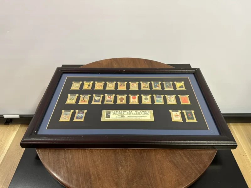 Centennial Olympic Games Collection 1896-1996 diese Sammlung befindet sich in einem hervorragenden Zustand. Der Rahmen der Sammlung weist wenige Gebrauchspuren auf. In diesem  Fotorahmen befinde sich eine Sammlung, der Hundertjährigen Olympischen Spiele von 1896-1996. Die Spiele fanden in Atlanta statt. Diese Sammlung ist wunderschön dargestellt und passt super an eine Wohnzimmerwand wie auch in ein Arbeitszimmer.