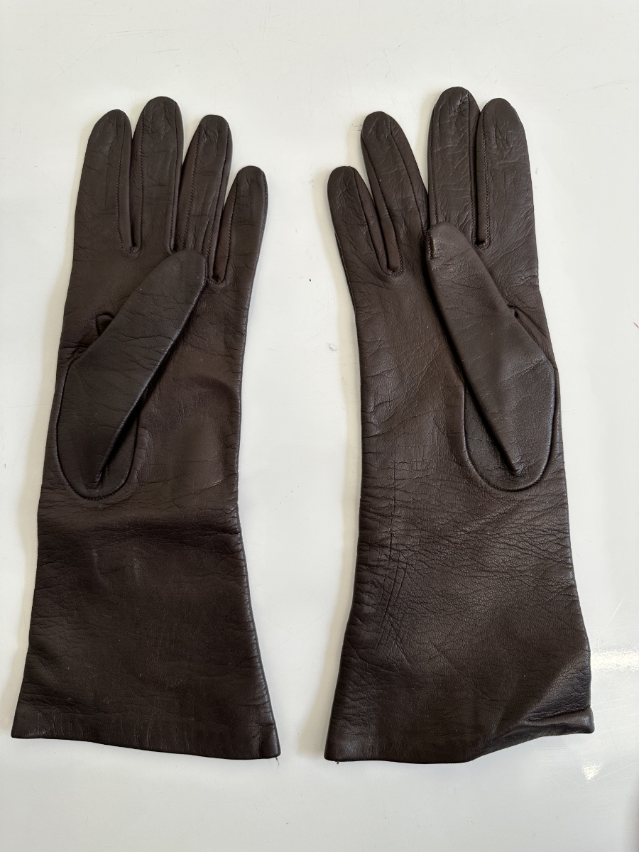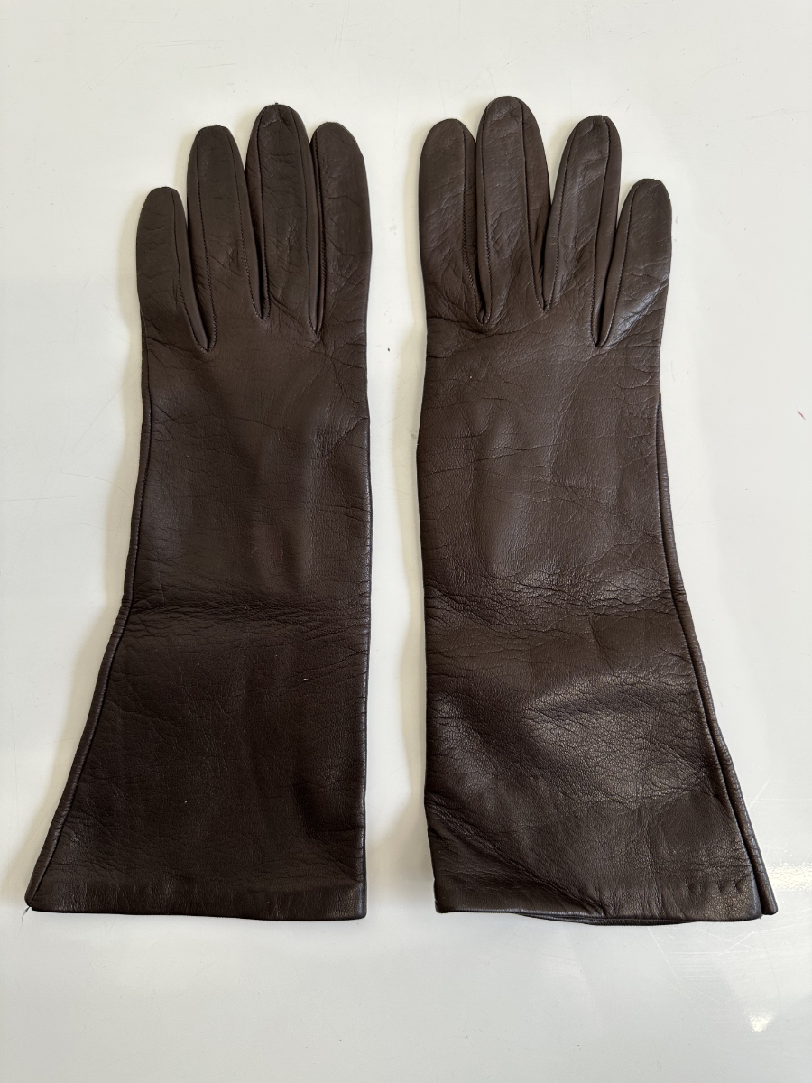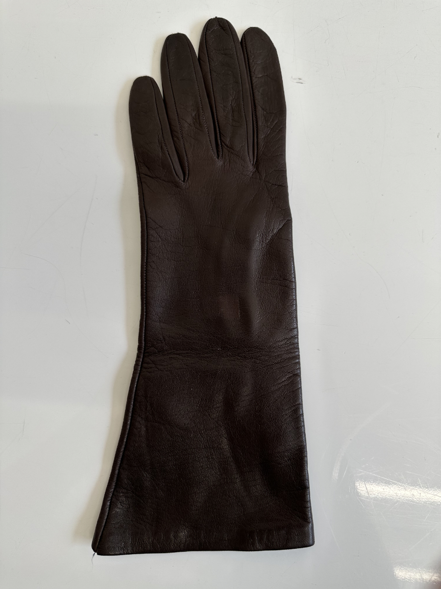 Dunkelbraunes Echtleder mit sichtbarer, natürlicher Narbung und klassischem Schnitt. Die Handschuhe sind angenehm lang gearbeitet und decken das Handgelenk gut ab. Innen befindet sich ein helles Textilfutter, das für zusätzlichen Komfort sorgt und die Handschuhe alltagstauglich für kühlere Tage macht.