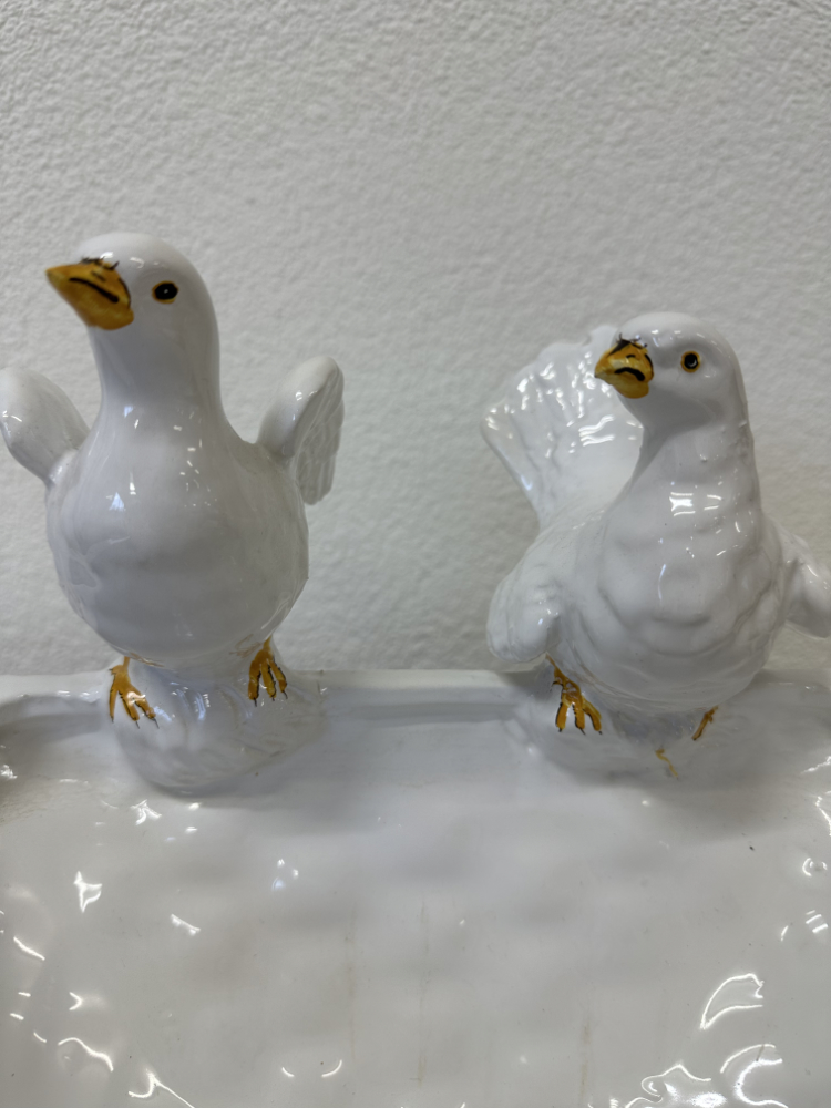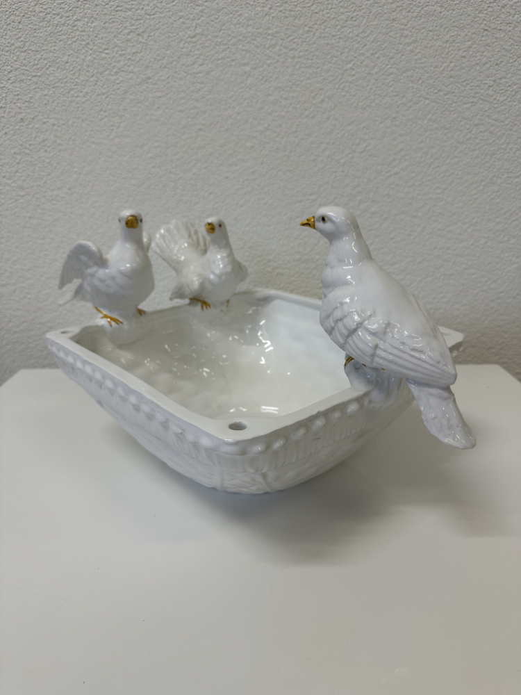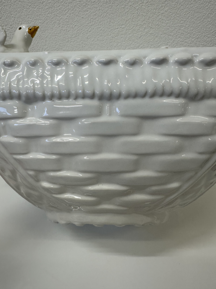 Glänzend weiss glasiertes Porzellan trifft auf eine lebendige Gestaltung mit plastisch ausgearbeiteten Vögeln. Drei fein modellierte Vögel sitzen am Rand dieser formschönen Schale und verleihen ihr eine verspielte, zugleich elegante Ausstrahlung. Die Kombination aus strukturierter Korboptik, klarer Form und dezenten goldfarbenen Akzenten an Schnäbeln und Füssen sorgt für einen hochwertigen Gesamteindruck.