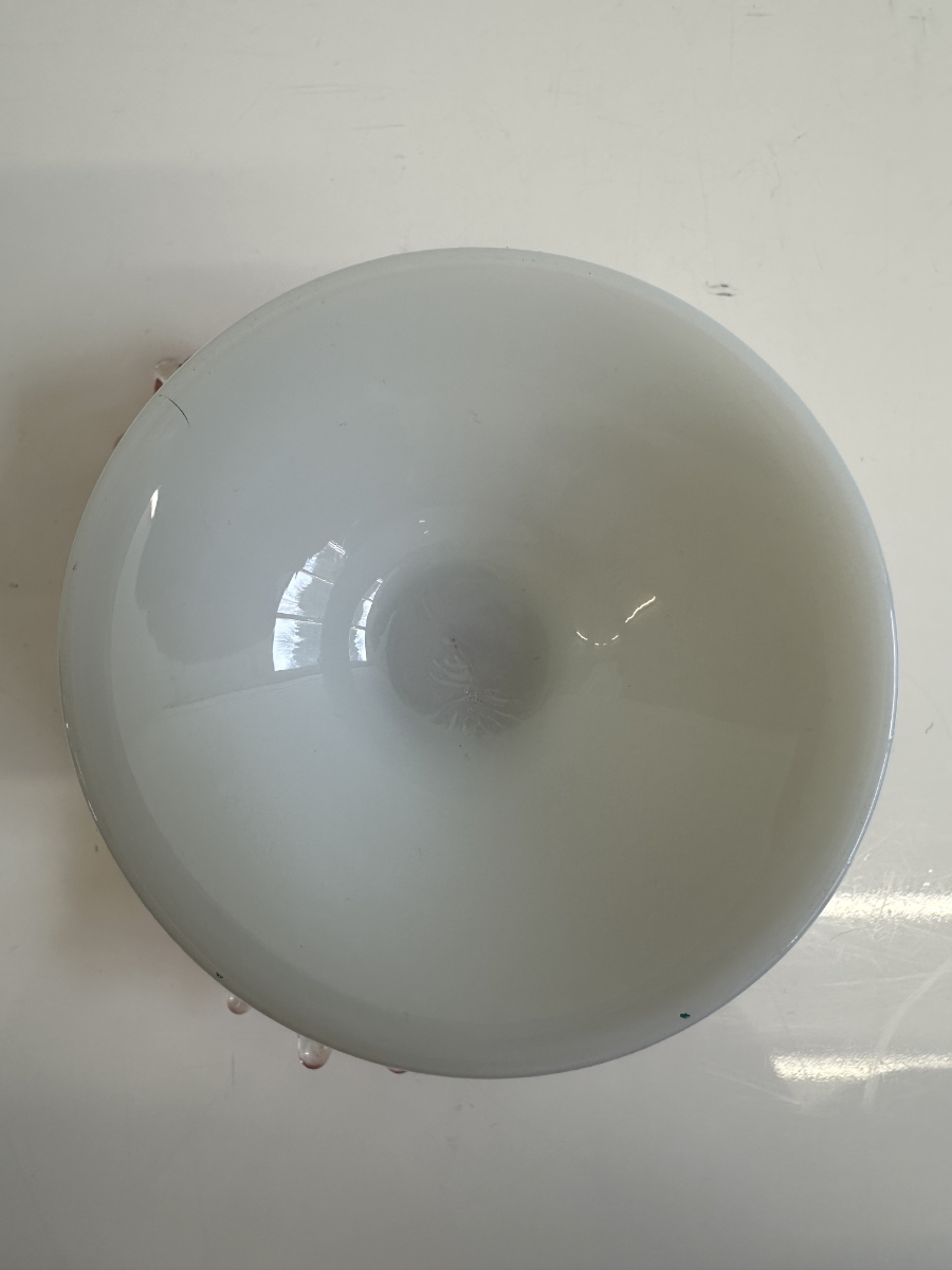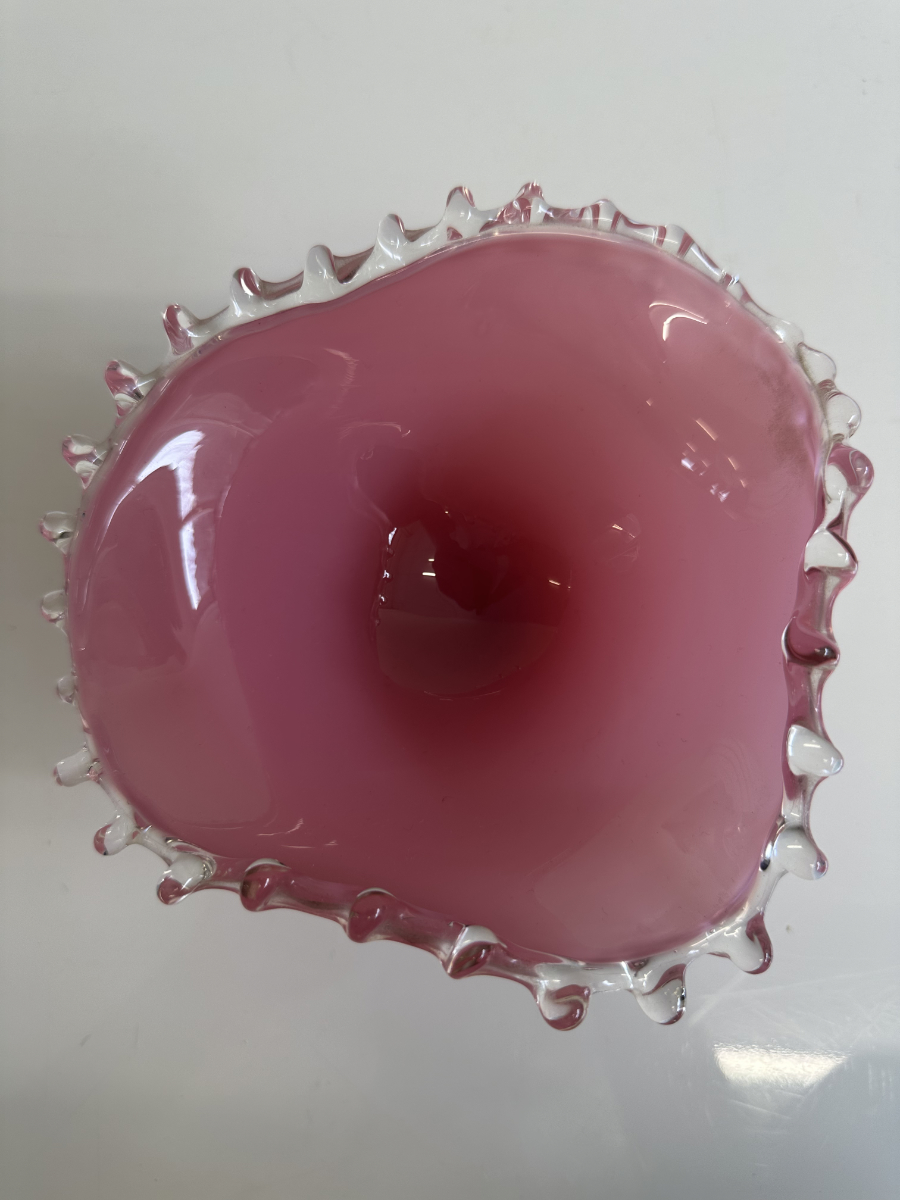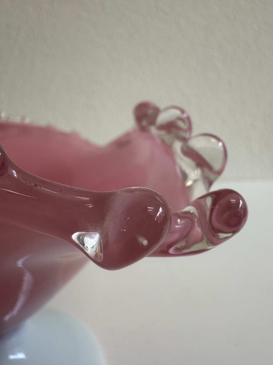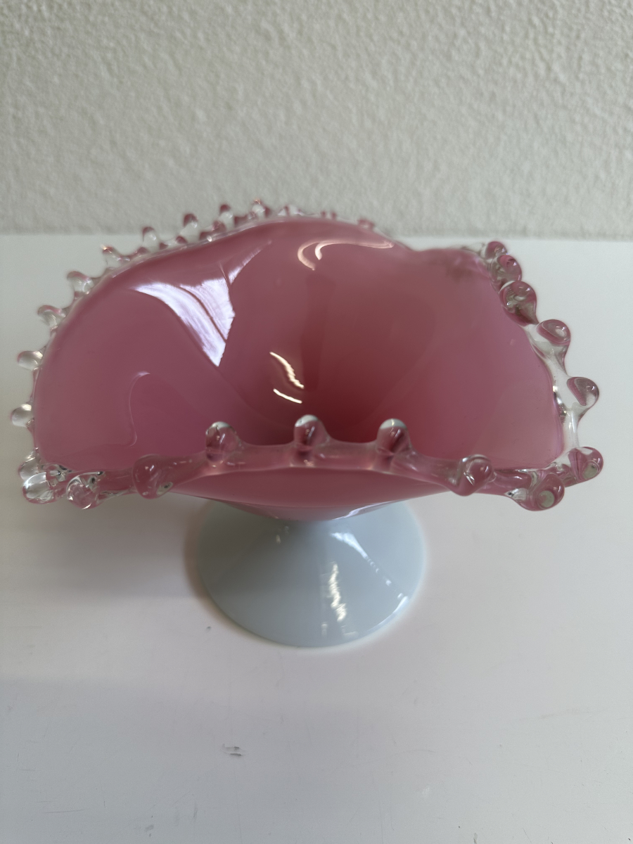 Roséfarbener Glanz und ein lebendiger Rand machen diese Vintage Glas Schale zu einem echten Hingucker. Die Schalenform läuft weich nach innen, sitzt stabil auf einem hellen Fuss und wirkt durch die Kombination aus Milchglasoptik und Rosa besonders harmonisch. Rundum sorgt der gewellte Abschluss mit klaren Glasnoppen für einen typischen Vintage-Look und schöne Lichtreflexe. Perfekt als Dekoobjekt oder als Schale für kleine Dinge auf Tisch, Kommode oder Sideboard.
