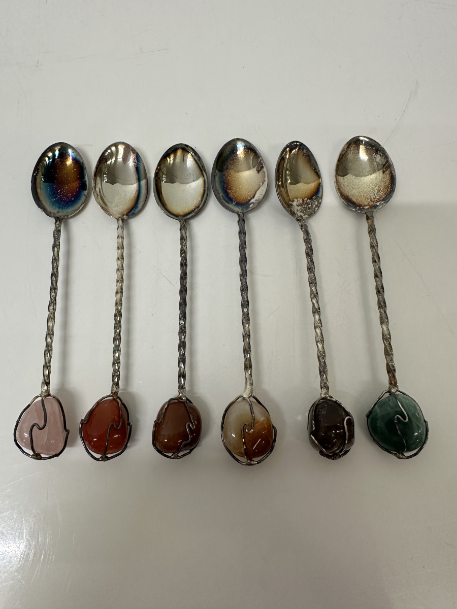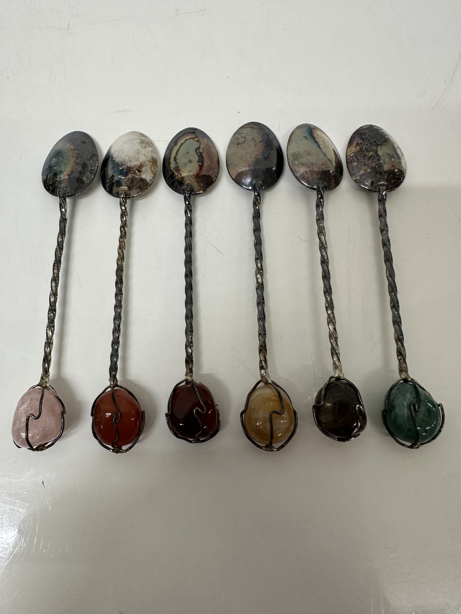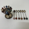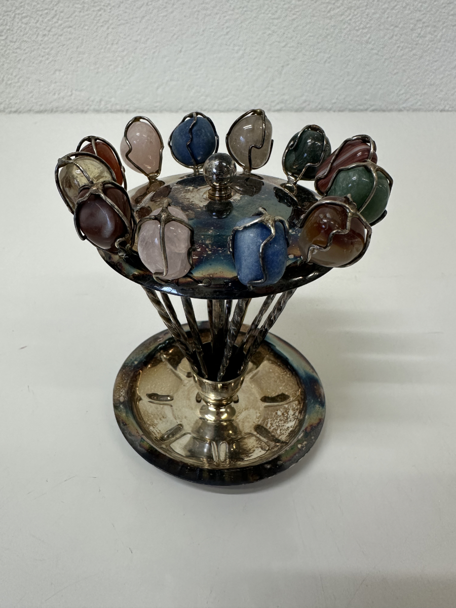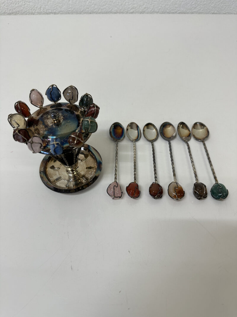 Dieses dekorative Apéro-Set besteht aus sechs kleinen Löffeln, zwölf Spiessen sowie einem passenden Ständer und wird inklusive Originalbox mit Aufdruck MP «Prata 99» angeboten. Die gedrehten Metallstiele und die farbigen Steinabschlüsse verleihen dem Set eine elegante, leicht verspielte Optik. Ideal für Apéro, Kaffee oder Dessert und gleichzeitig ein dekorativer Hingucker auf Tisch oder Barwagen.