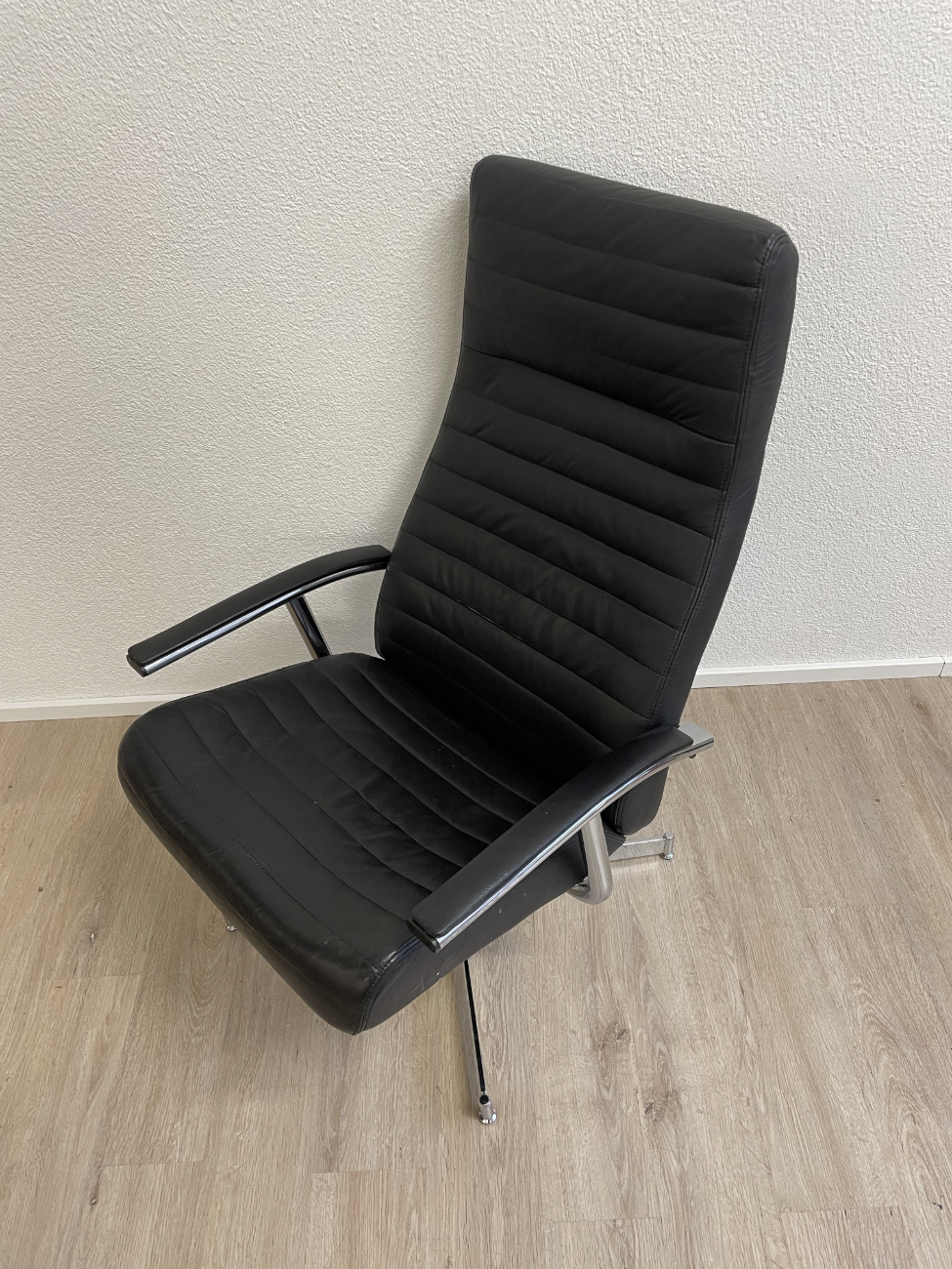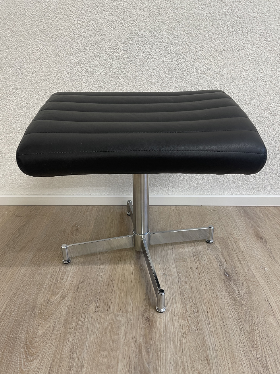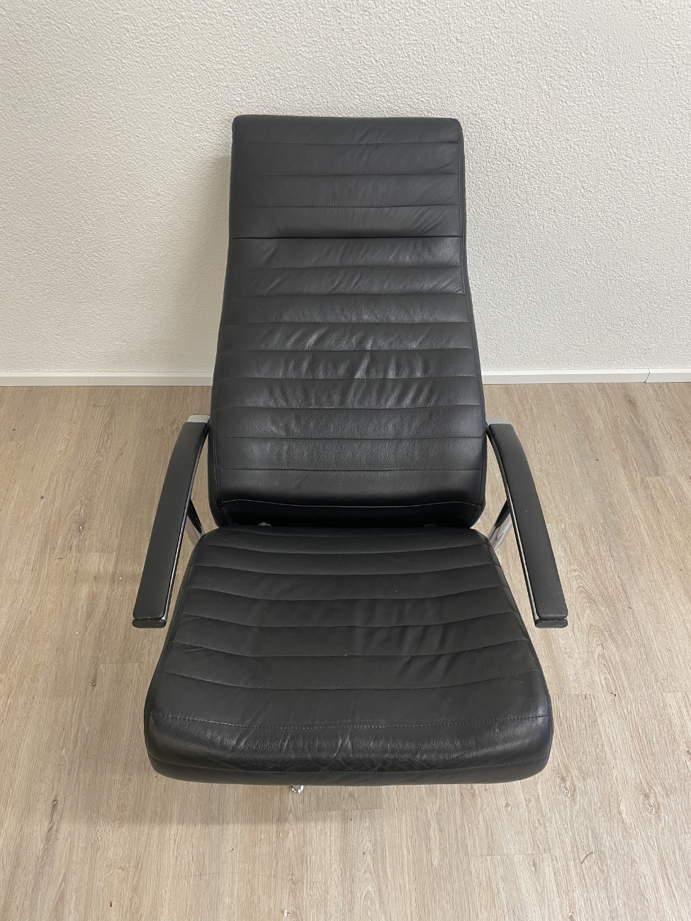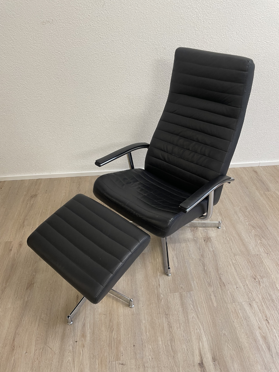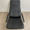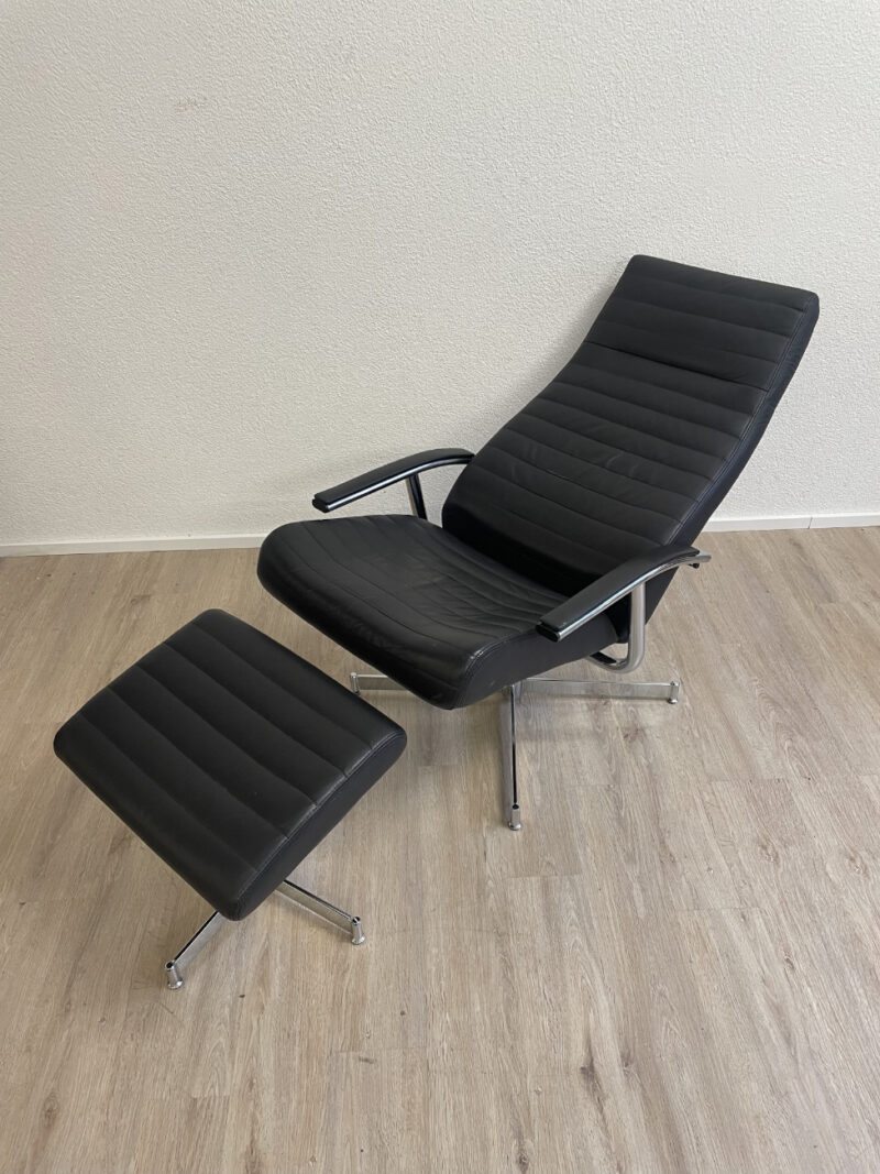 Schwarz gepolstertes Leder, klare Linien und ein stabiler Chromsternfuss: Dieser Relaxsessel mit passendem Hocker macht es leicht, sofort bequem zu sitzen. Die Rückenlehne lässt sich über den seitlichen Hebel verstellen, der Sessel steht drehbar auf dem Fussgestell und die Armlehnen geben angenehmen Halt. Der Hocker übernimmt den Rest, Füße hoch und fertig.