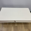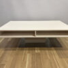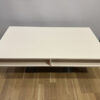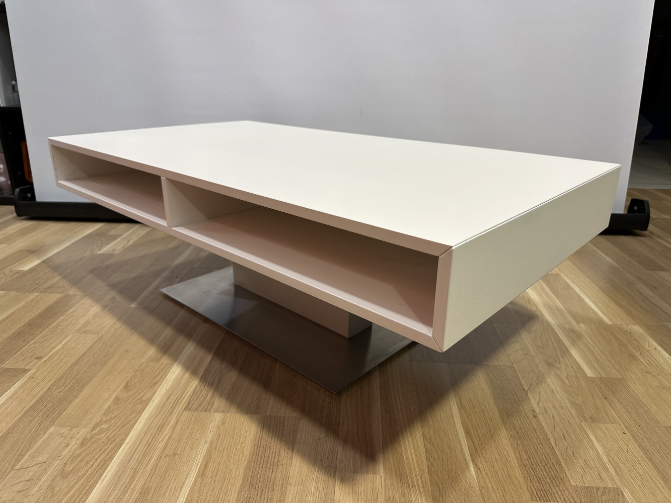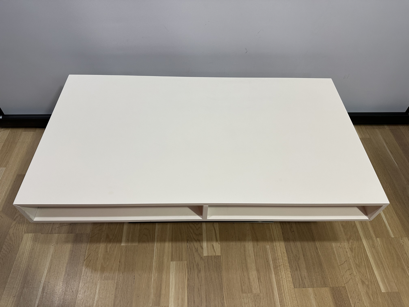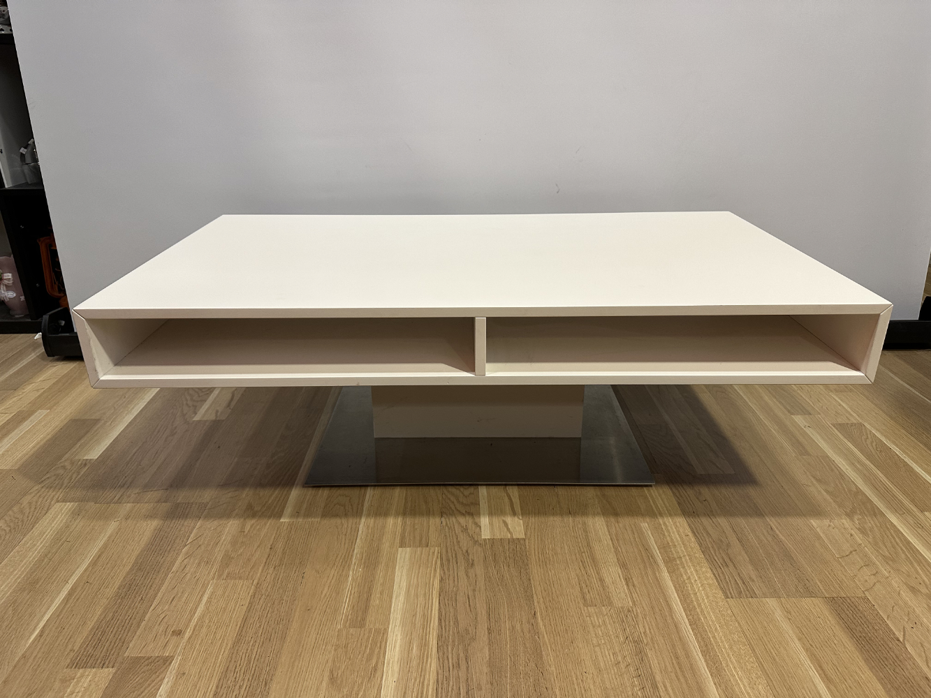 Die Oberfläche ist in einem hellen, cremig-weissen Ton lackiert und verleiht dem Tisch eine ruhige, moderne Ausstrahlung. Ideal als zentrales Element im Wohnbereich, kombiniert er dezente Eleganz mit praktischem Stauraum für Zeitschriften, Fernbedienungen oder Bücher. Leichte Gebrauchsspuren sind vorhanden, insgesamt sehr gepflegter Zustand.