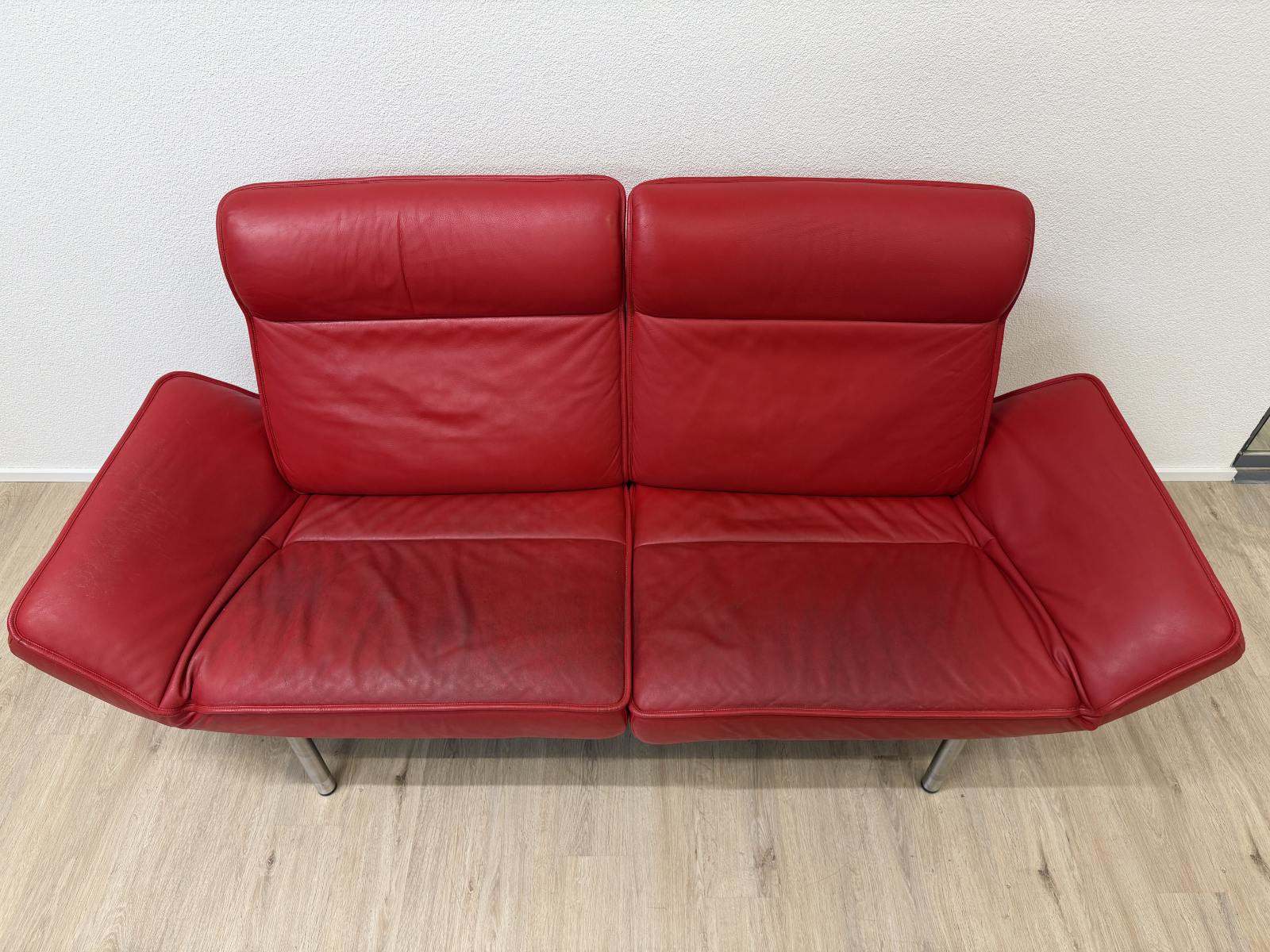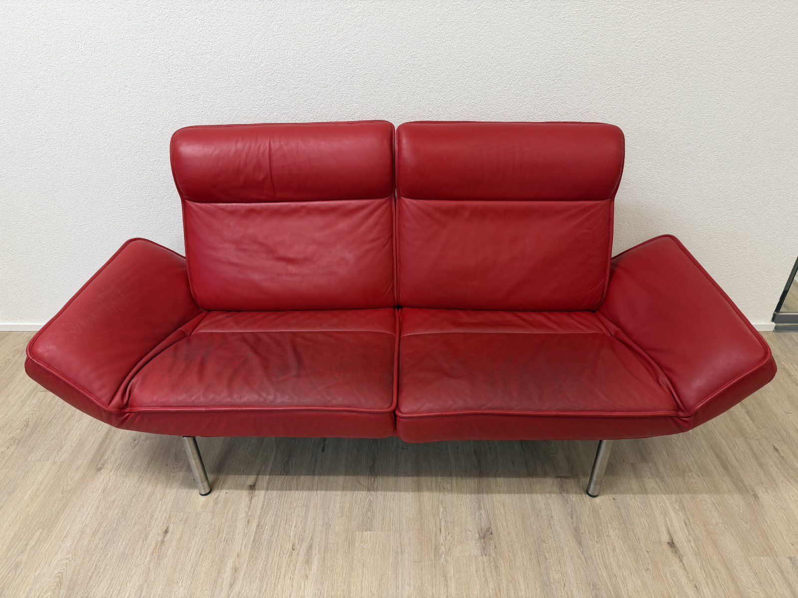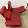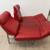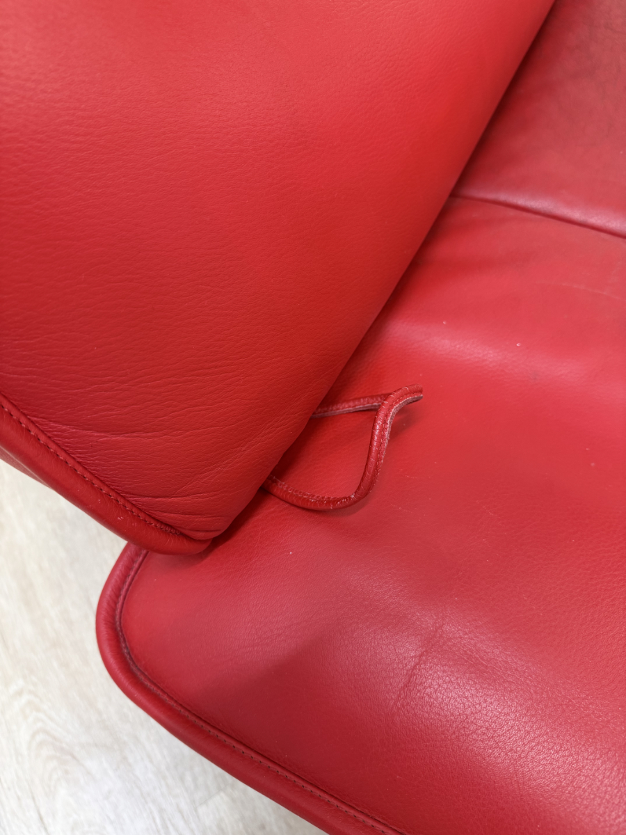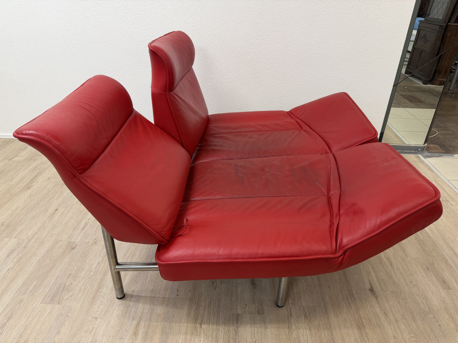 Sattes Rot und eine Form, die sofort auffällt. Das de Sede DS-450 wirkt wie ein Designobjekt und sitzt sich dabei richtig bequem. Klappbare Seitenteile machen es flexibel, mal als breite Armlehne, mal als Liegefläche. Das Leder zeigt eine ehrliche Patina mit sichtbaren Gebrauchsspuren, vor allem auf den Sitzflächen, genau das gibt dem Stück Charakter.