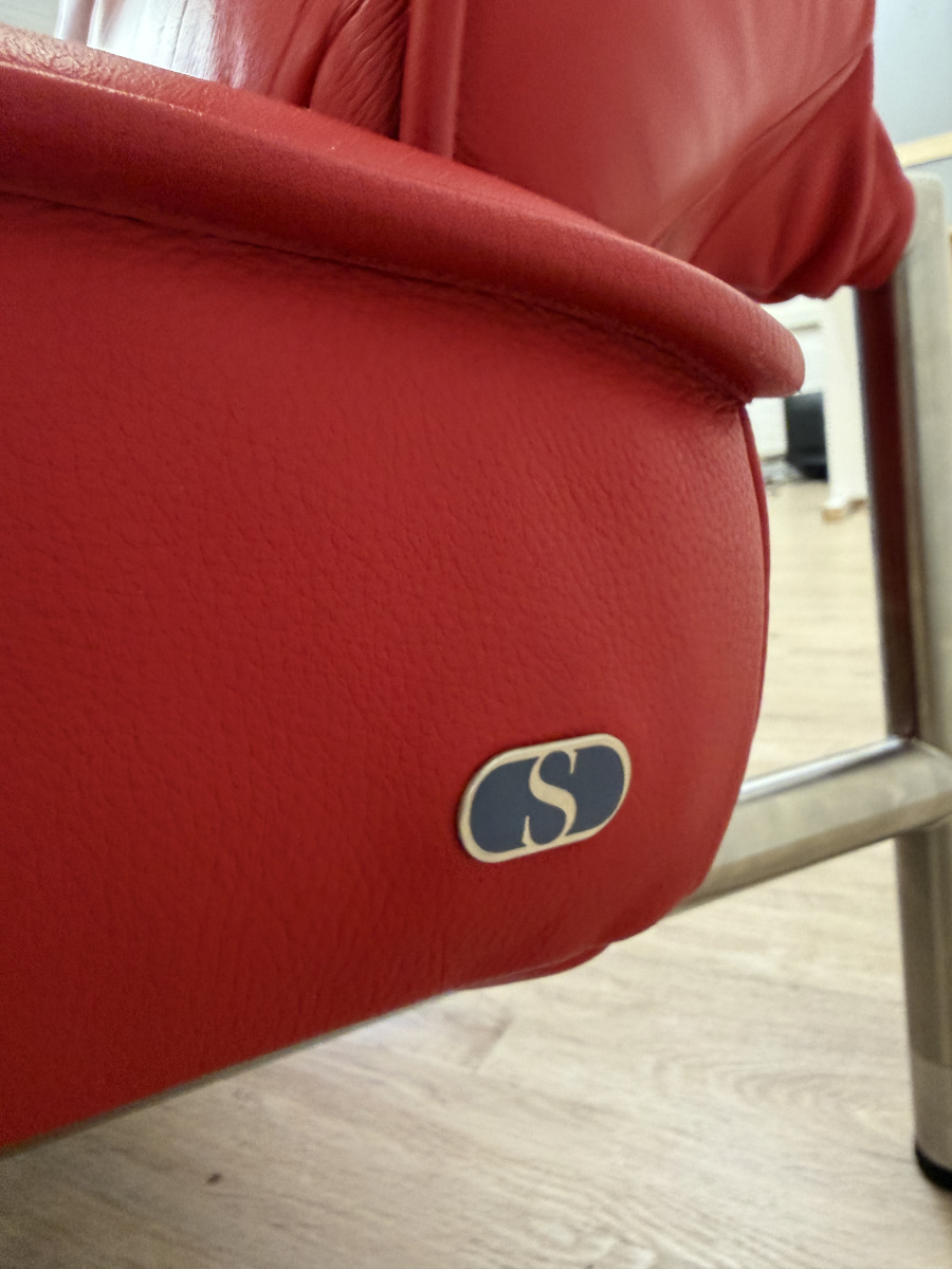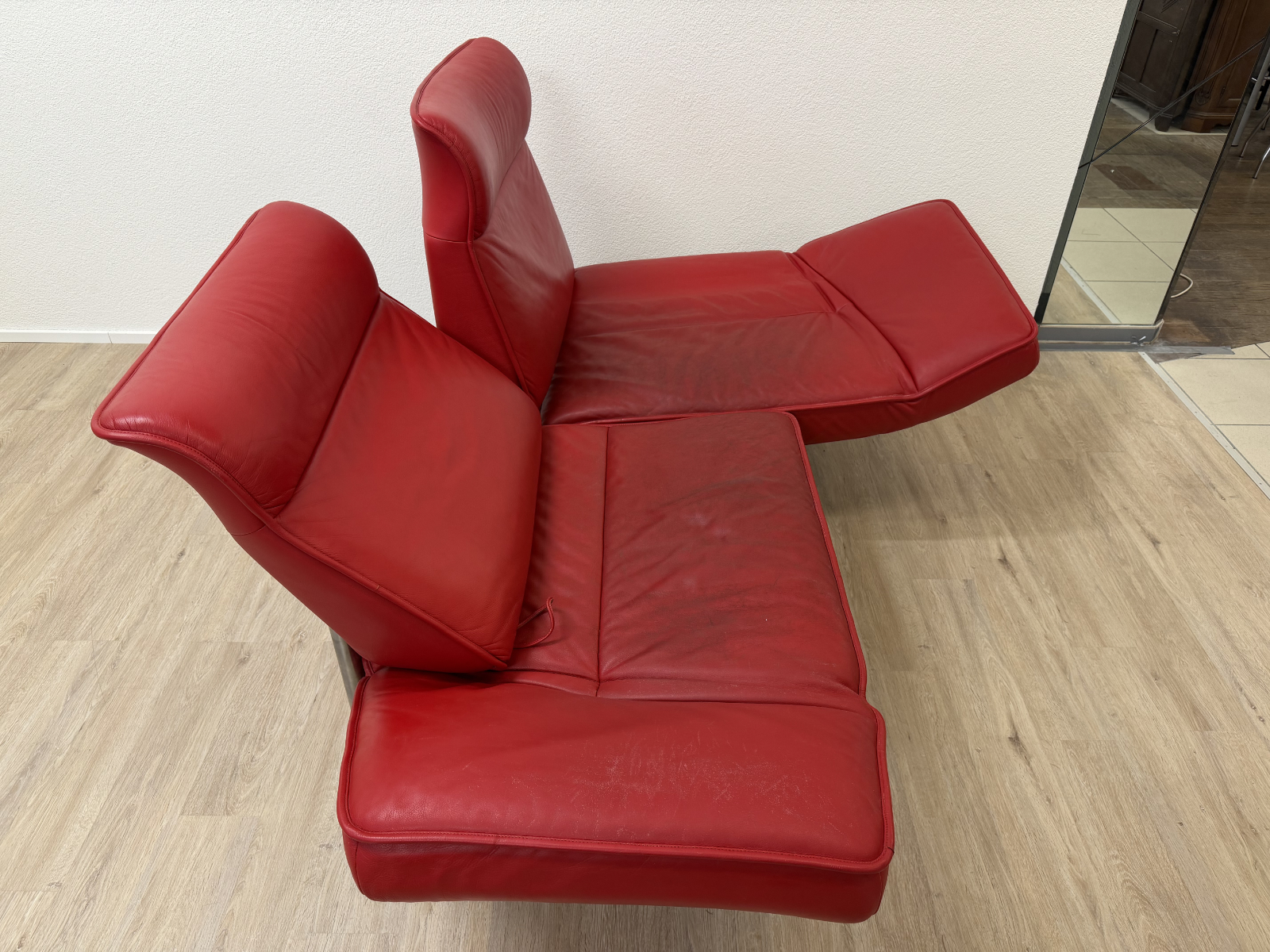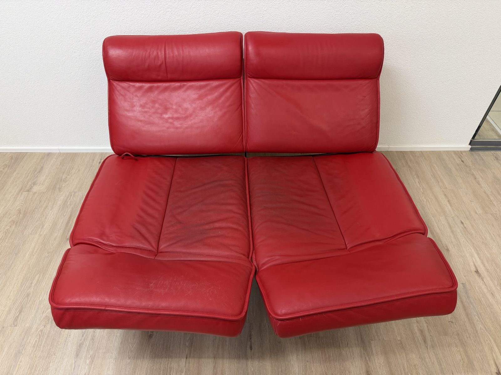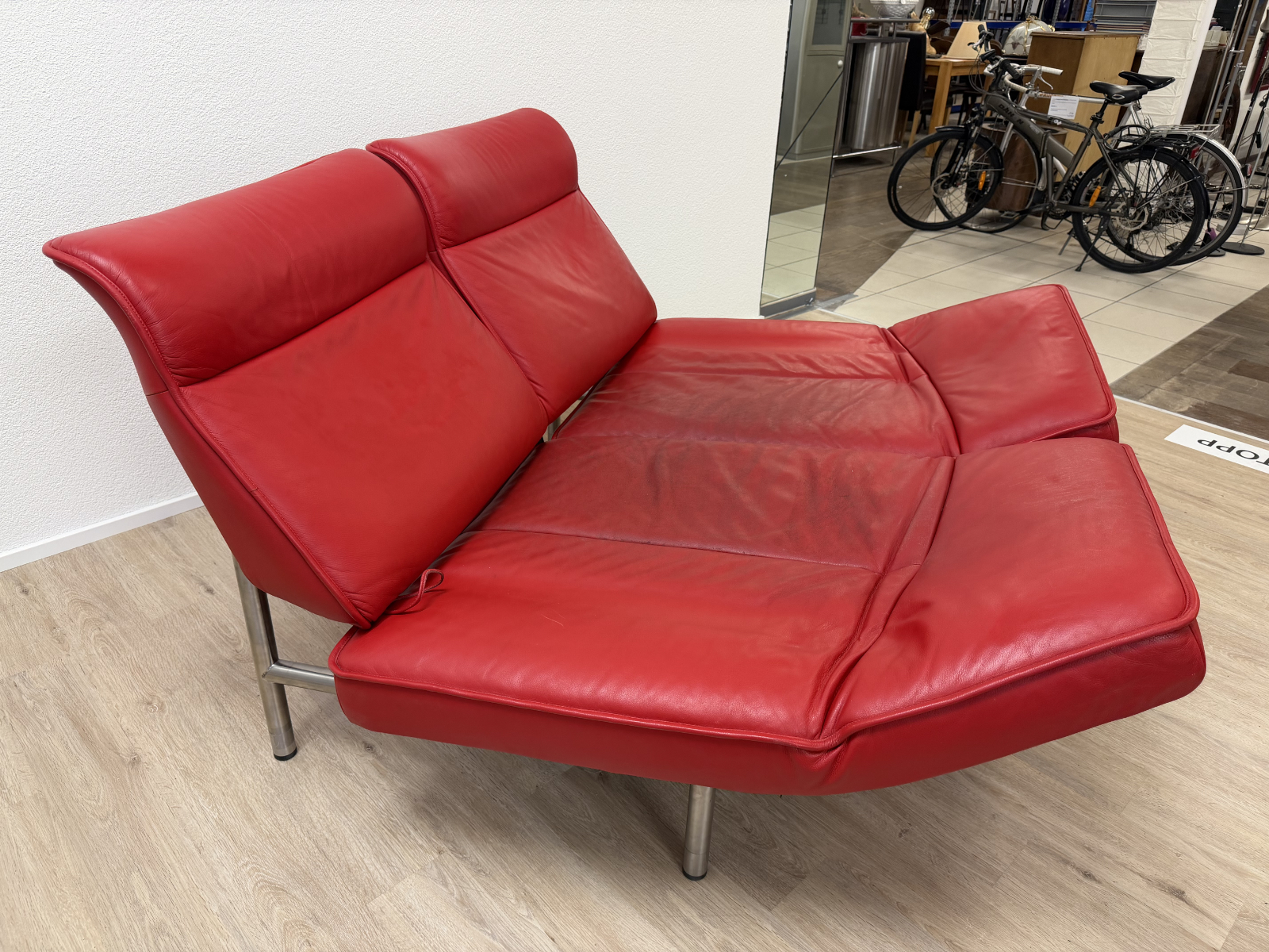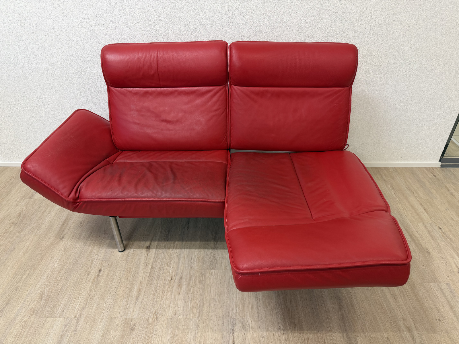 Sattes Rot und eine Form, die sofort auffällt. Das de Sede DS-450 wirkt wie ein Designobjekt und sitzt sich dabei richtig bequem. Klappbare Seitenteile machen es flexibel, mal als breite Armlehne, mal als Liegefläche. Das Leder zeigt eine ehrliche Patina mit sichtbaren Gebrauchsspuren, vor allem auf den Sitzflächen, genau das gibt dem Stück Charakter.