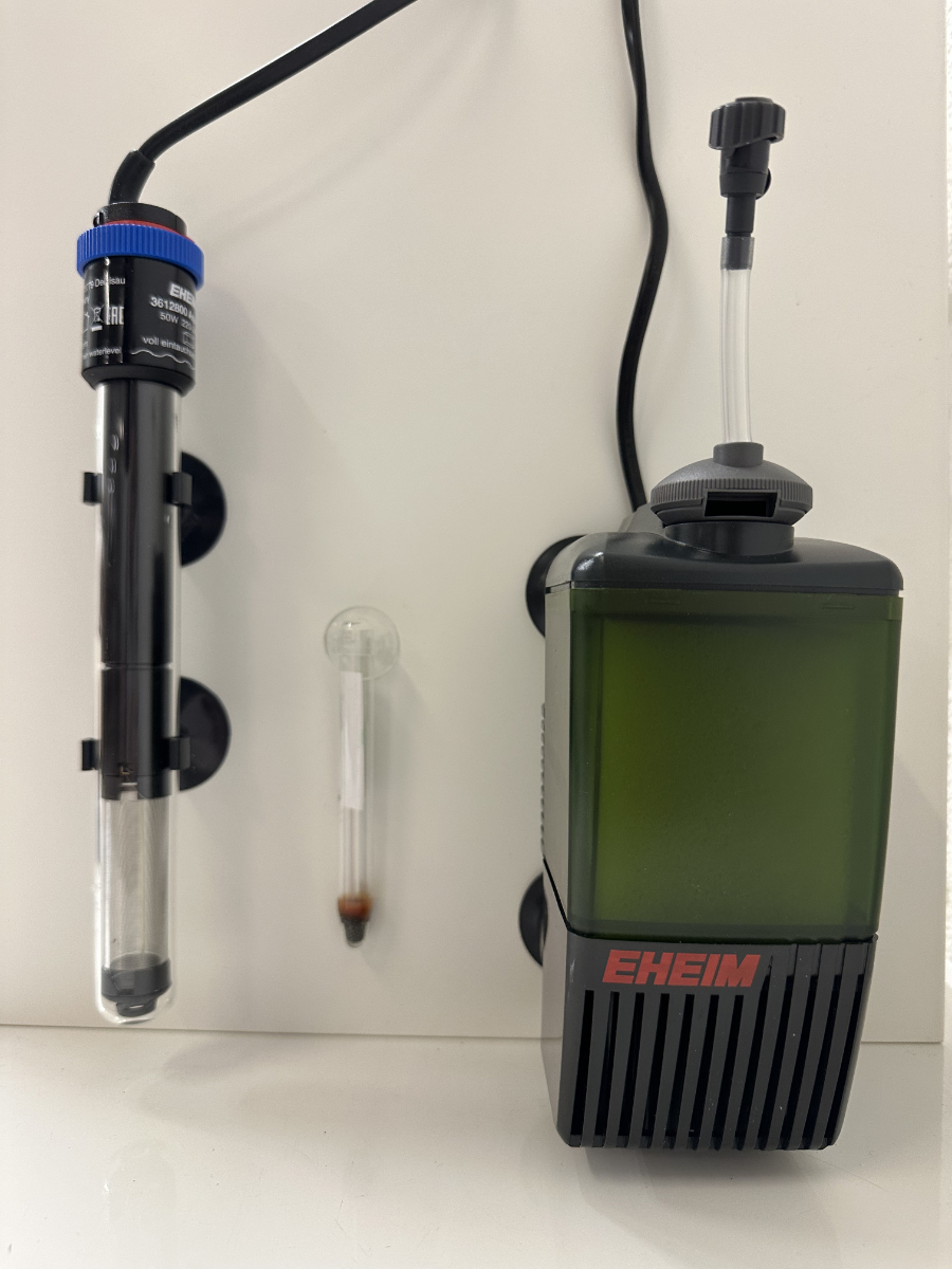 Der Innenfilter sorgt für sauberes Wasser und stabile Bedingungen im Becken. Der EHEIM Regelheizer ermöglicht eine präzise Temperatureinstellung und ist vollständig wasserdicht. Ergänzt wird das Set durch Thermometer, Saugnäpfe, Anschluss- und Befestigungsteile sowie die Original-Bedienungsanleitung.