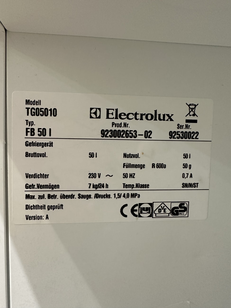 Electrolux Gefriergerät Modell TG05010 kompakt mit 50L Volumen
