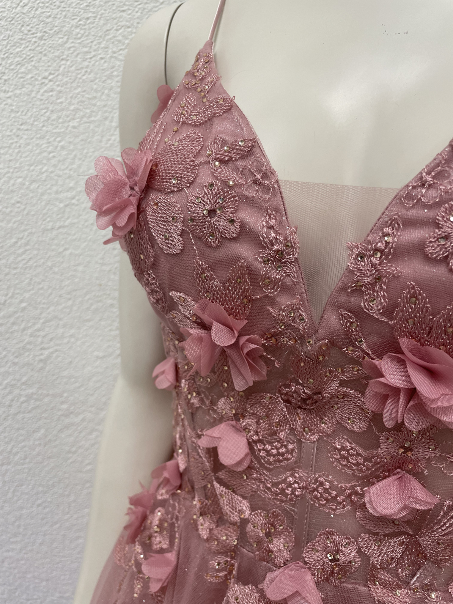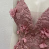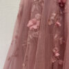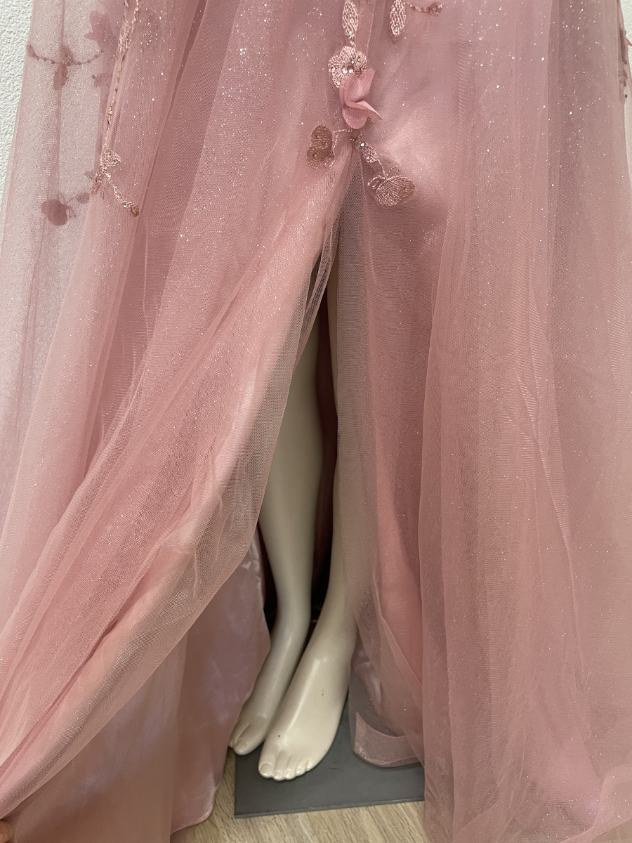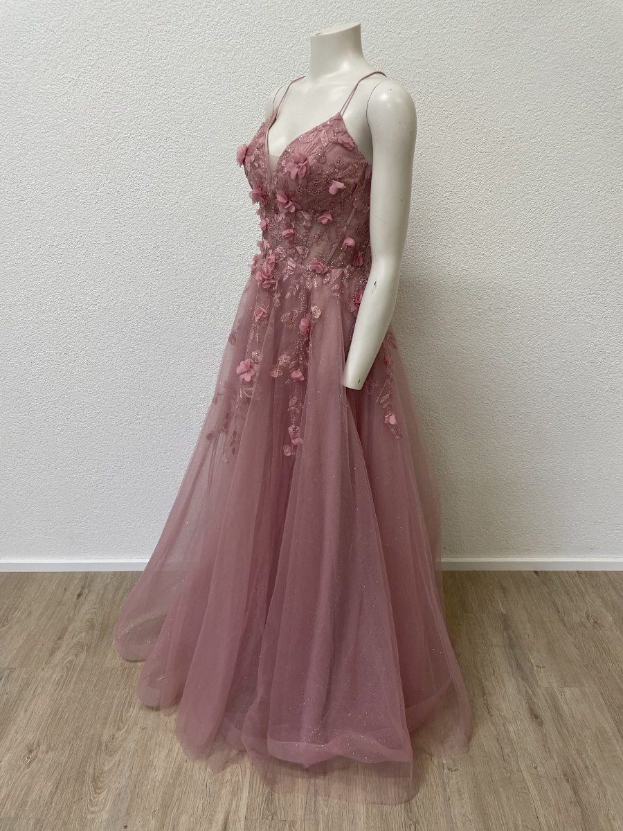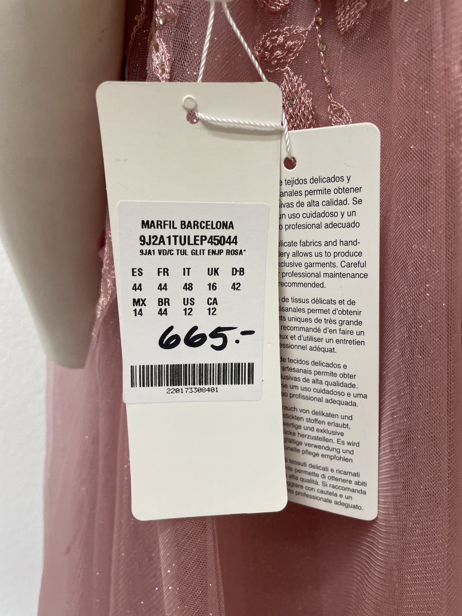 Zartes Rosé, feiner Glitzertüll und aufwendig gearbeitete Blumenapplikationen prägen dieses lange Abendkleid von Marfil Barcelona. Das Oberteil ist reich bestickt und mit kleinen Perlen akzentuiert, die floralen Elemente sind teilweise plastisch gearbeitet und sorgen für Tiefe und Bewegung. Der fliessende Rock fällt weich bis zum Boden und schimmert dezent bei jedem Schritt. Die schmalen Träger, der tiefe V-Ausschnitt und die geschnürte Rückenpartie verleihen dem Kleid eine feminine, elegante Linie. Originaletikett noch vorhanden.