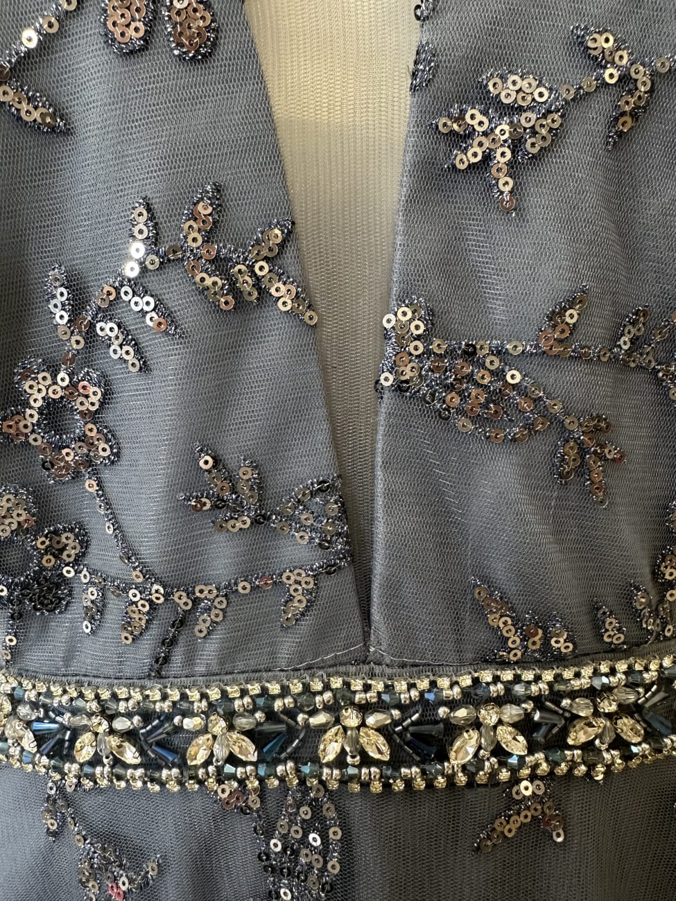 ✅ Graublaue Farbgebung mit glitzernden Pailletten und Applikationen