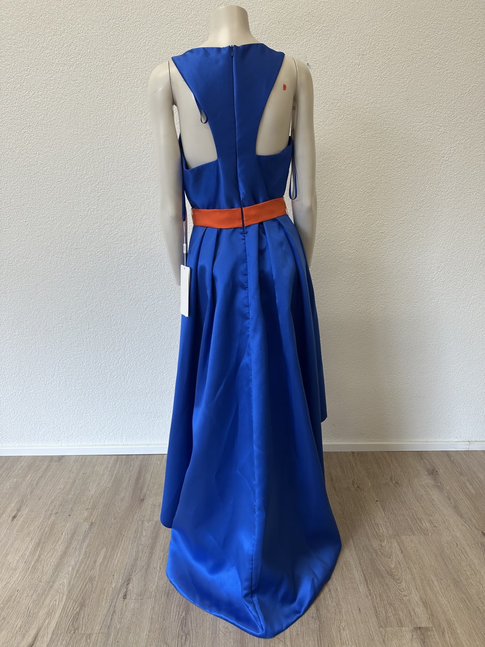 Sattes Kobaltblau trifft auf einen auffälligen Kontrast in Orange. Dieses elegante Abendkleid von Rosa Clará stammt aus der White Line Kollektion und wurde für besondere Anlässe entworfen. Der hochwertige Stoff fällt strukturiert und formstabil, wodurch der ausgestellte Rock seine schöne Silhouette behält. Vorne zeigt sich ein moderner, asymmetrischer Saum, während das Kleid hinten bodenlang ausläuft. Die orangefarbene Schleife setzt einen lebendigen Akzent und betont die Taille auf stilvolle Weise.