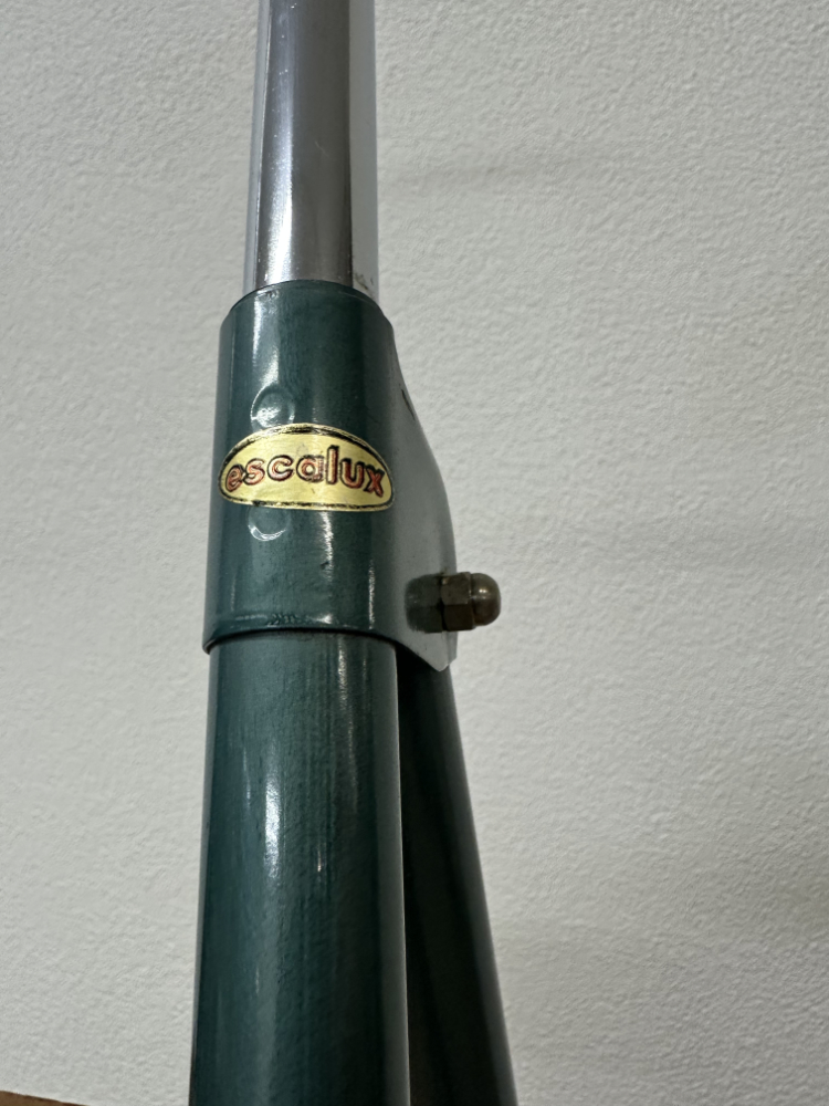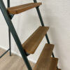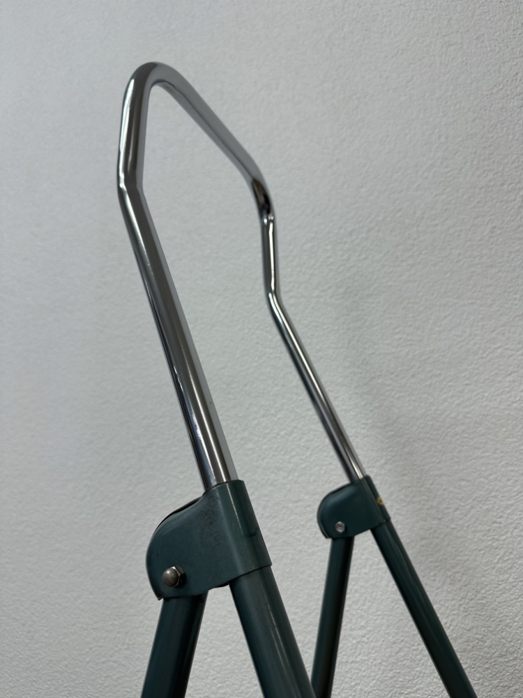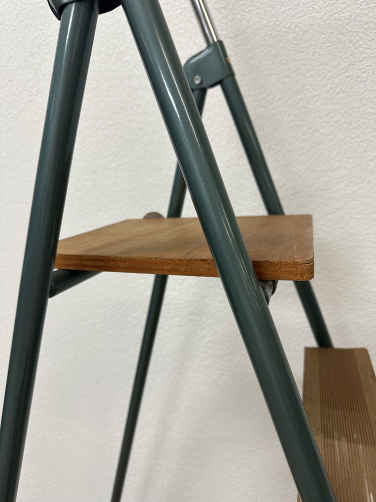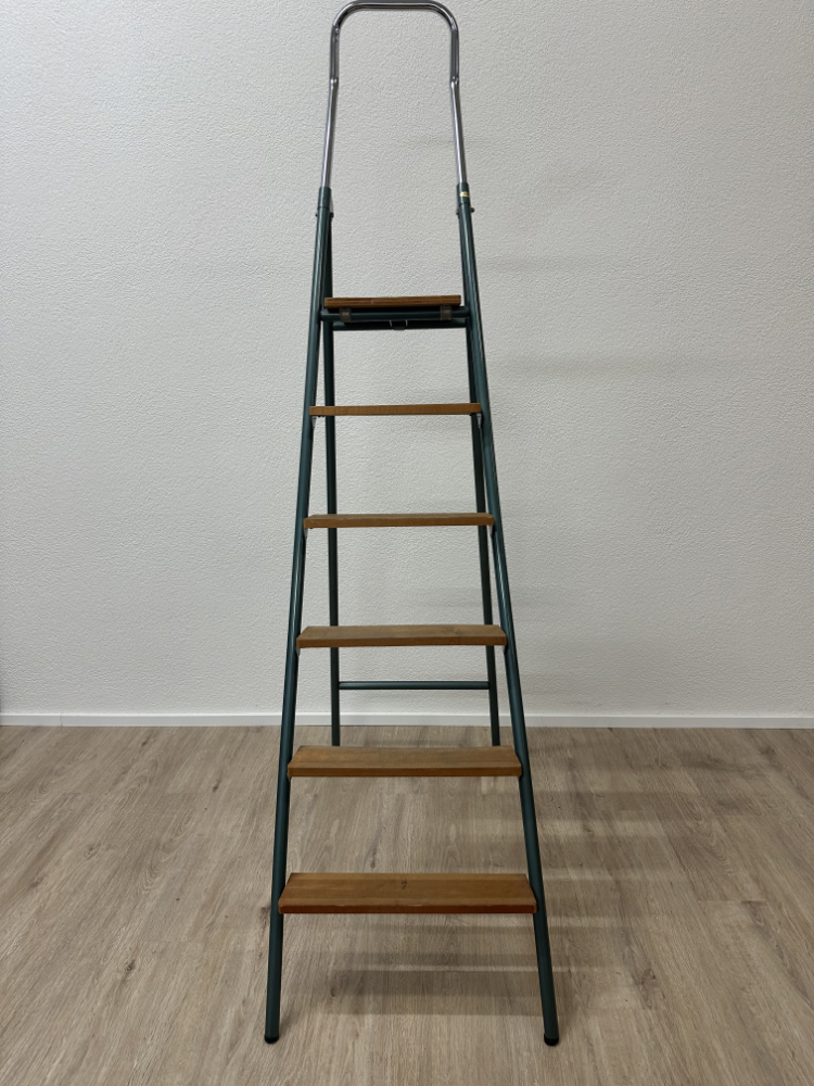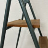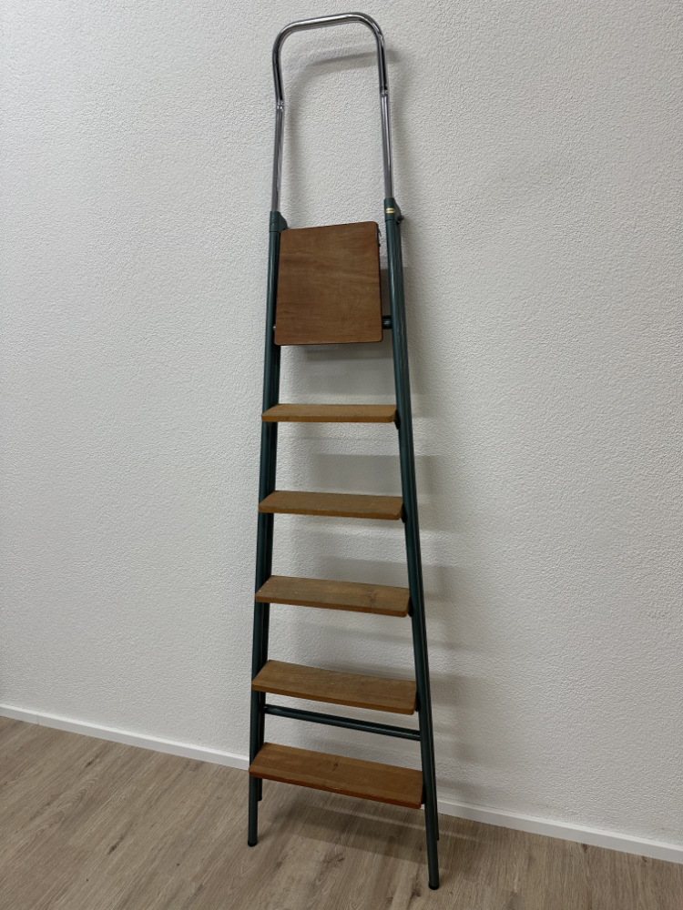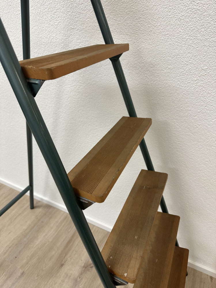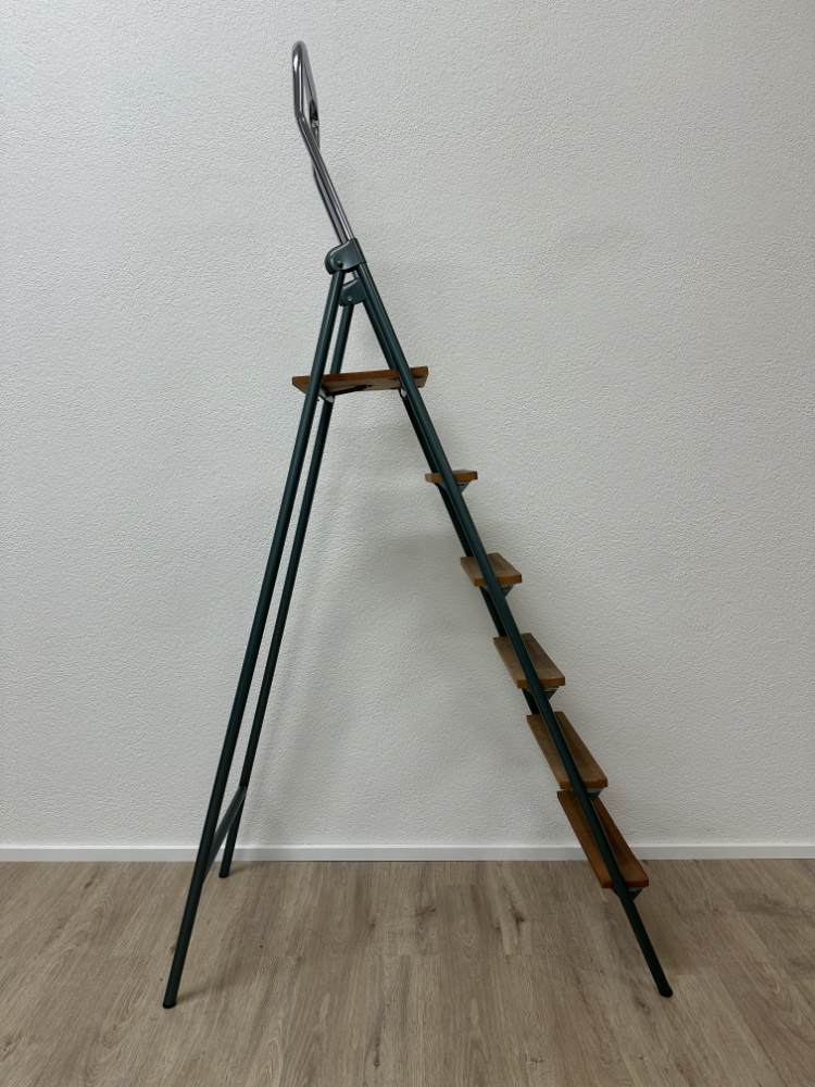 Grün lackiertes Metallgestell, warme Holzstufen und oben ein verchromter Haltebügel: Diese Escalux Klappleiter wirkt wie ein klassischer Haushaltshelfer aus der Zeit, als Dinge noch für Jahrzehnte gebaut wurden. Zusammengeklappt steht sie schlank an der Wand, aufgeklappt bietet sie mit den breiten Trittflächen sicheren Halt für Alltag, Lager, Atelier oder Laden.