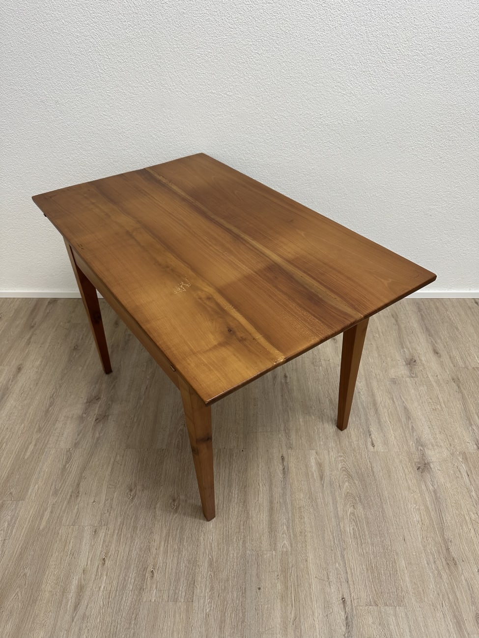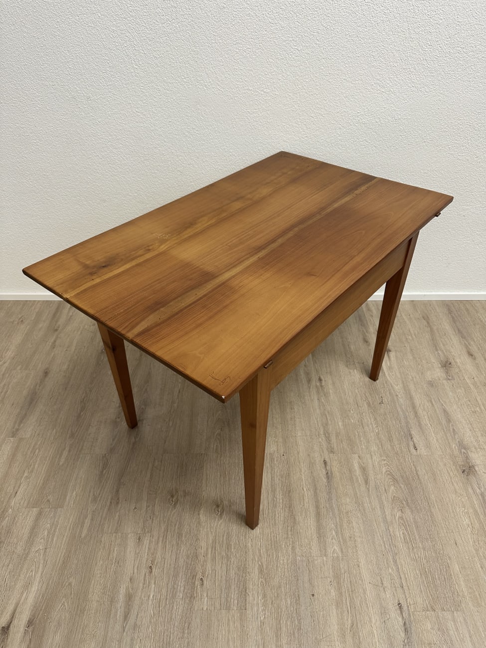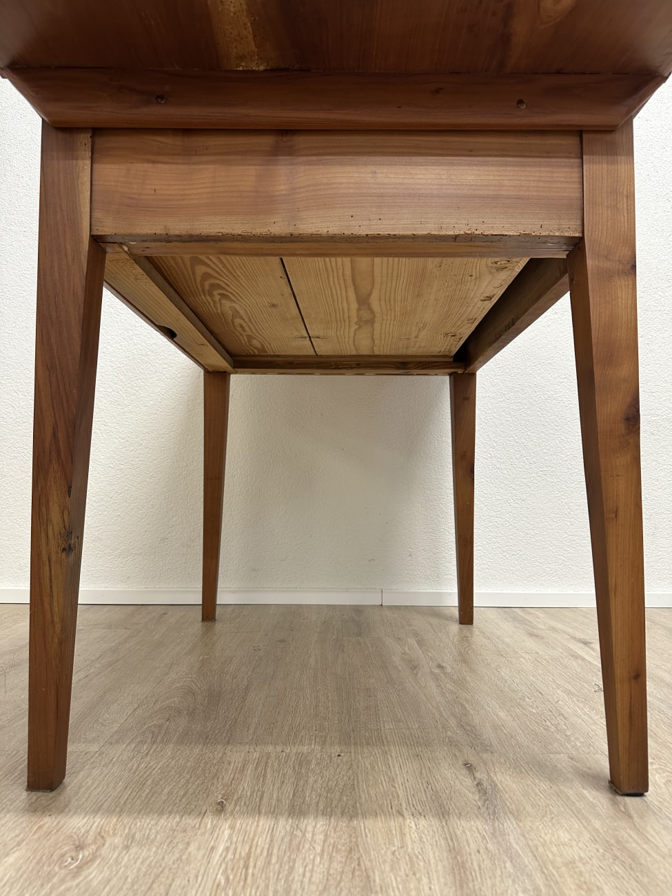 Massives Holz mit sichtbaren Ästen und warmer Farbgebung macht diesen Tisch sofort wohnlich. Die Oberfläche zeigt die typische Kieferstruktur mit lebendiger Maserung und natürlichen Unregelmässigkeiten. Praktisch ist die integrierte Schublade mit Unterteilung, ideal für Besteck oder kleine Dinge im Alltag. Die klare, stabile Bauweise passt gut in Küchen oder Essbereiche, wo es unkompliziert und gemütlich sein darf.