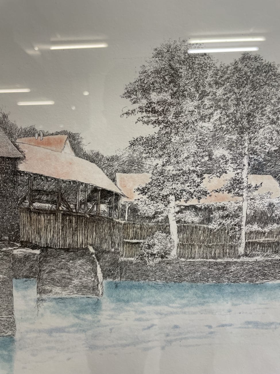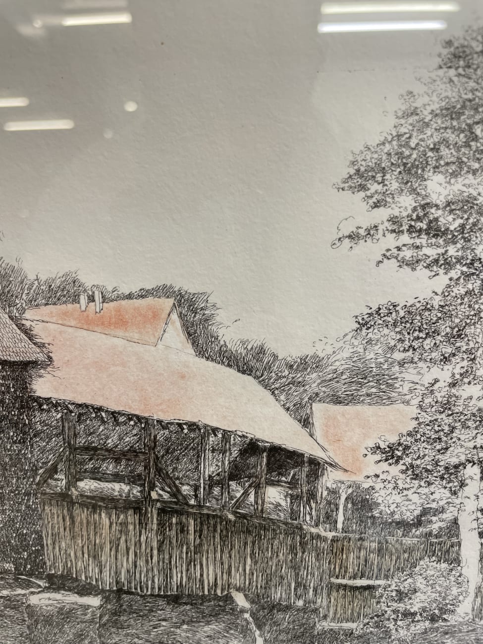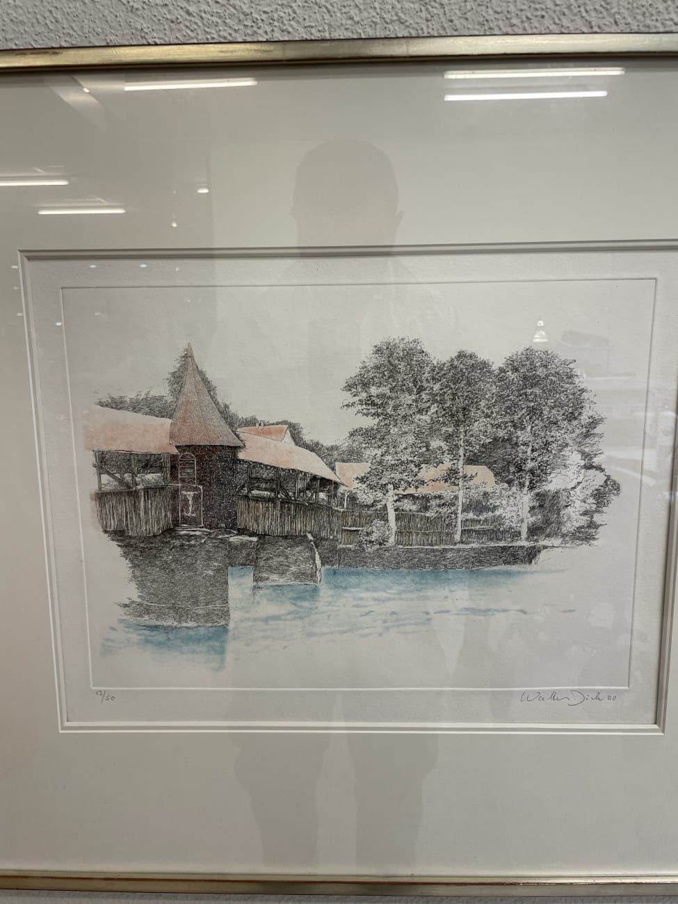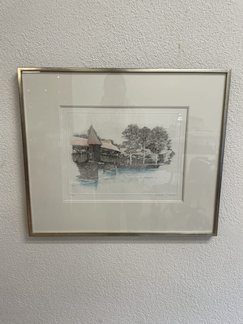 Eine fein gearbeitete Farbradierung mit Blick auf die bekannte Spreuerbrücke in Luzern. Das Motiv zeigt die historische Holzbrücke mit Turm, Uferbereich und Baumbestand. Schwarze Linienarbeit mit dezenten Farbakzenten im Wasser und auf den Dachflächen geben der Szene Tiefe und eine ruhige Atmosphäre. Unten rechts handsigniert „Walter Dick 88“, links nummeriert 13/50. Auf der Rückseite befindet sich das originale Etikett der Kunsthandlung Twerenbold Söhne AG, Luzern, mit Angaben zur Technik und Grösse.