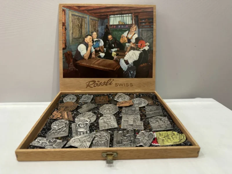 Fasnacht Plaketten aus Stans, präsentiert in einer attraktiven Rössli-Kiste befindet sich in einem guten bis sehr guten Zustand. Diese reizvollen Fasnacht Plaketten, ausgestellt in einer ansprechenden Rössli-Kiste, umfassen eine Sammlung von den Jahren 1965 bis 1998. Sie richten sich an Sammler, eignen sich aber auch hervorragend als dekoratives Element für das Zuhause.