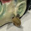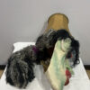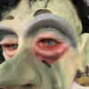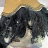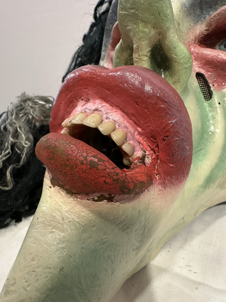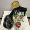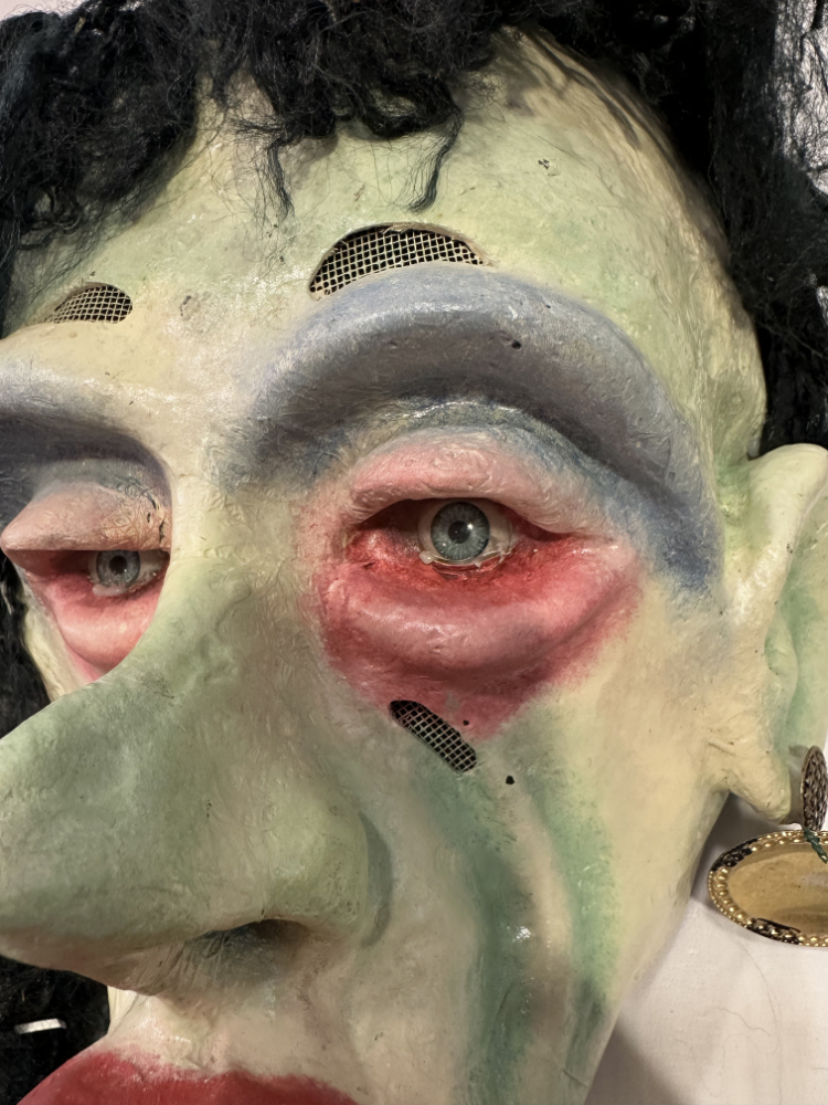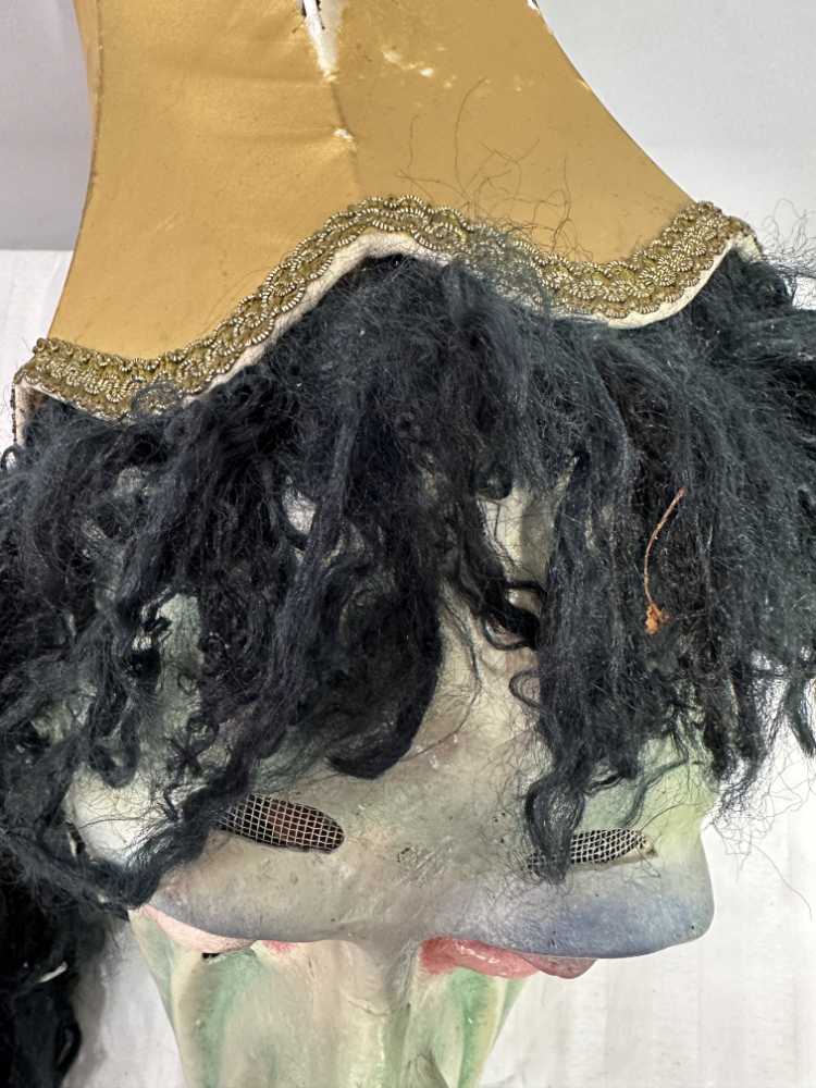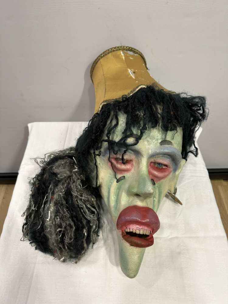 Eine eindrucksvolle Hexenmaske aus handwerklicher Fertigung, expressiv, grotesk und voller Charakter. Das Gesicht zeigt verzerrte Züge mit grüner Haut, roten Augenrändern, hervortretenden Lippen und eingesetzten Glasaugen. Dichtes schwarzes Wollhaar und ein gelber Lampenschirm mit goldener Borte bilden den auffälligen Kopfschmuck.
