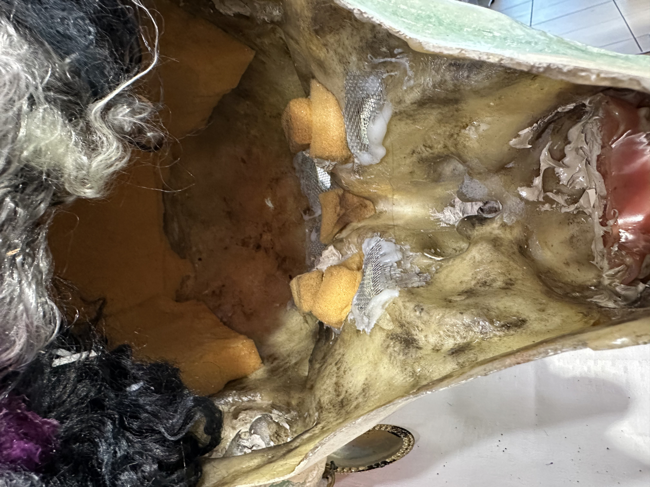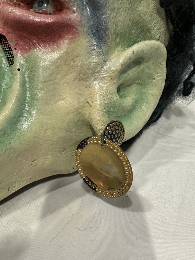 Die Maske wurde aus glasfaserverstärktem Kunststoff gefertigt, innen mit Schaumstoff und Drahtgeflecht verstärkt. Farbauftrag, Struktur und Details wie Zähne, Falten und Ohrringe zeigen deutlich die Handschrift eines erfahrenen Maskenbauers. Ein rares Einzelstück aus der Schweizer Fasnachtstradition, das heute als Sammlerobjekt oder außergewöhnliche Wanddekoration begeistert.