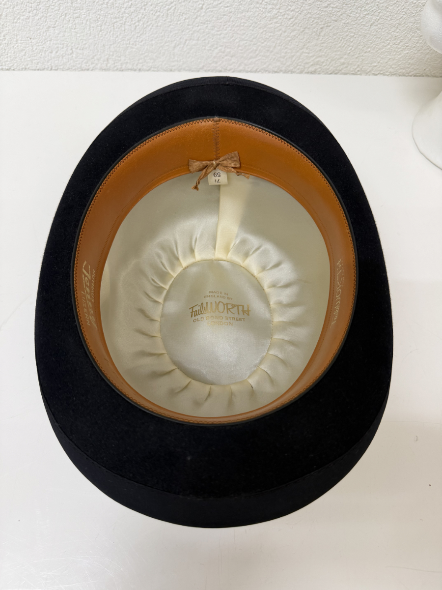 Schwarzer Bowler mit sauberer, runder Form und feinem Band rundum. Innen mit heller Satinfütterung, Leder Schweissband und mehreren Prägungen: Feltworth Old Bond Street London, dazu Huthaus Jenny Luzern. Ein elegantes Stück für Anzug, Bühne oder stilvolle Alltagslooks.