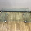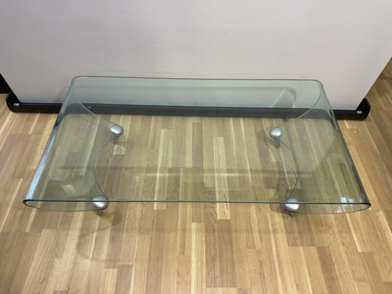 Dieser edle Couchtisch stammt vom renommierten italienischen Hersteller FIAM Italia, bekannt für hochwertiges Design aus gebogenem Glas. Das Modell vereint moderne Leichtigkeit mit technischer Raffinesse: Die beiden Seitenteile aus gebogenem Glas bilden einen harmonischen Rahmen, während die flache Glasplatte mittig durch vier elegante Aluminiumfüsse gehalten wird. Die organisch geschwungene Linienführung wirkt wie aus einem Guss – ein stilvoller Blickfang für moderne Wohnräume.