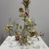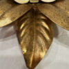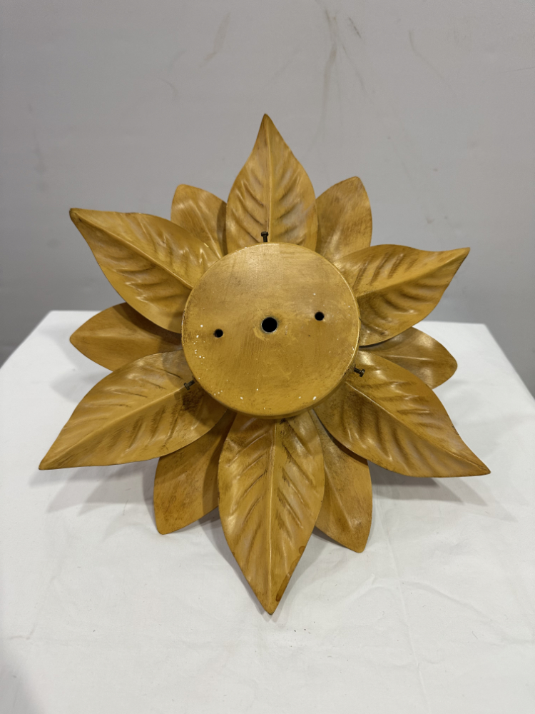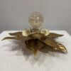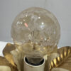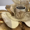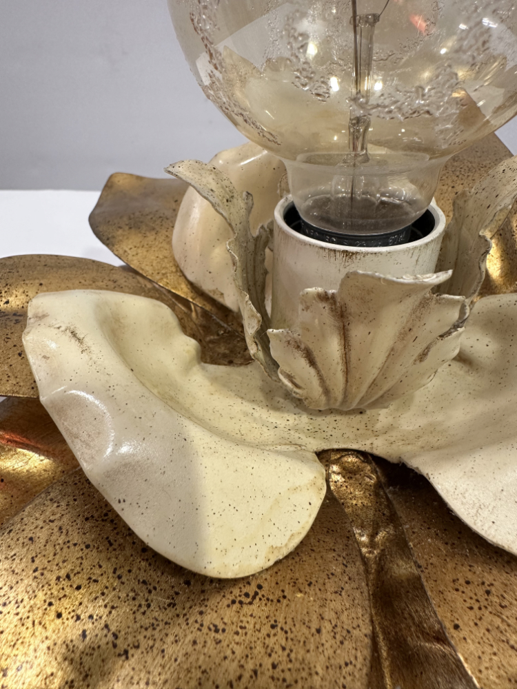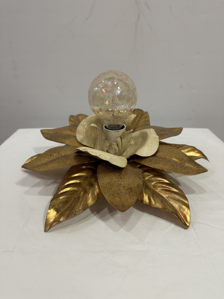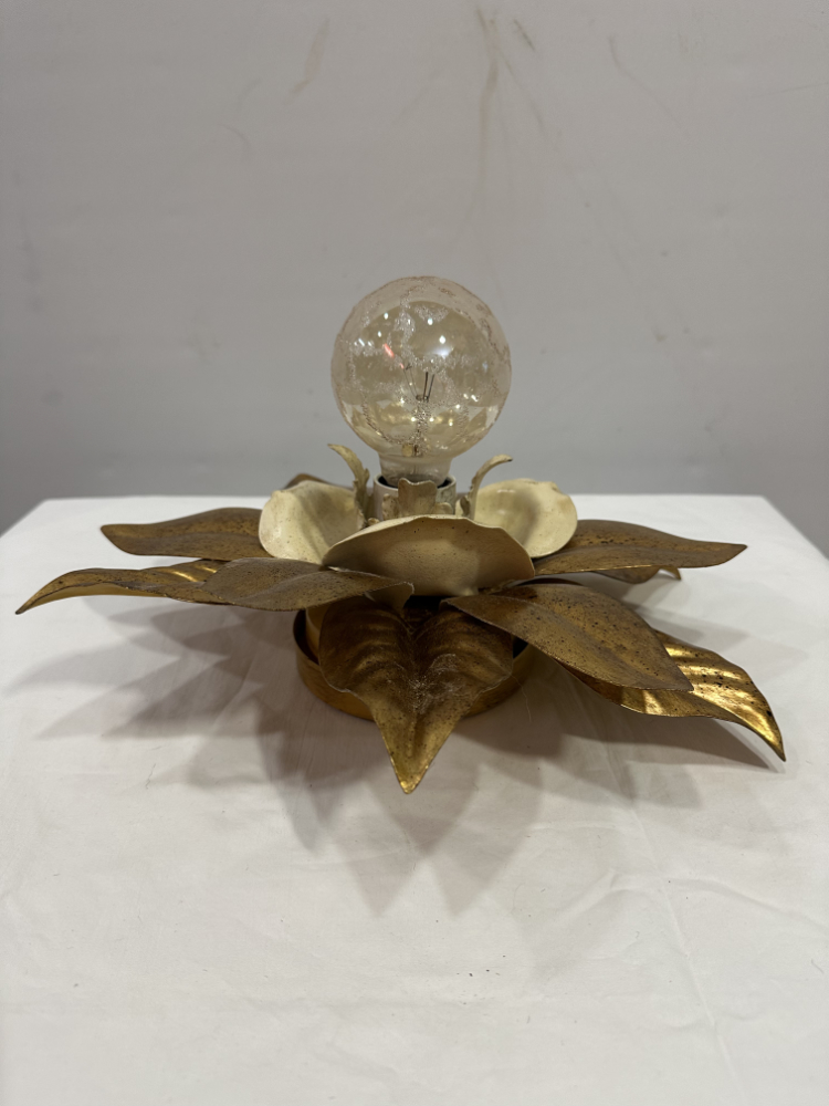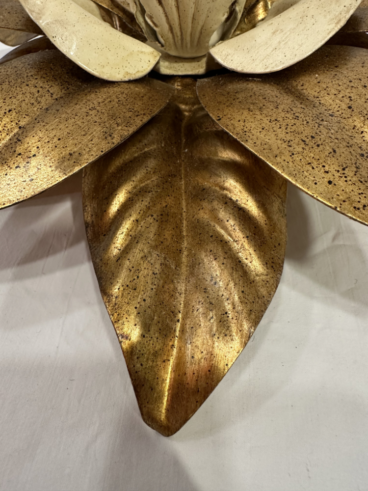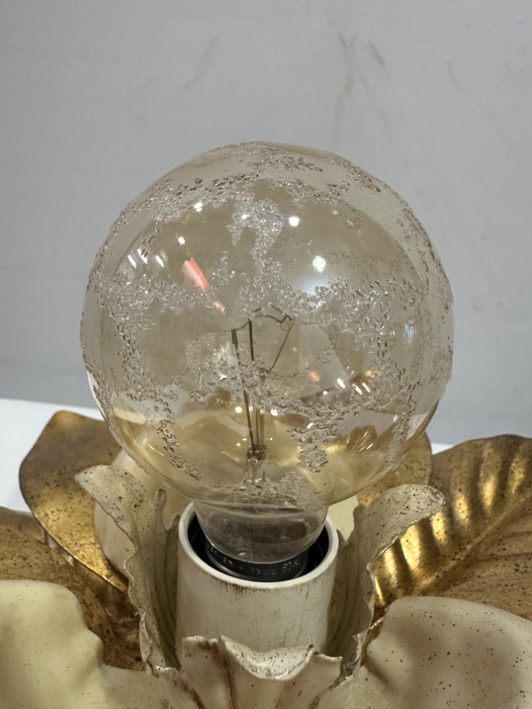 Diese dekorative Wandleuchte vereint handwerkliche Metallgestaltung mit floralem Design. Die Form erinnert an eine geöffnete Blüte, deren geschwungene Blätter in Gold- und Cremetönen schimmern. In der Mitte sitzt eine runde Glühbirne, die das Licht sanft über die metallisch strukturierte Oberfläche verteilt. Durch die Kombination von Goldpatina und cremefarbener Lackierung entsteht ein harmonischer Vintage Look, der sowohl einzeln als auch in Kombination mit weiteren Leuchten effektvoll wirkt.