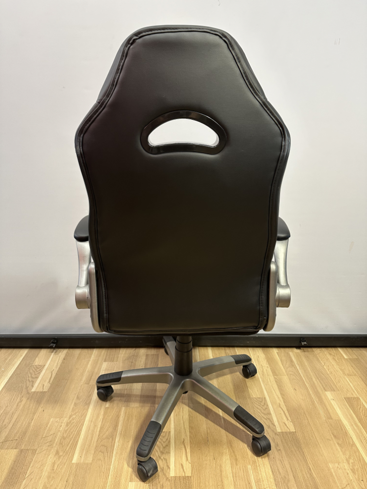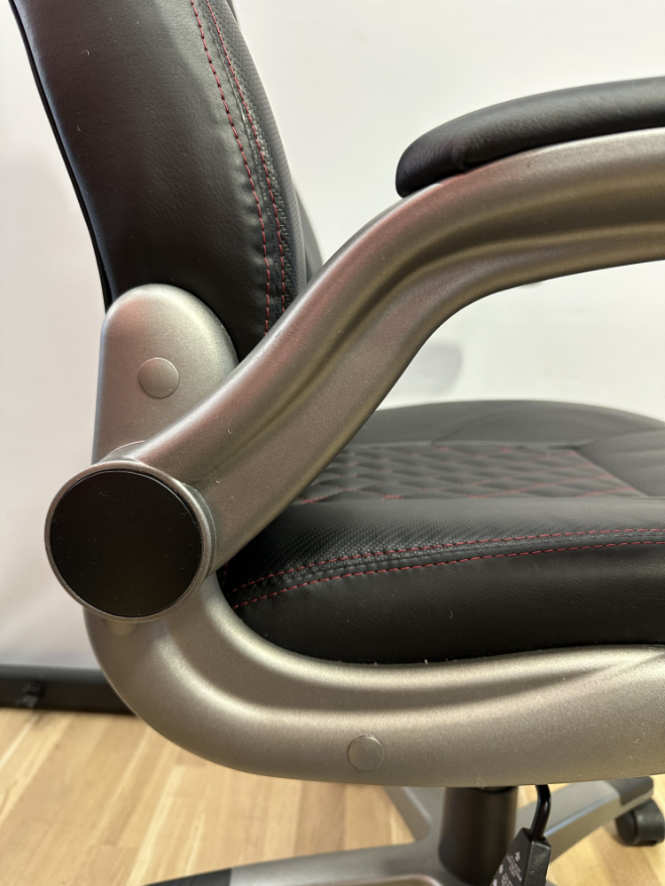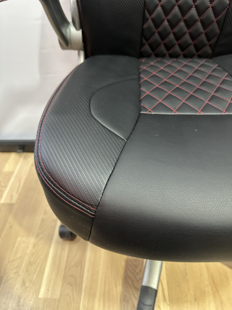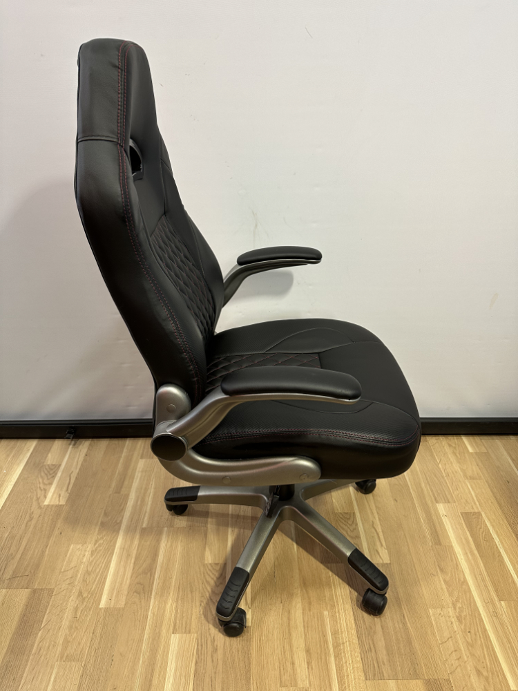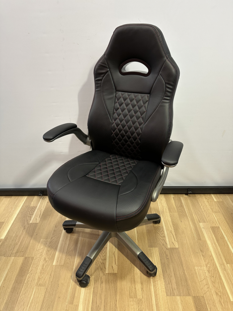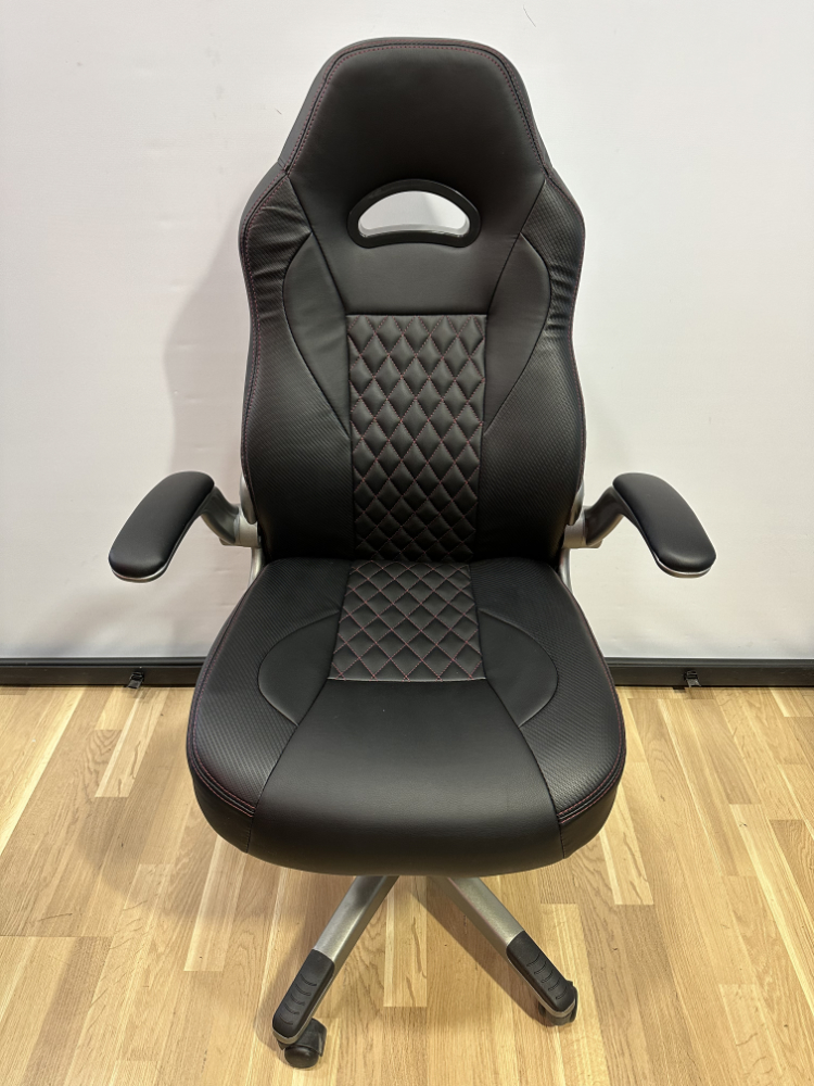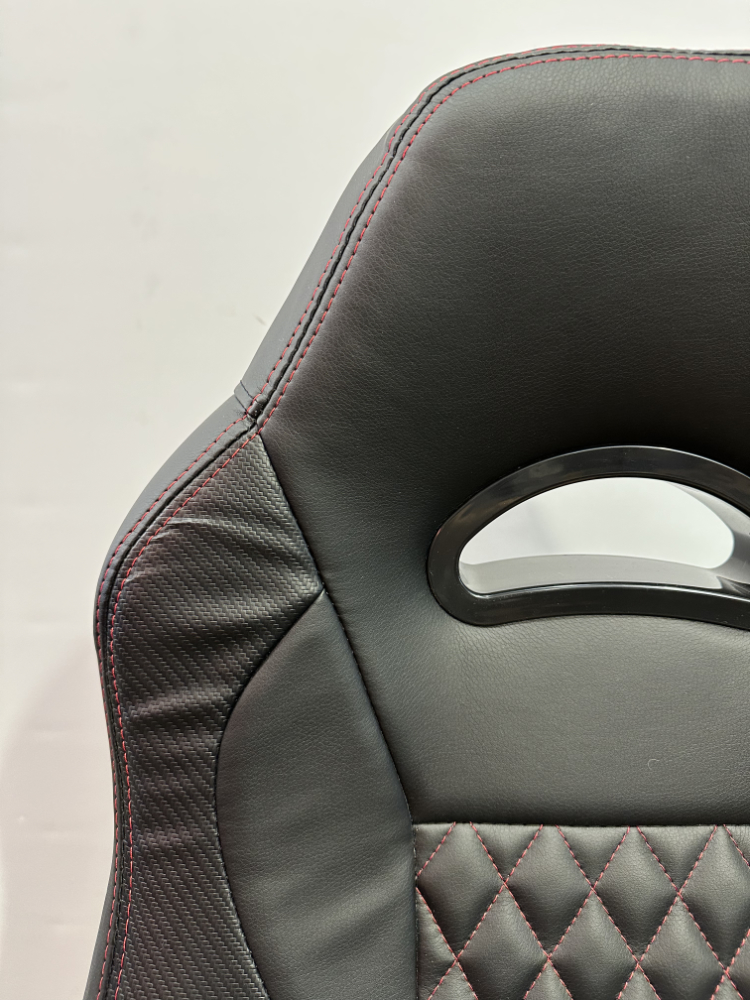 Dieser drehbare Stuhl verbindet sportliches Design mit funktionaler Ergonomie. Der Bezug aus schwarzem Kunstleder mit roten Rauten-Nähten sorgt für einen dynamischen Look, während die weiche Polsterung und die hohe Rückenlehne besten Komfort bieten. Die geschwungene Form unterstützt den Rücken optimal – perfekt für konzentriertes Arbeiten oder längere Gaming-Sessions.