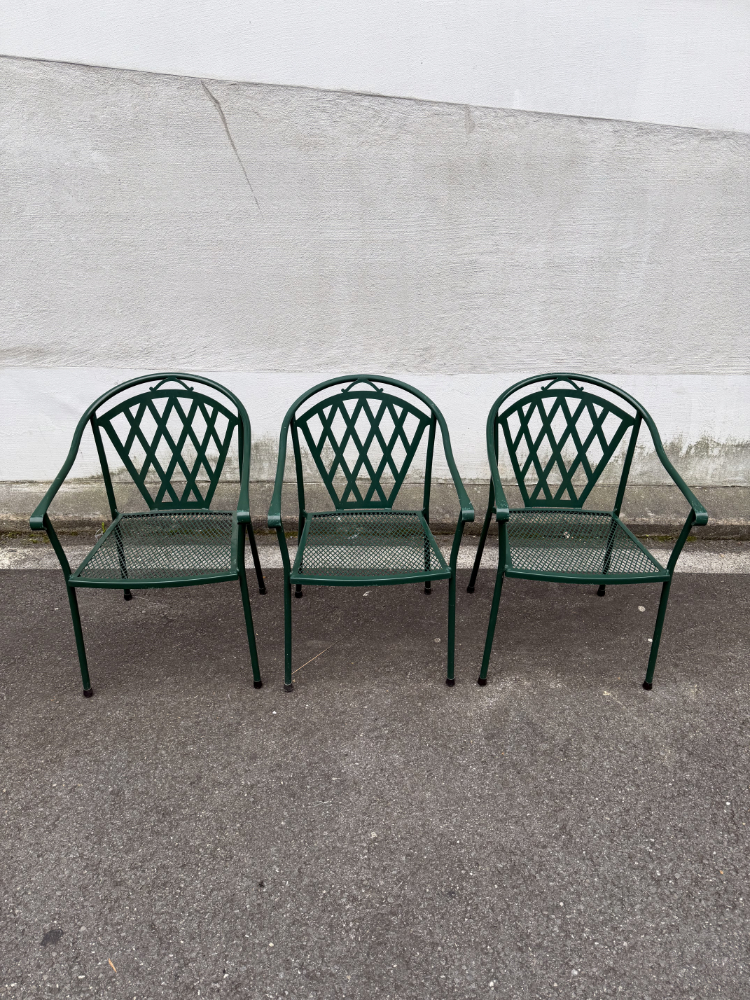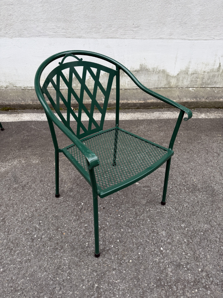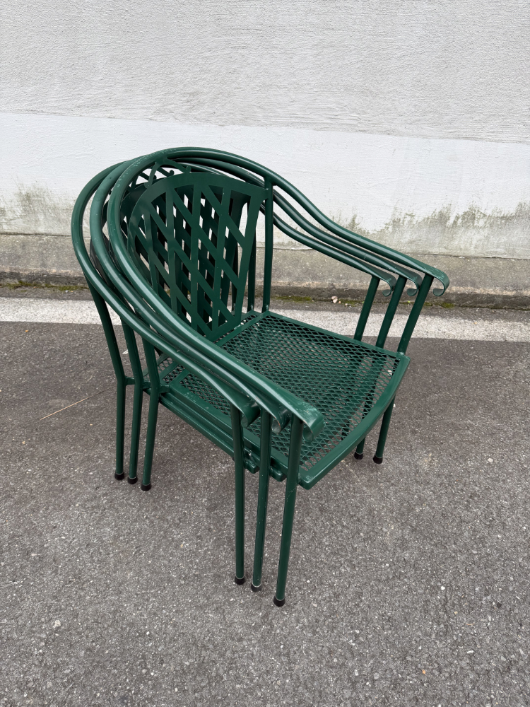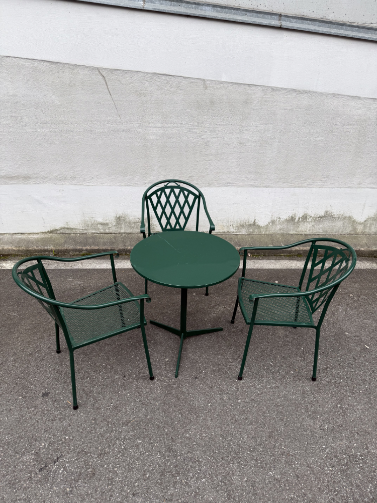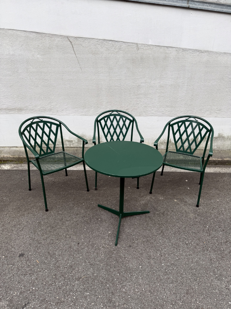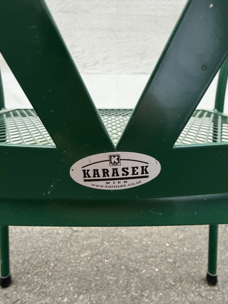 Dieses wetterfeste Garten-Set von Karasek Wien steht für österreichische Qualitätsarbeit und zeitloses Design. Das Ensemble besteht aus drei stapelbaren Sesseln mit Rautenrückenlehne und einem runden Klapptisch, alle aus pulverbeschichtetem Metall in elegantem Dunkelgrün.