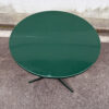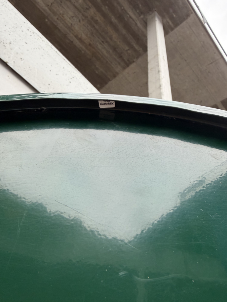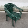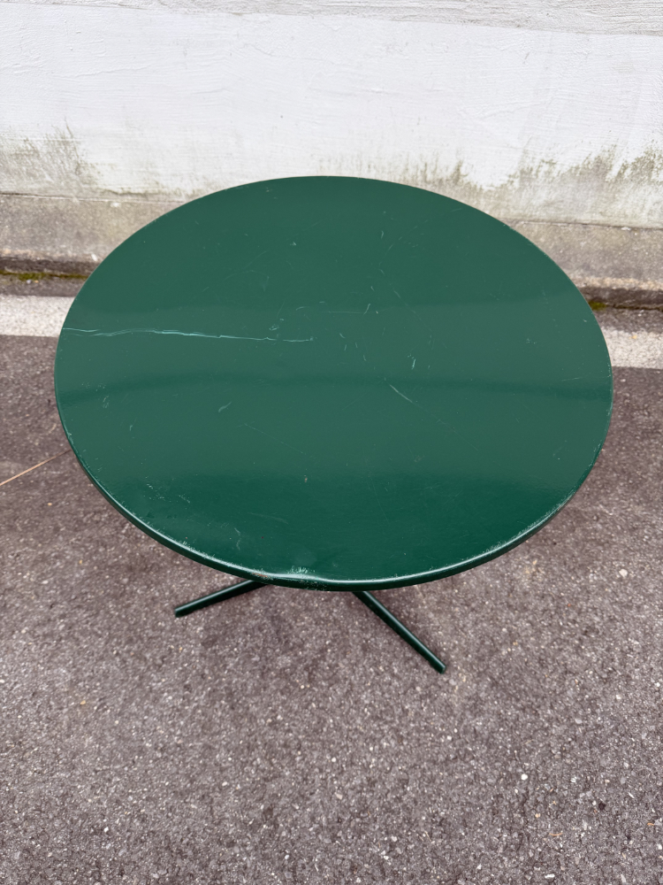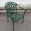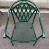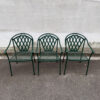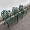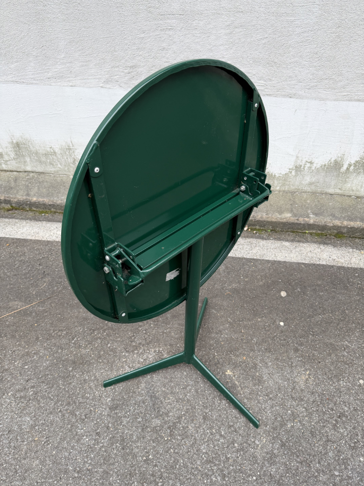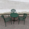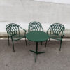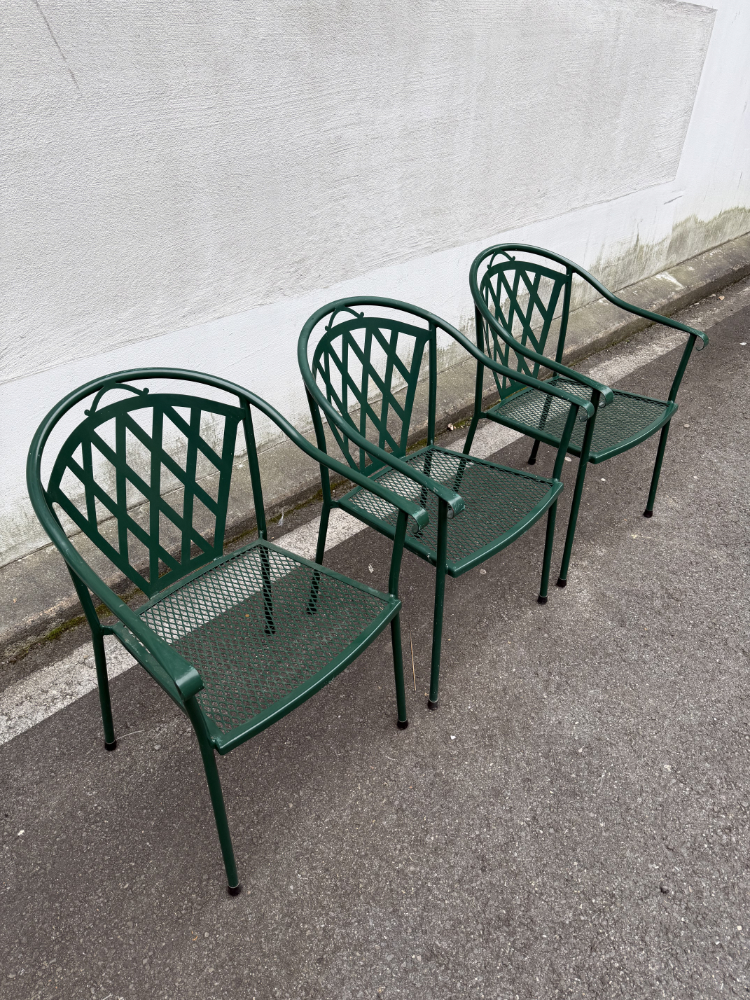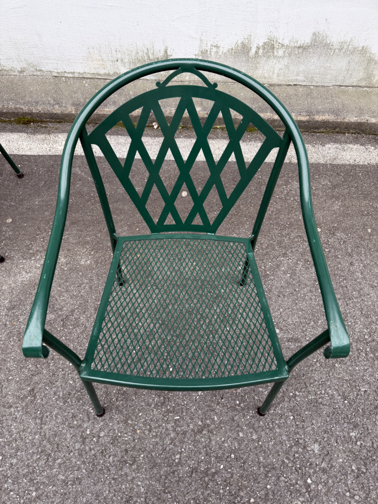 Dieses wetterfeste Garten-Set von Karasek Wien steht für österreichische Qualitätsarbeit und zeitloses Design. Das Ensemble besteht aus drei stapelbaren Sesseln mit Rautenrückenlehne und einem runden Klapptisch, alle aus pulverbeschichtetem Metall in elegantem Dunkelgrün.