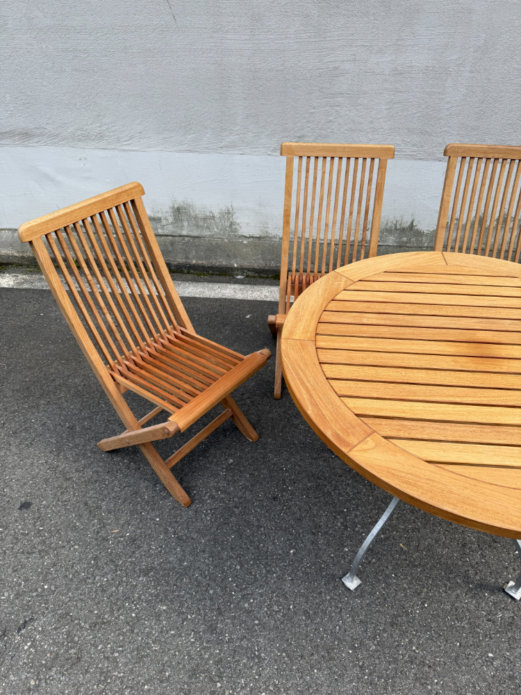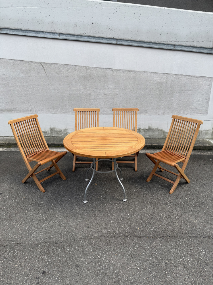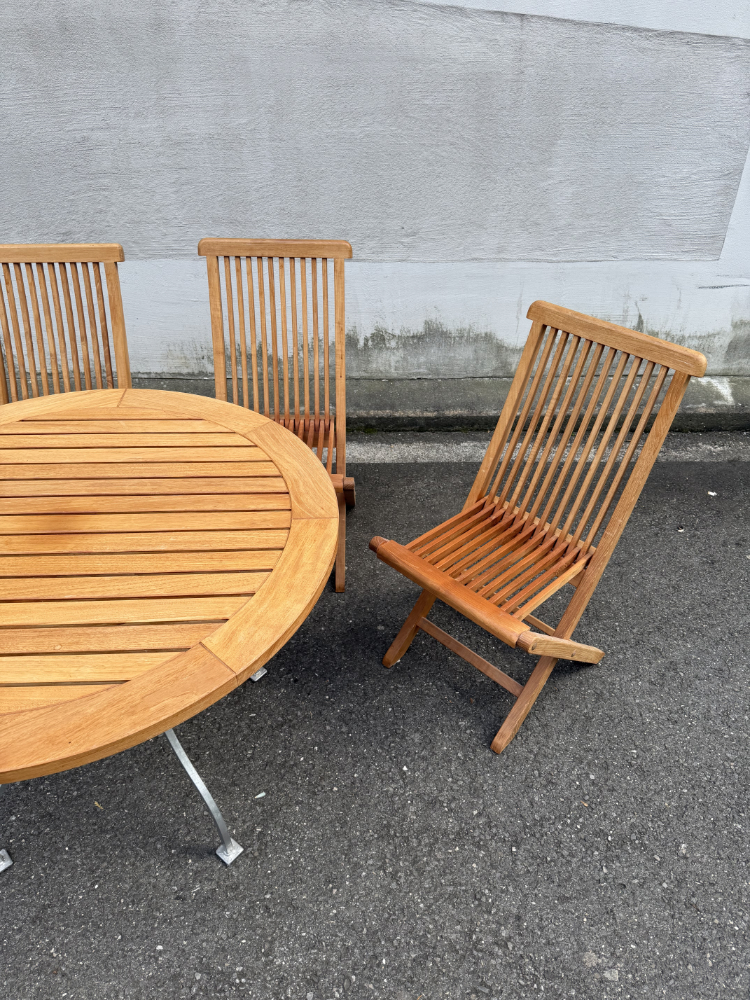 Dank der klappbaren Stühle lässt sich das Set platzsparend verstauen und eignet sich perfekt für Balkon, Terrasse oder Garten. Nachhaltig, langlebig und zeitlos im Design – ideal für stilvolles Outdoor-Wohnen.