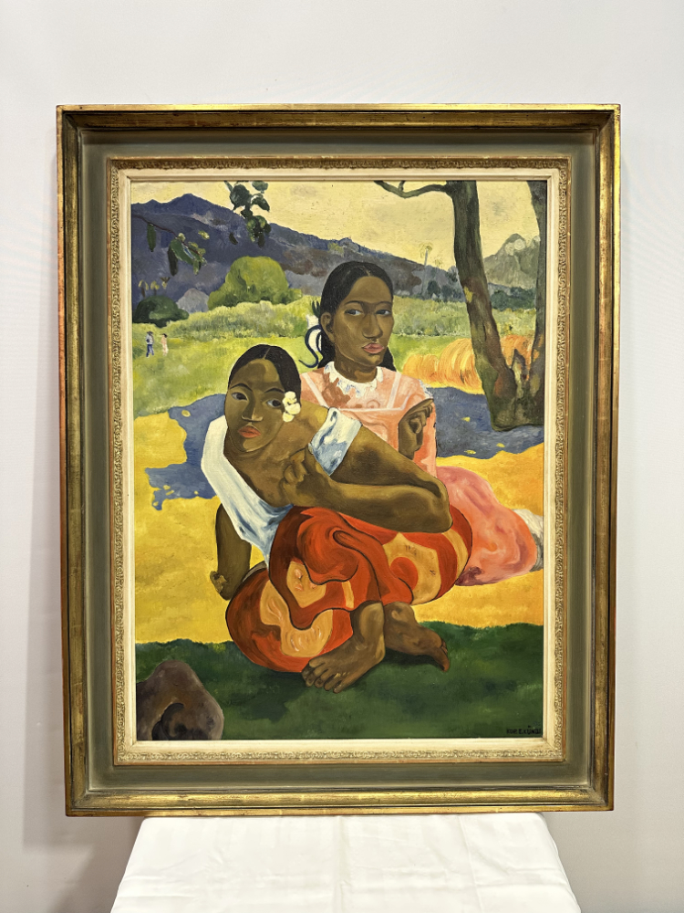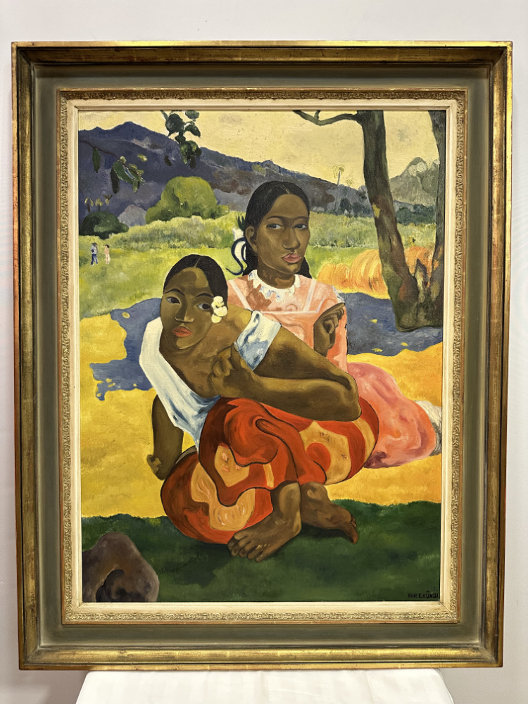 Dieses Ölbild stammt von Erwin Künzli (1925–2023) und zeigt eine eindrucksvolle Nachbildung des berühmten Gemäldes „Nafea faa ipoipo“ (Wann heiratest du?) von Paul Gauguin aus dem Jahr 1892. Zwei polynesische Frauen sitzen in einer farbintensiven Landschaft, umgeben von tropischem Licht und leuchtenden Farben – eine Szene voller Ruhe, Symbolik und Wärme.