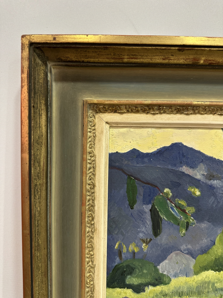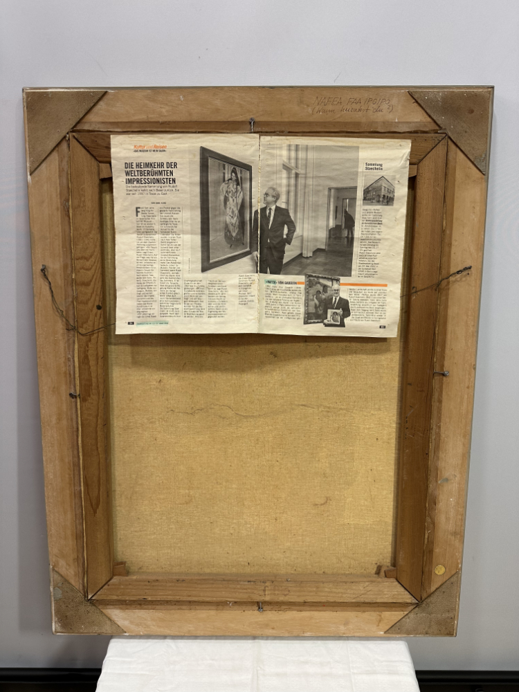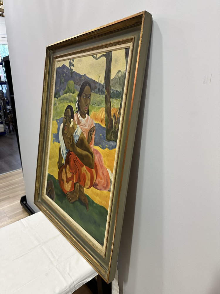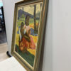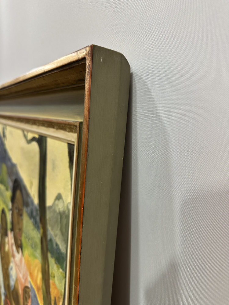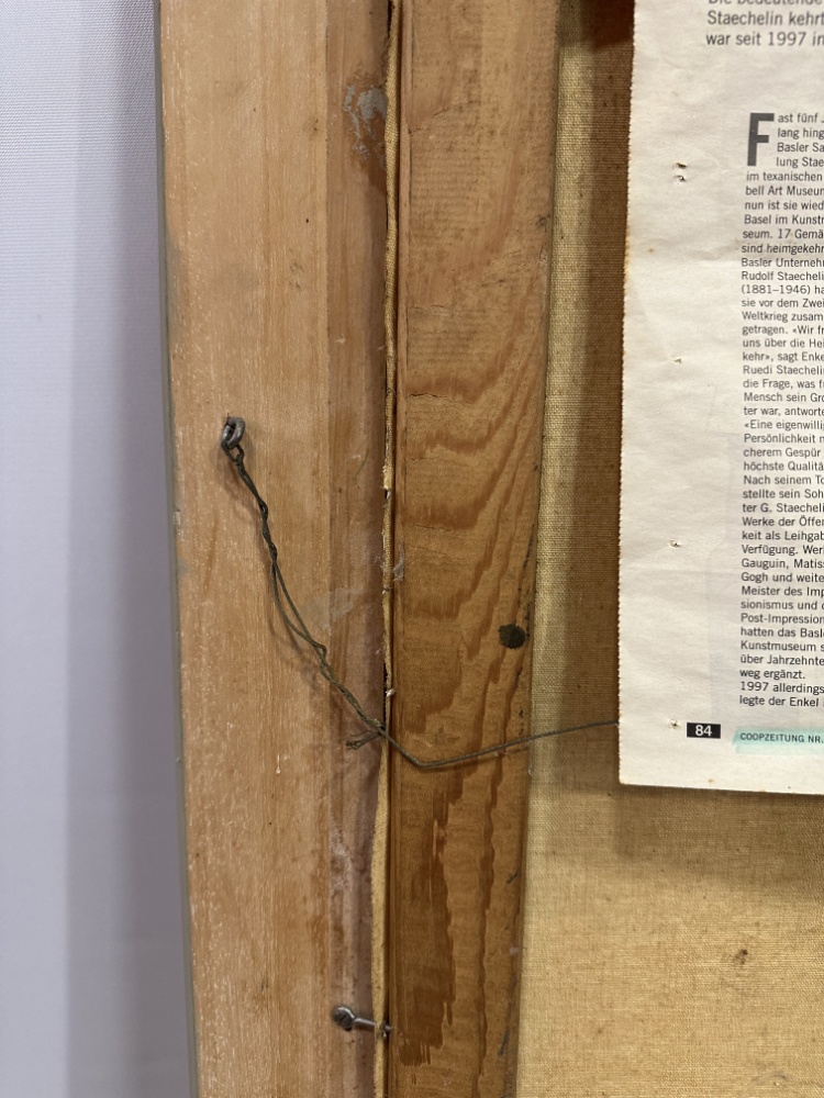 Das Gemälde ist in einem breiten, vergoldeten Holzrahmen mit dezent patinierter Oberfläche gefasst. Auf der Rückseite befindet sich ein Zeitungsausschnitt aus der Coopzeitung von 2002 über die Sammlung Rudolf Stächelin, in der das Originalbild von Gauguin gezeigt wurde – ein interessanter historischer Bezug.