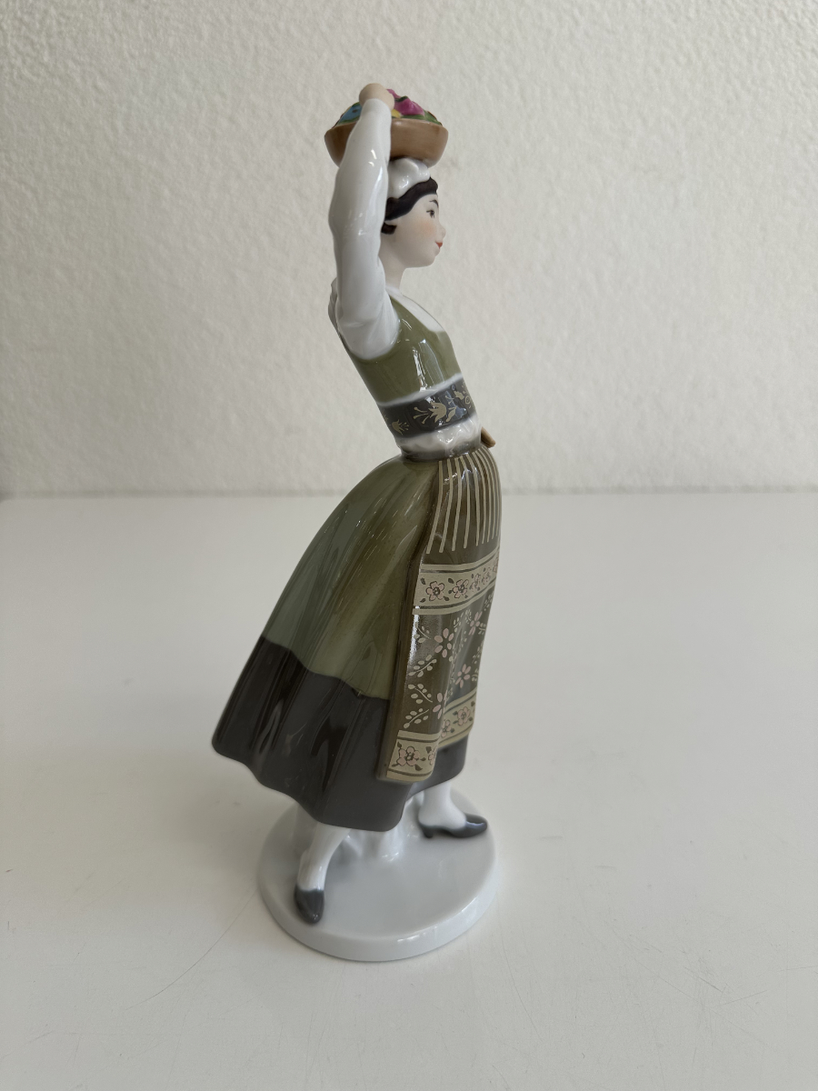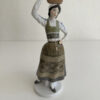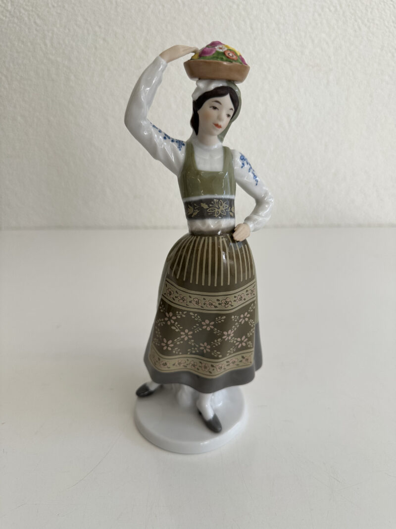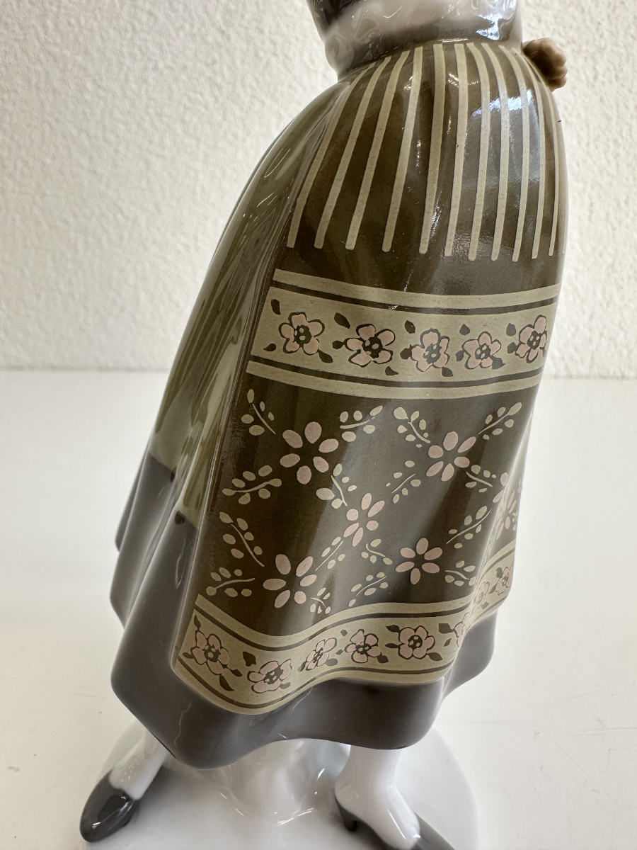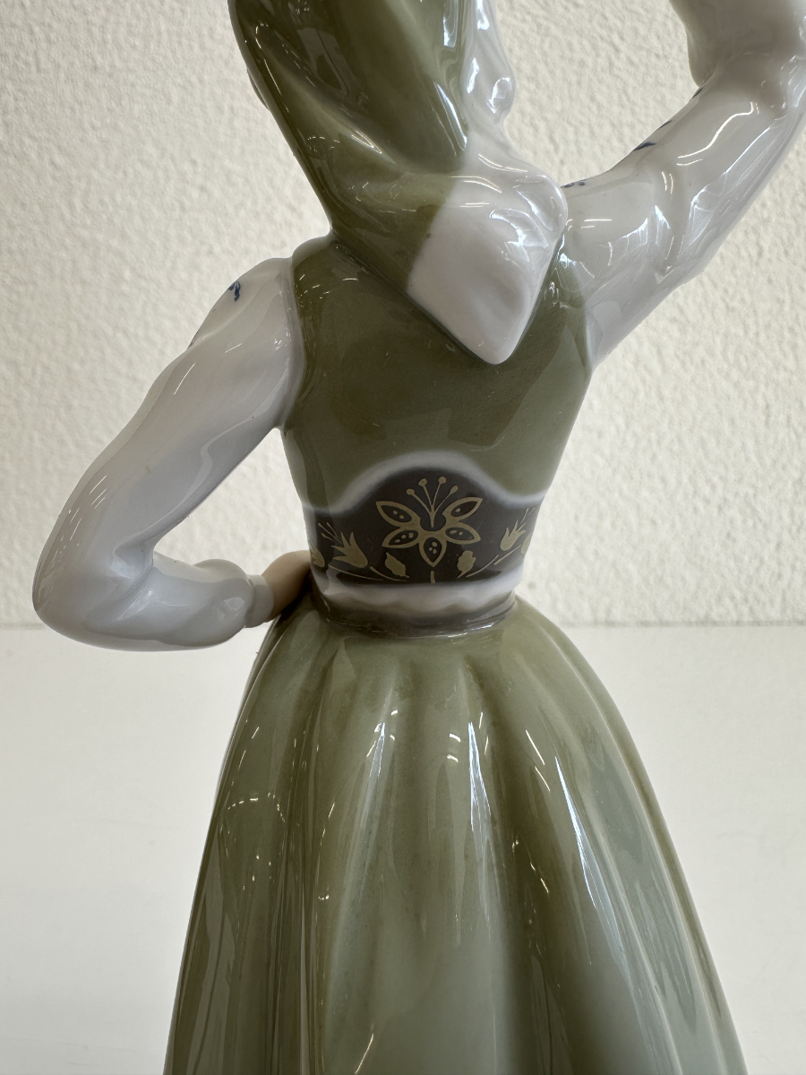 Grün- und Grautöne dominieren das Kleid, kombiniert mit feinen floralen Mustern auf Schürze und Rock. Blaue Blütenmotive auf den Ärmeln sowie goldfarbene Akzente am Mieder setzen elegante Kontraste. Die Figur steht auf einem runden Sockel und wirkt durch ihre leicht geneigte Haltung lebendig und anmutig.