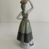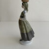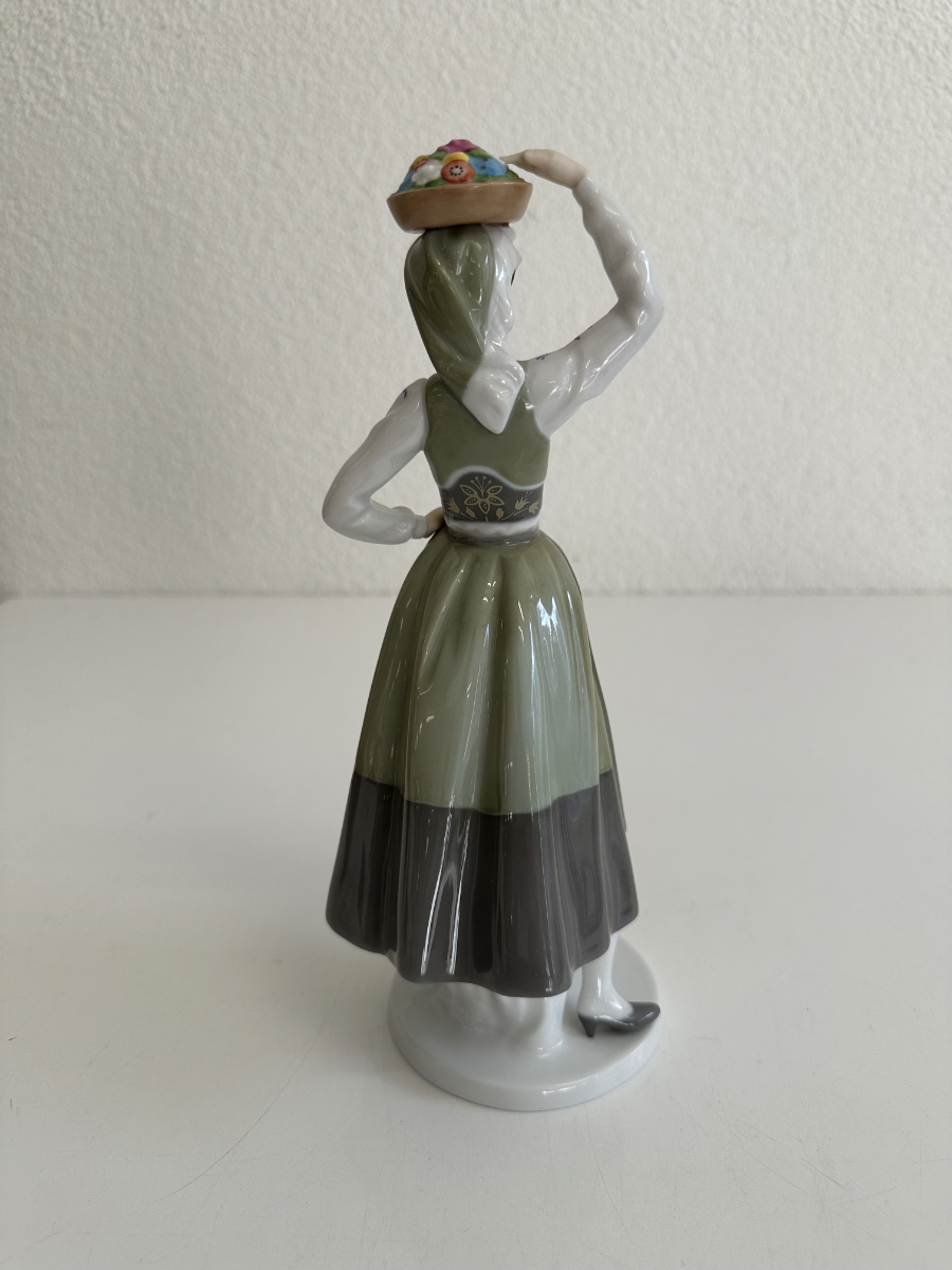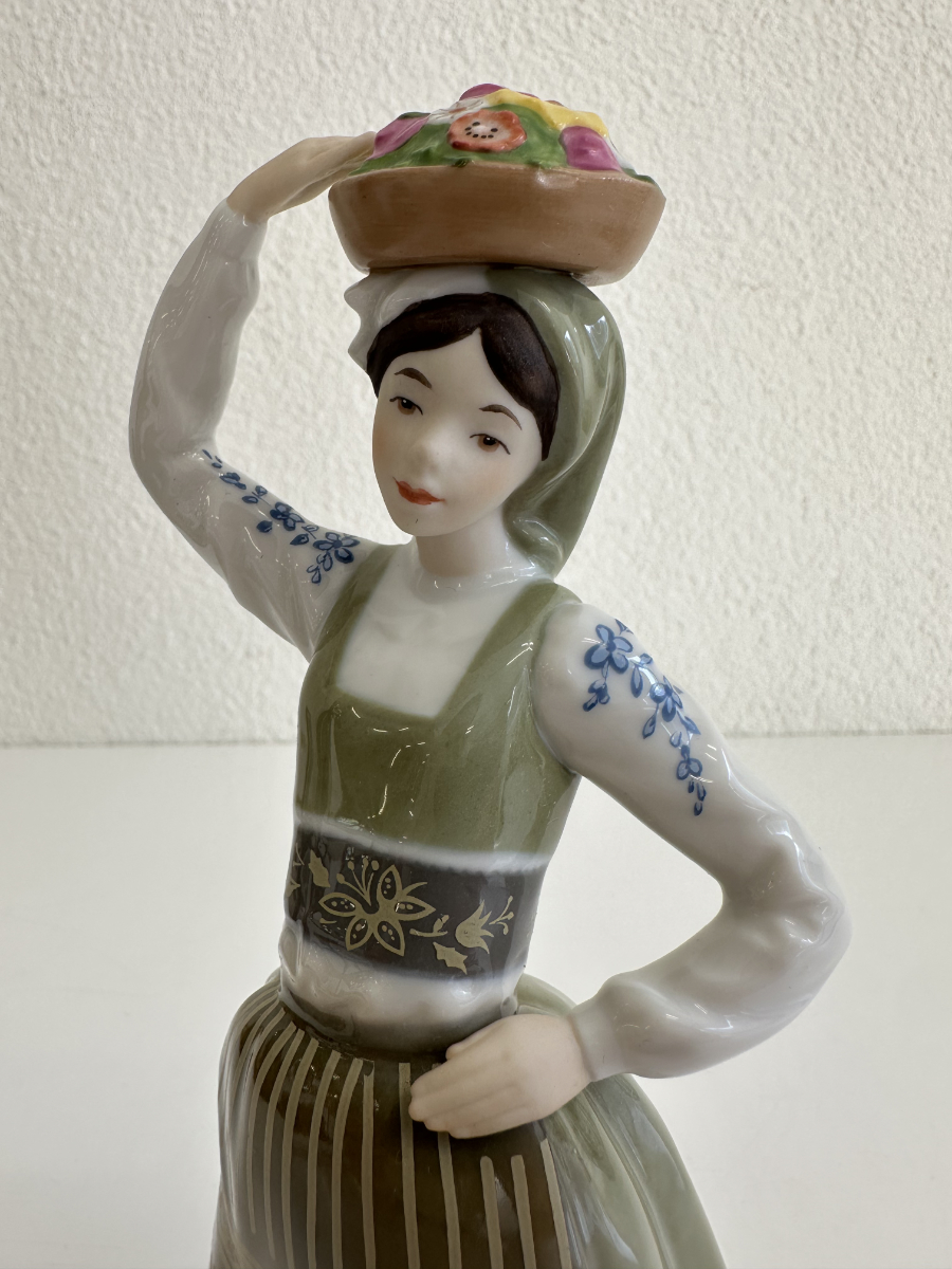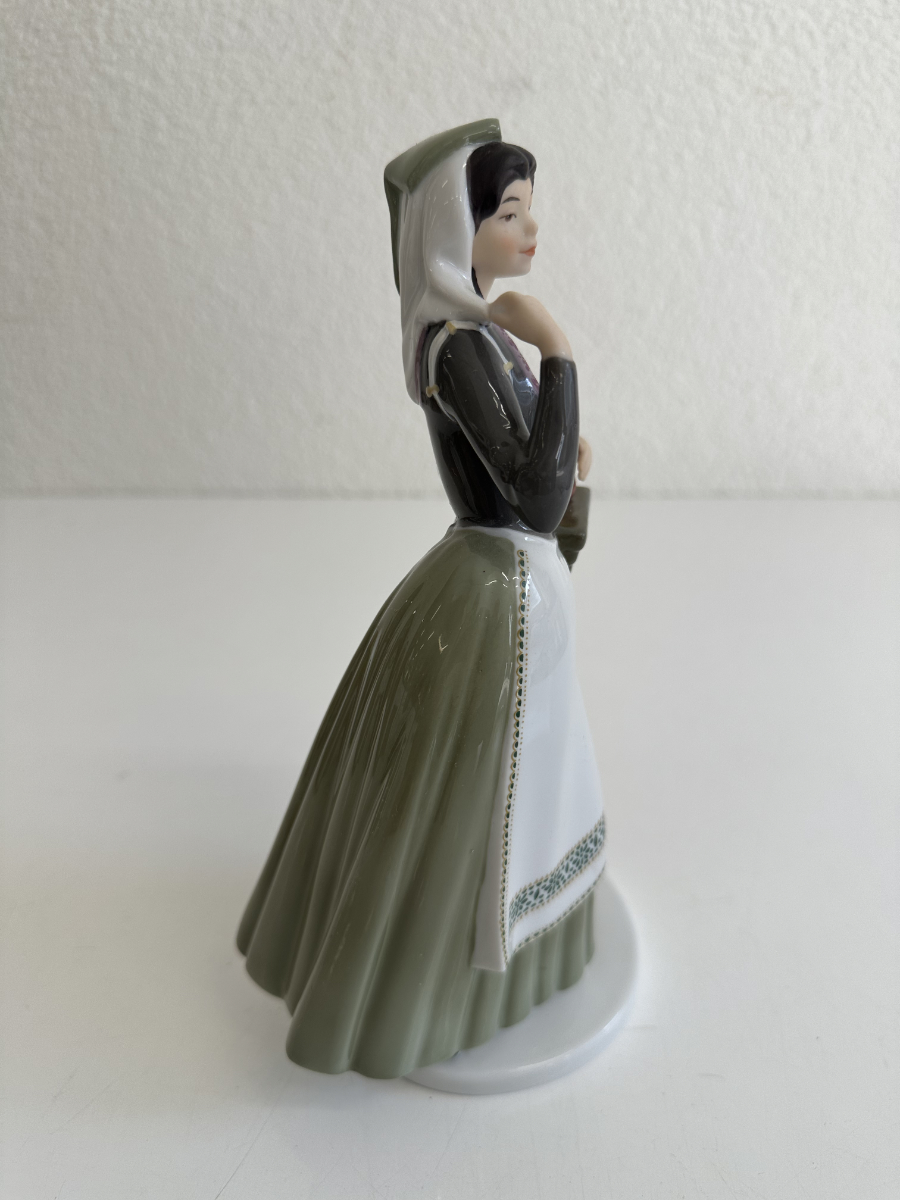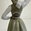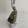 Grün- und Grautöne dominieren das Kleid, kombiniert mit feinen floralen Mustern auf Schürze und Rock. Blaue Blütenmotive auf den Ärmeln sowie goldfarbene Akzente am Mieder setzen elegante Kontraste. Die Figur steht auf einem runden Sockel und wirkt durch ihre leicht geneigte Haltung lebendig und anmutig.
