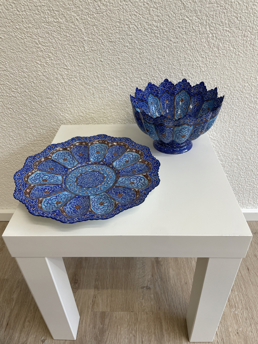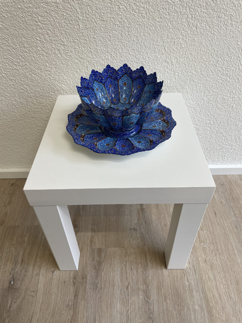 Handbemalte persische Emaille Schale mit passendem Teller in Blau