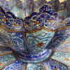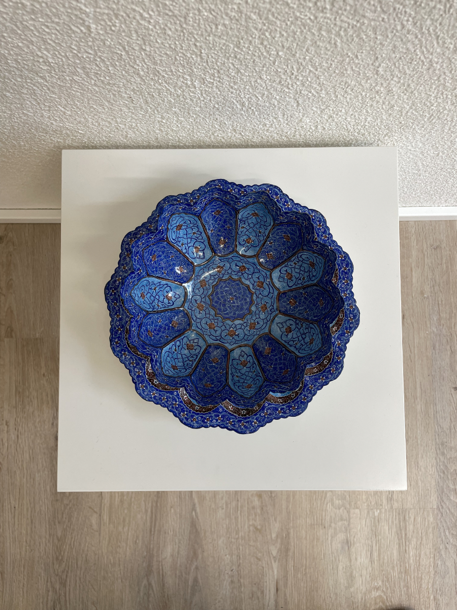 Intensive Blautöne, feine Linienführung und eine ausgewogene Ornamentik prägen dieses zweiteilige Set aus Schale und Teller. Die Dekoration folgt klassischen persischen Mustern mit floralen und geometrischen Elementen, sorgfältig von Hand aufgetragen und mit goldfarbenen Akzenten veredelt. Jede Fläche ist detailliert ausgearbeitet, ohne überladen zu wirken.