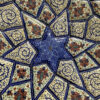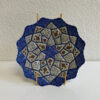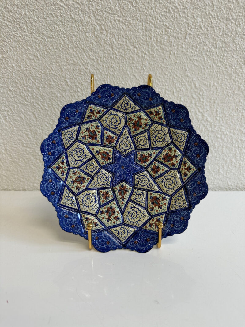 Klare Geometrie trifft auf feine Ornamentik. Dieser handbemalte persische Emaille-Wandteller zeigt ein vielschichtiges Sternmuster aus ineinandergreifenden Flächen, ausgearbeitet in tiefem Kobaltblau, warmem Cremegrund und rotbraunen floralen Akzenten. Punktornamente und geschwungene Linien sorgen für Tiefe und Rhythmus, ohne das Gesamtbild zu überladen. Die Komposition wirkt ruhig, ausgewogen und typisch für traditionelle Minakari-Arbeiten.