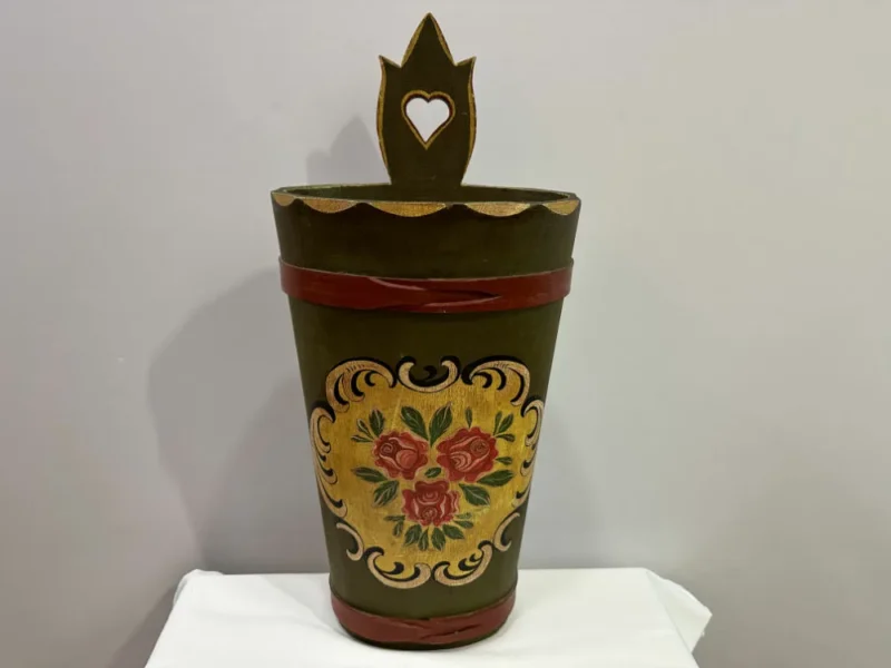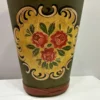 Handbemalter Schirmständer / Regenschirmhalter mit Bauermalerei befindet sich in einem guten bis sehr guten Zustand. Dieser hübsche Regenschirmhalter ist in einem altgrün gehalten. Darauf befinden sich handbemalte Bauermalereien die in Mitte mit drei hübschen Rosen verziert wurden. Er ist typisch zu gebrauchen um Regenschirme darin zu verstauen. Man kann ihn je nach Beliebigkeit auch anderweitig gebrauchen.