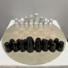 Ein außergewöhnliches Unikat für Freunde des minimalistischen Designs: Dieses handgefertigte Schachspiel kombiniert rustikales Kunsthandwerk mit modernem Purismus. Die Figuren bestehen aus Keramik, jeweils in Schwarz und Weiss glasiert, und zeigen eine bewusst reduzierte, konische Form. Das Spielbrett ist aus echtem Naturstein gefertigt, mit quadratisch eingearbeiteten Feldern in warmen Beige- und Rosatönen, eingefasst in eine runde Steinplatte.
