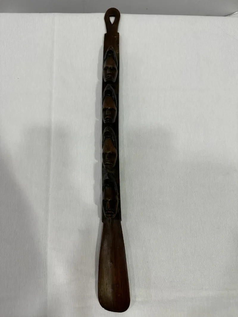 handgeschnitzter Schuhlöffel im afrikanischen Stil befindet sich in einem guten bis sehr guten Zustand. Dieser wunderschöne Schuhlöffel zeigt handgeschnitzte Köpfe, im afrikanischen Stil. Er wurde äußerst sorgfältig gefertigt. Er kann nicht nur im täglichen Gebrauch nützlich sein, sondern ist auch eine besonders ansprechende Dekorationsoption an einer Wand, wie auch auf einem hübschen Möbelstück.