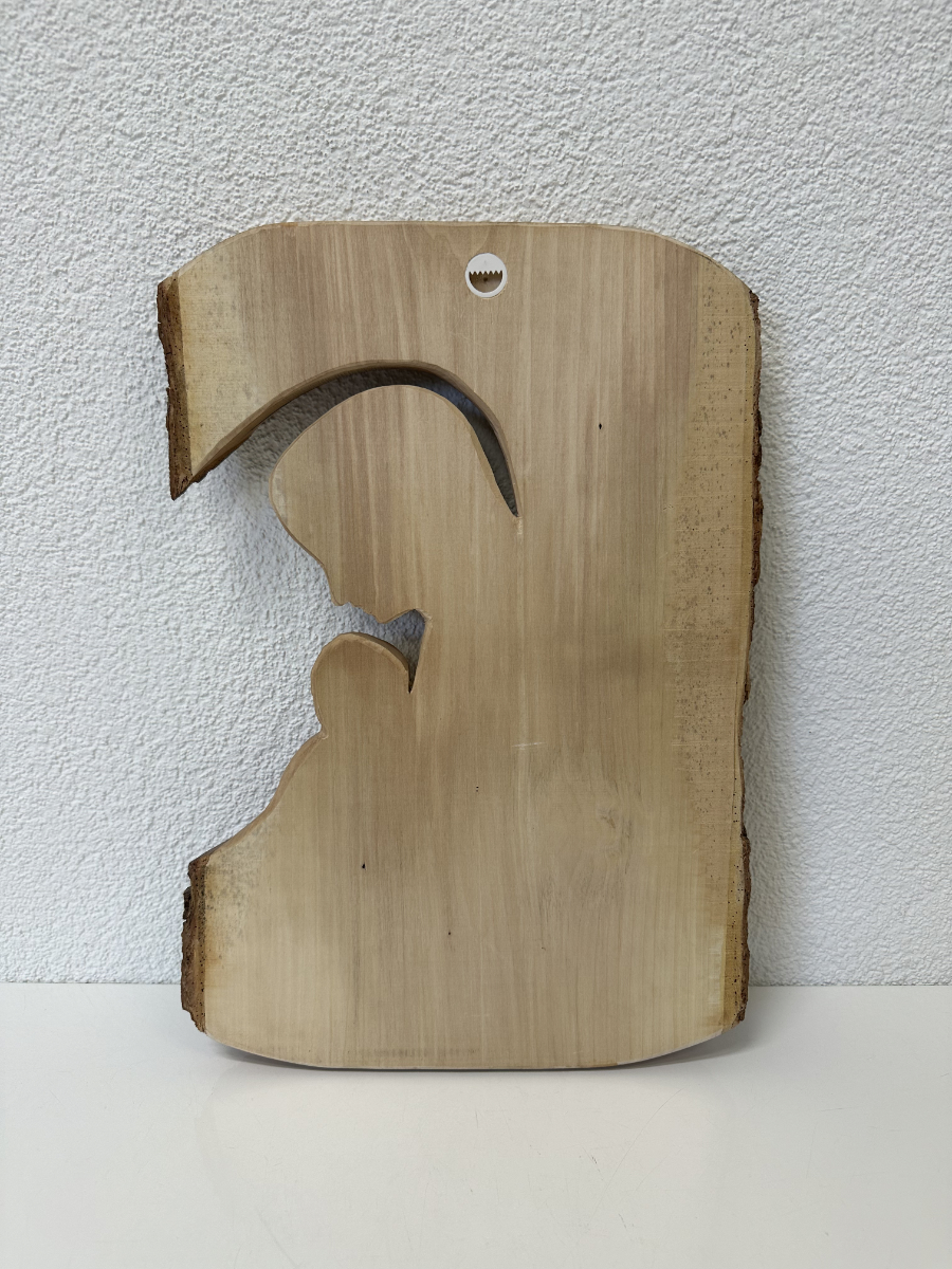 Massives Holz, naturbelassen und in freier Form belassen, bildet die Grundlage für dieses handgeschnitzte Wandrelief mit religiösem Motiv. Dargestellt ist die Madonna mit dem Jesuskind in ruhiger, inniger Haltung. Die Gesichter sind weich ausgearbeitet, die Linien bewusst reduziert und klar geführt. Besonders prägend ist der natürliche Rand mit Rinde, der die ursprüngliche Form des Holzstücks sichtbar lässt und dem Relief eine starke, ehrliche Ausstrahlung verleiht. Die Rückseite ist glatt gearbeitet und mit einer stabilen Aufhängung versehen.