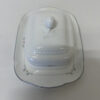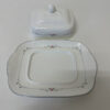 Weisses Bone China mit feiner grauer Linienbordüre und kleinen rosa Blüten, dazu ein eleganter Deckel mit erhabener Verzierung und Knauf. Die Form wirkt ruhig und sauber auf dem Tisch, und die Butter bleibt gut geschützt, egal ob am Frühstück, Brunch oder im Alltag.